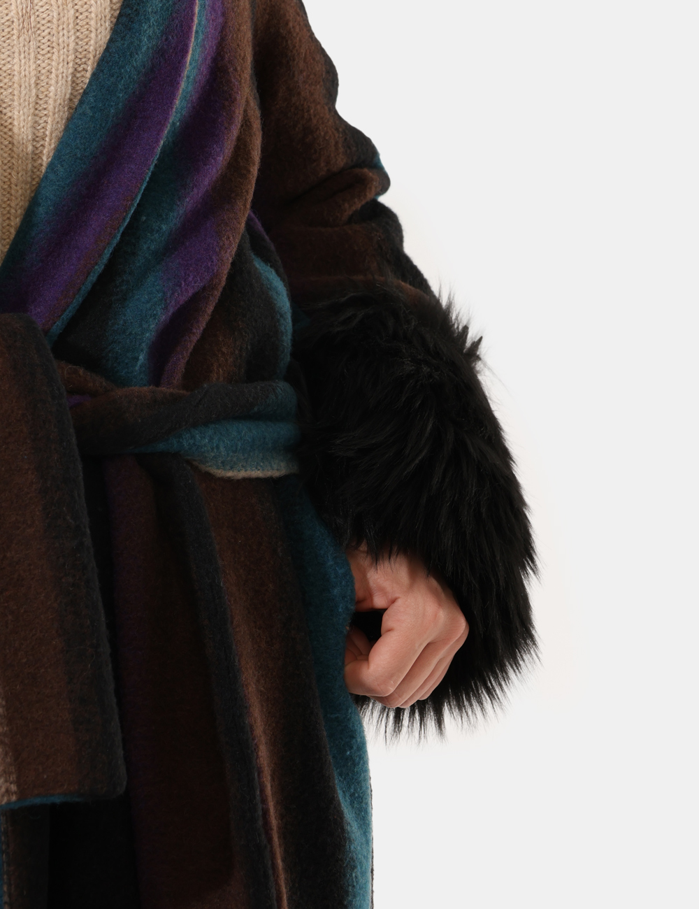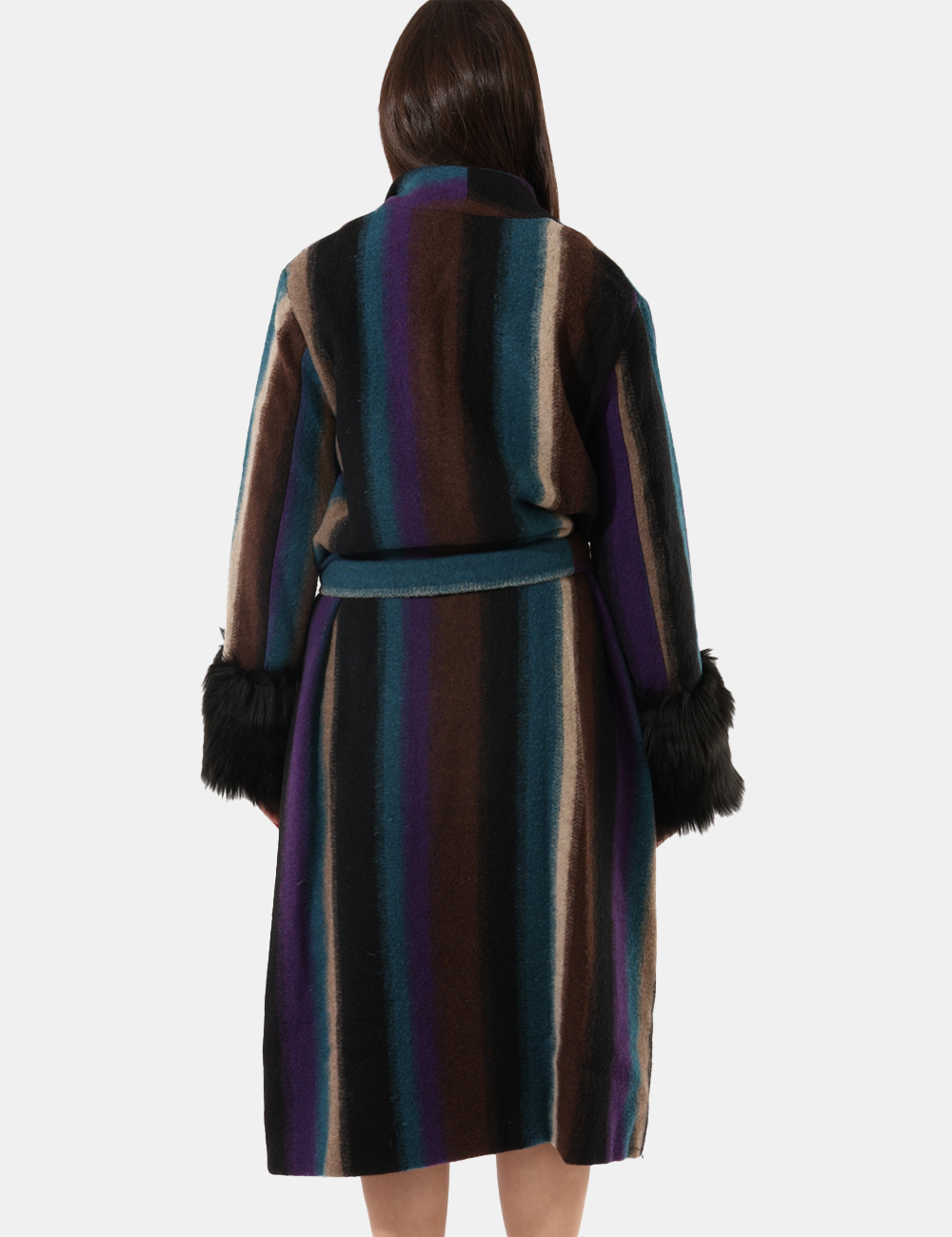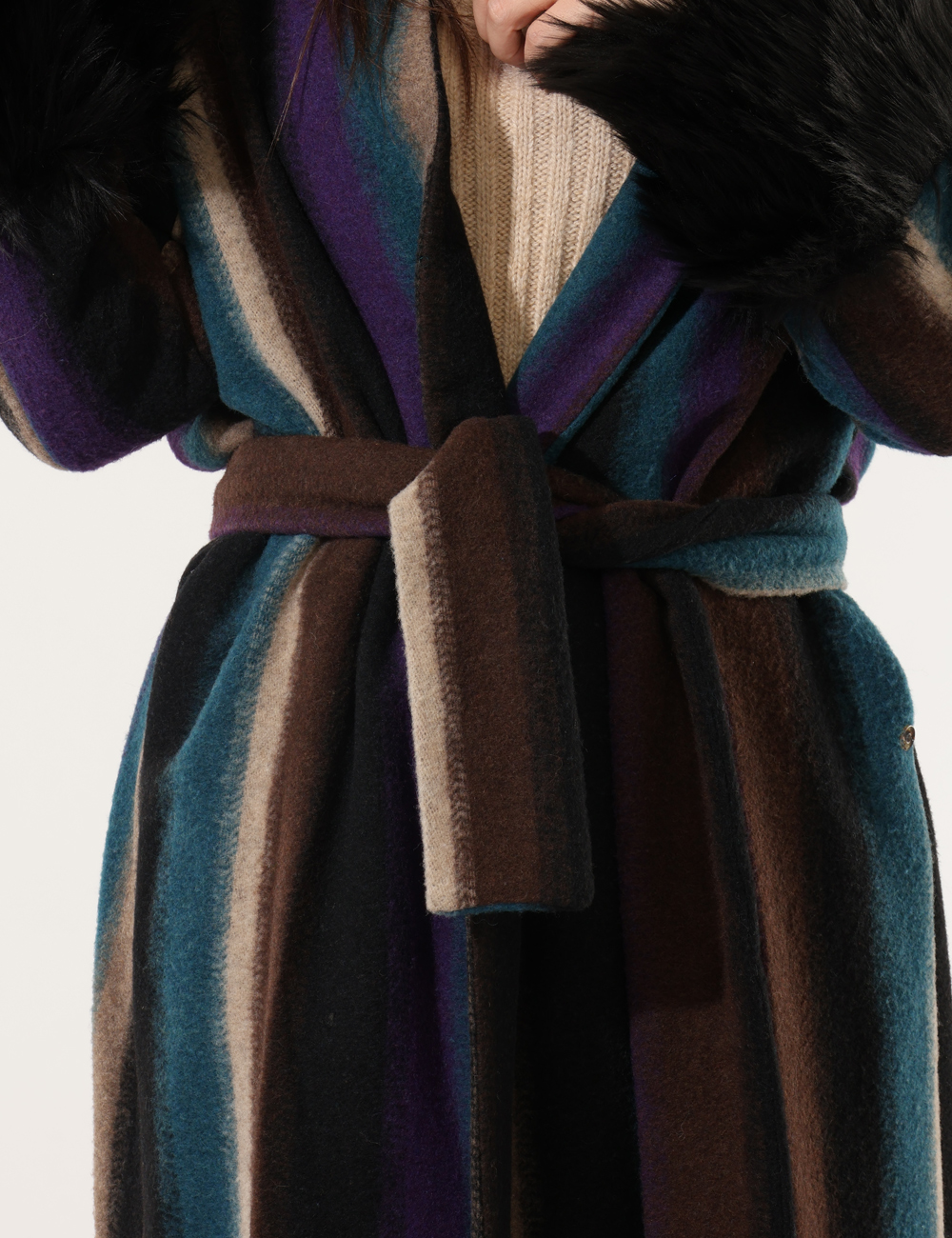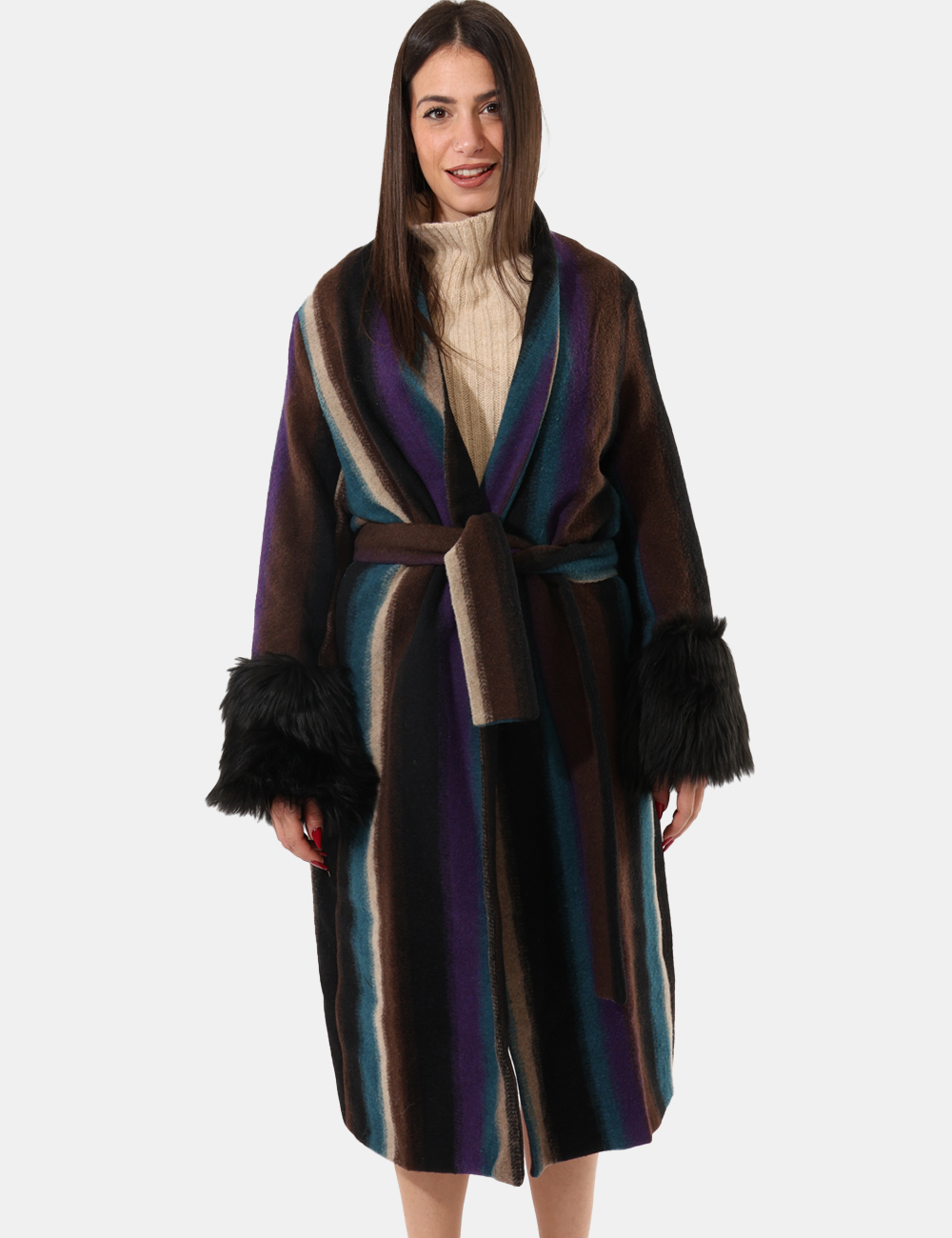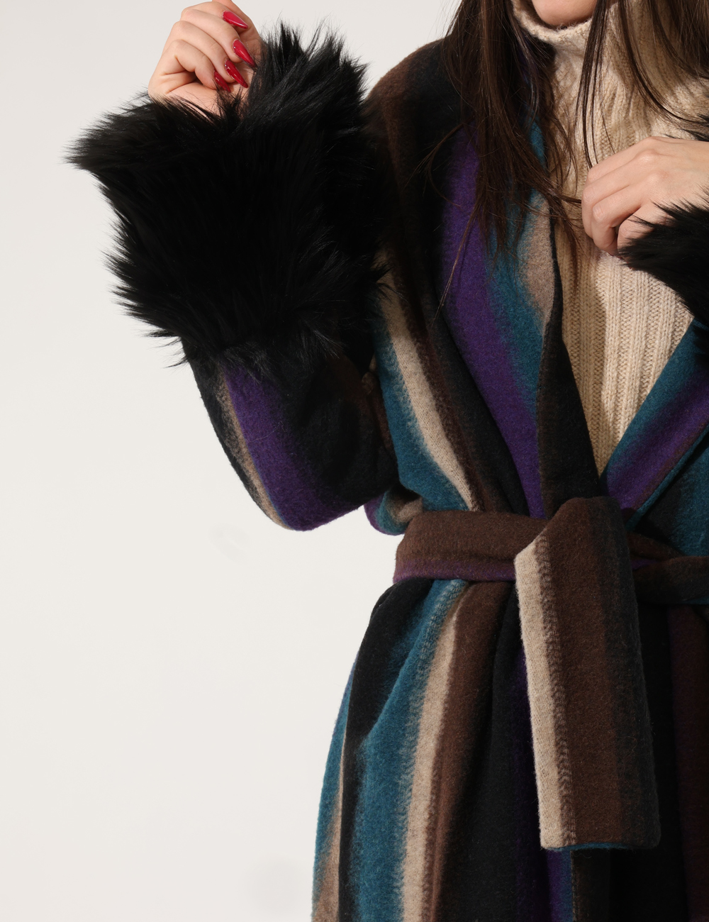 Cappotto morbido, con dettagli di ecopelliccia sulle maniche e fusciacca in vita.