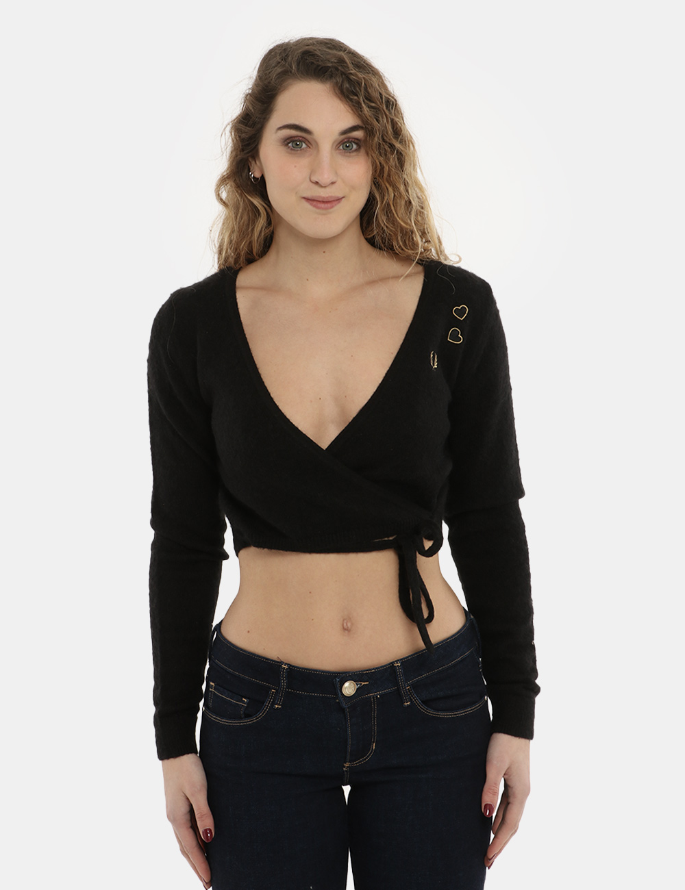 Cardigan corto total nero in misto lana con logo brand ricamato ad altezza cuore in tinta dorata. Il maglione si presenta aperto sul fronte con chiusura intrecciata ed affidata a laci in tessuto. Il capo è adatto per occasioni casual e facilmente combinabile per outfit diurni e serali. Inseriscilo nel carrello per sapere sempre coa mettere.