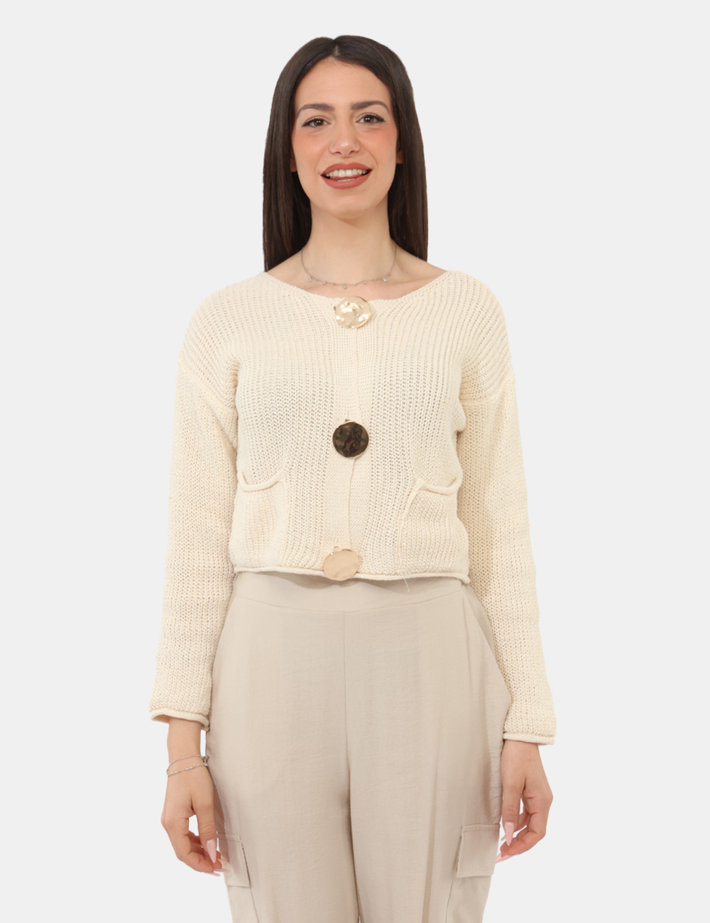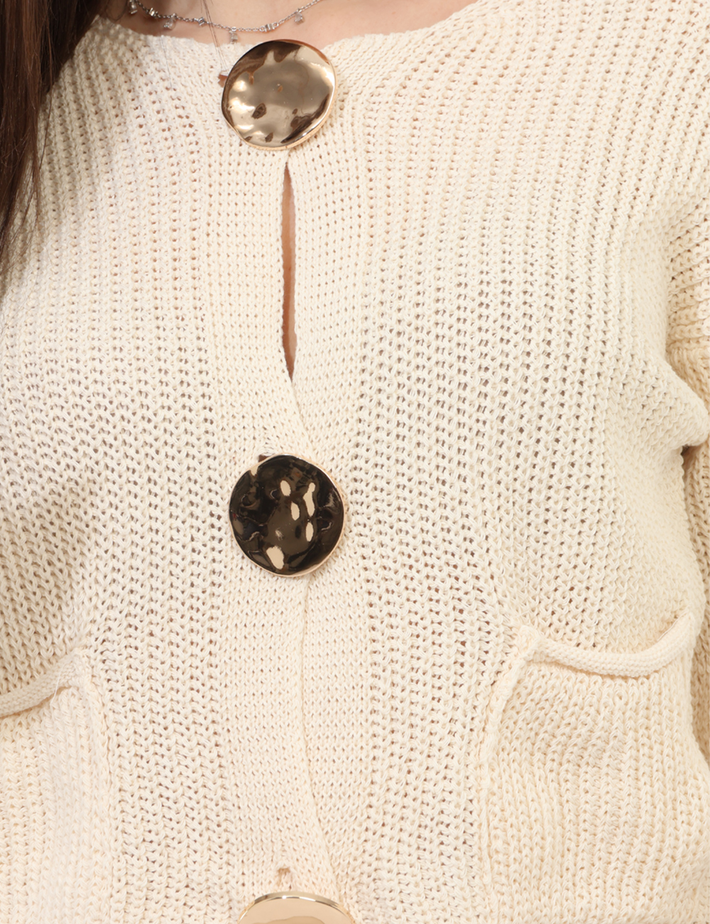 Il design è valorizzato dallo scollo tondo, dai grandi bottoni e dalla lavorazione in maglia traforata, che dona leggerezza e un effetto visivo raffinato. Questo cardigan con scollo tondo, grandi bottoni e maglia traforata è perfetto per aggiungere profondità e carattere anche agli outfit più semplici.