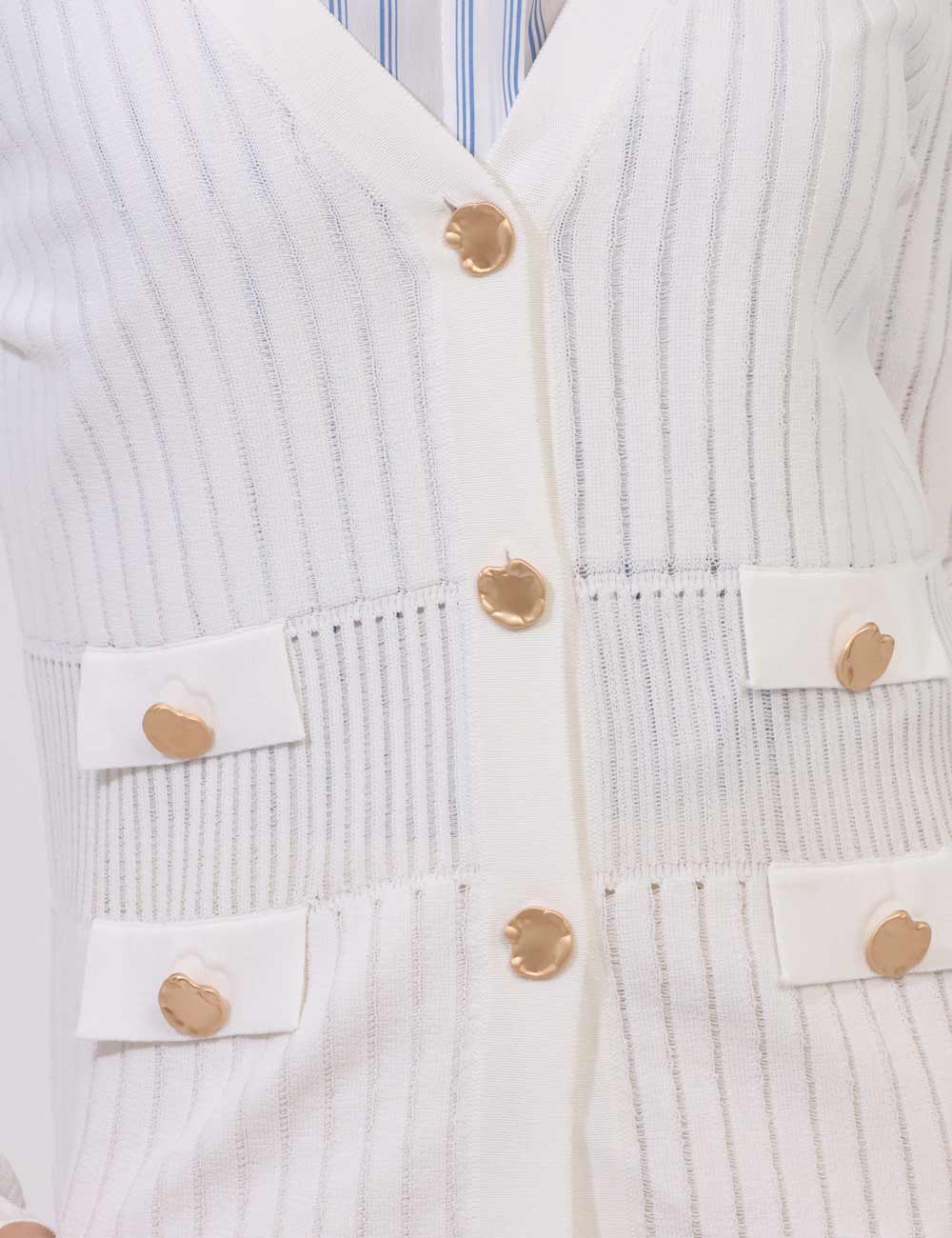 Cardigan in total bianco su trama lavorata. La vestibilità è morbida e pratica grazie a bottoni ad asola in bronzo. Il cardigan è adatto per occasioni casual e facilmente combinabile. Dona un tocco di stile ai tuoi outfit.