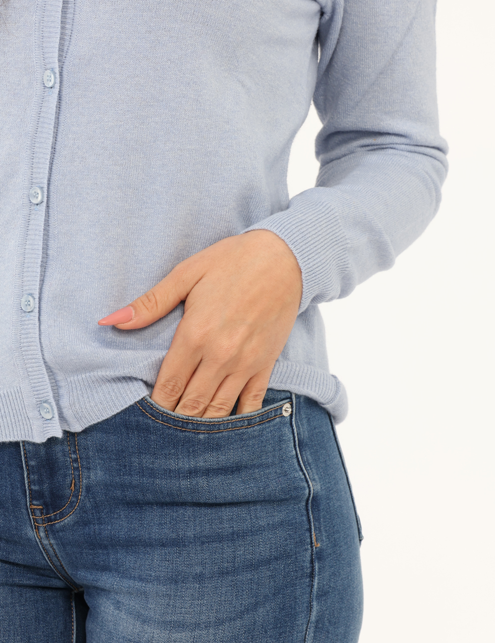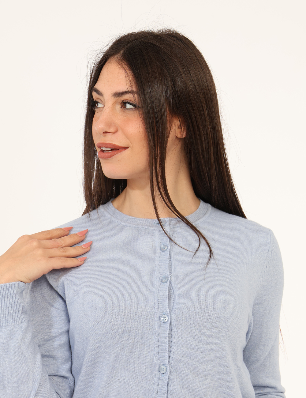 Maglione modello cardigan, in misto lana/cashmere ed in total azzurro pastello. La vestibilità è morbida e pratica grazie a bottoni ad asola in tinta. Il maglione è adatto per occasioni casual e facilmente combinabile. Troppo carino per poterne fare a meno.