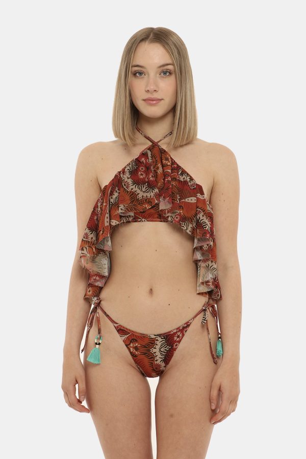 Costume modello intero in fantasia bordeaux e marrone con volant in tinta. La vestibilità è morbida e regolabile grazie a laccetti in tinta. Il costume è adatto per l’estate e per la spiaggia. Troppo fashion per non innamorartene a prima vista