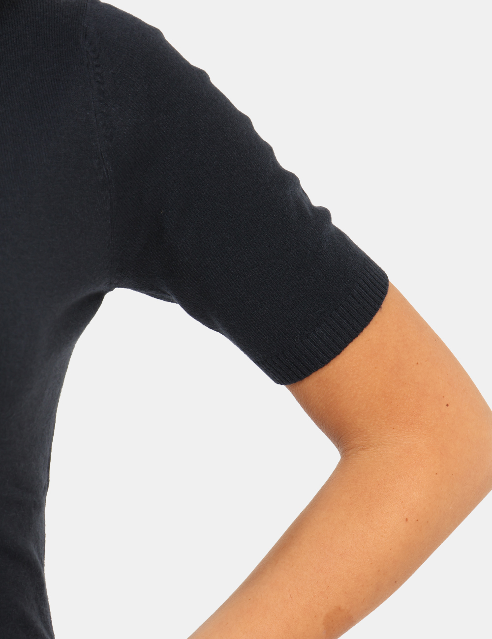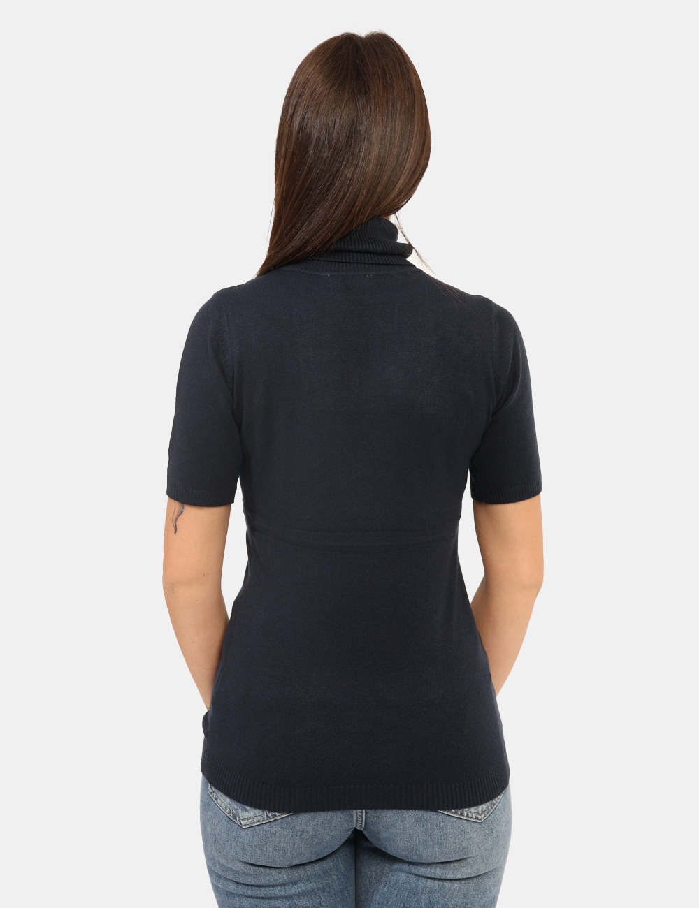 Maglioncino dolcevita total blu navy a maniche corte. La vestibilità è morbida e regolare. Il maglione dolcevita è adatto per occasioni casual e facilmente combinabile. Praticità e stile in un solo capo.