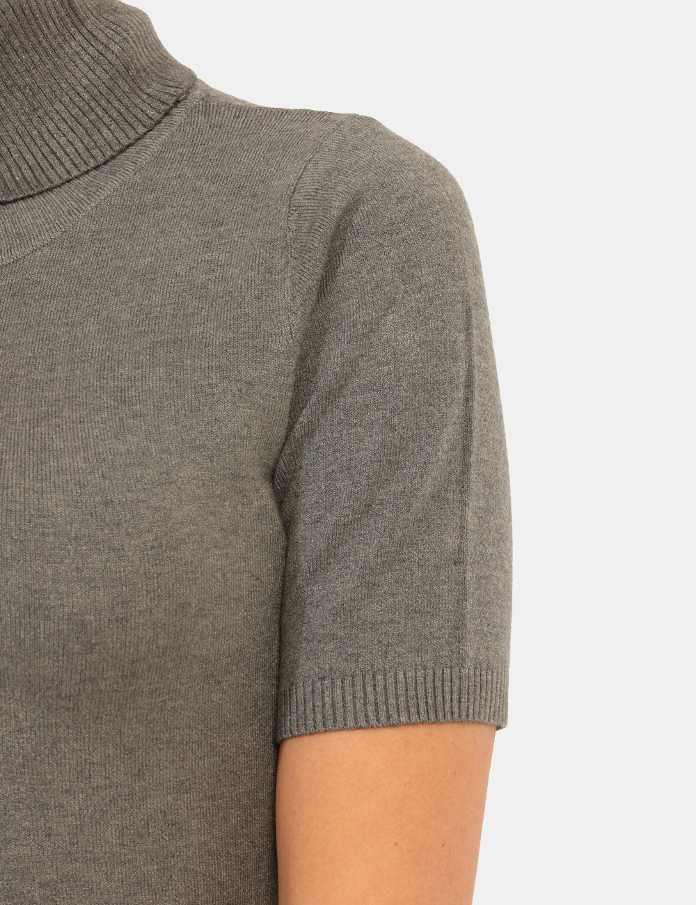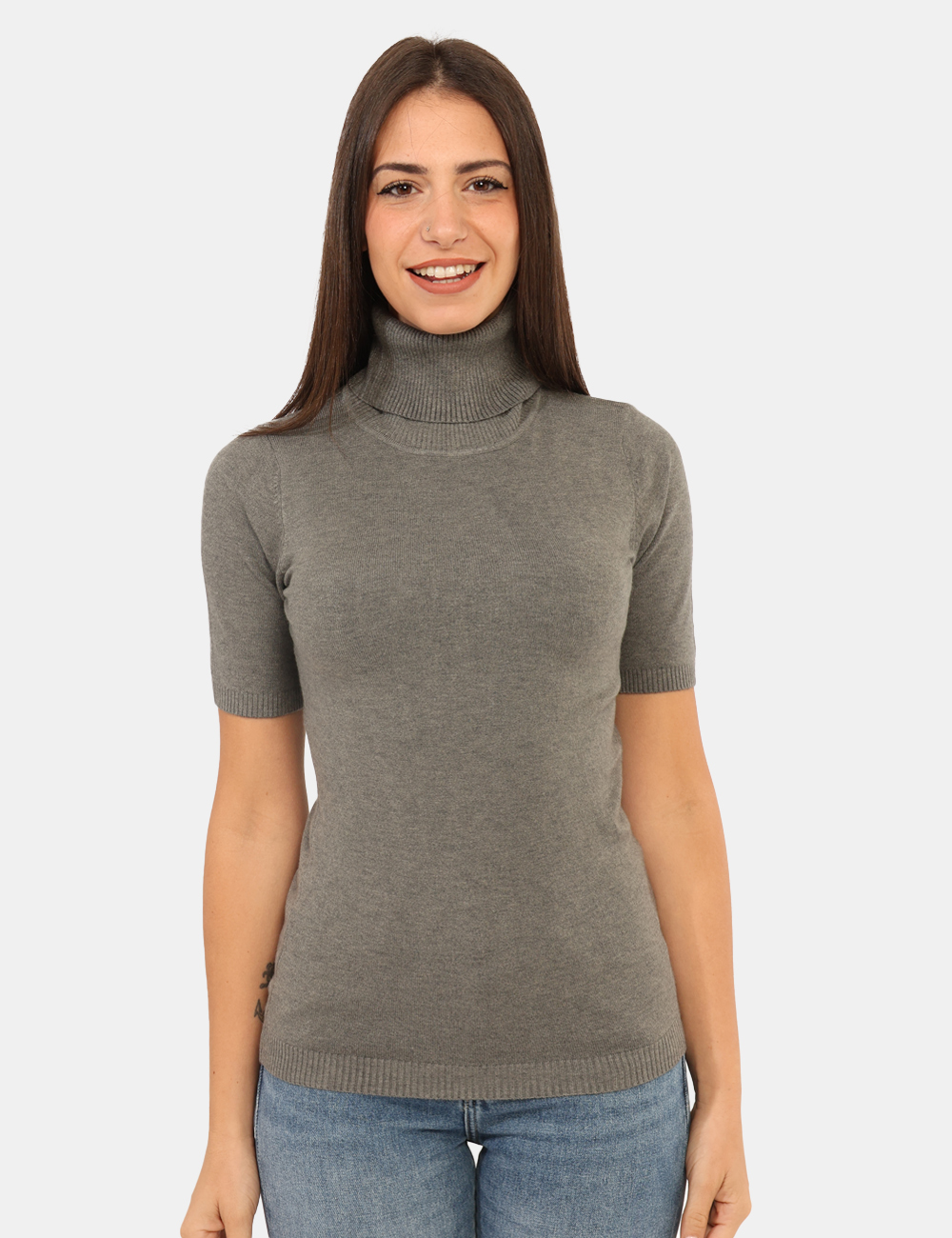 Maglioncino dolcevita total grigio antracite a maniche corte. La vestibilità è morbida e regolare. Il maglione dolcevita è adatto per occasioni casual e facilmente combinabile. Praticità e stile in un solo capo.