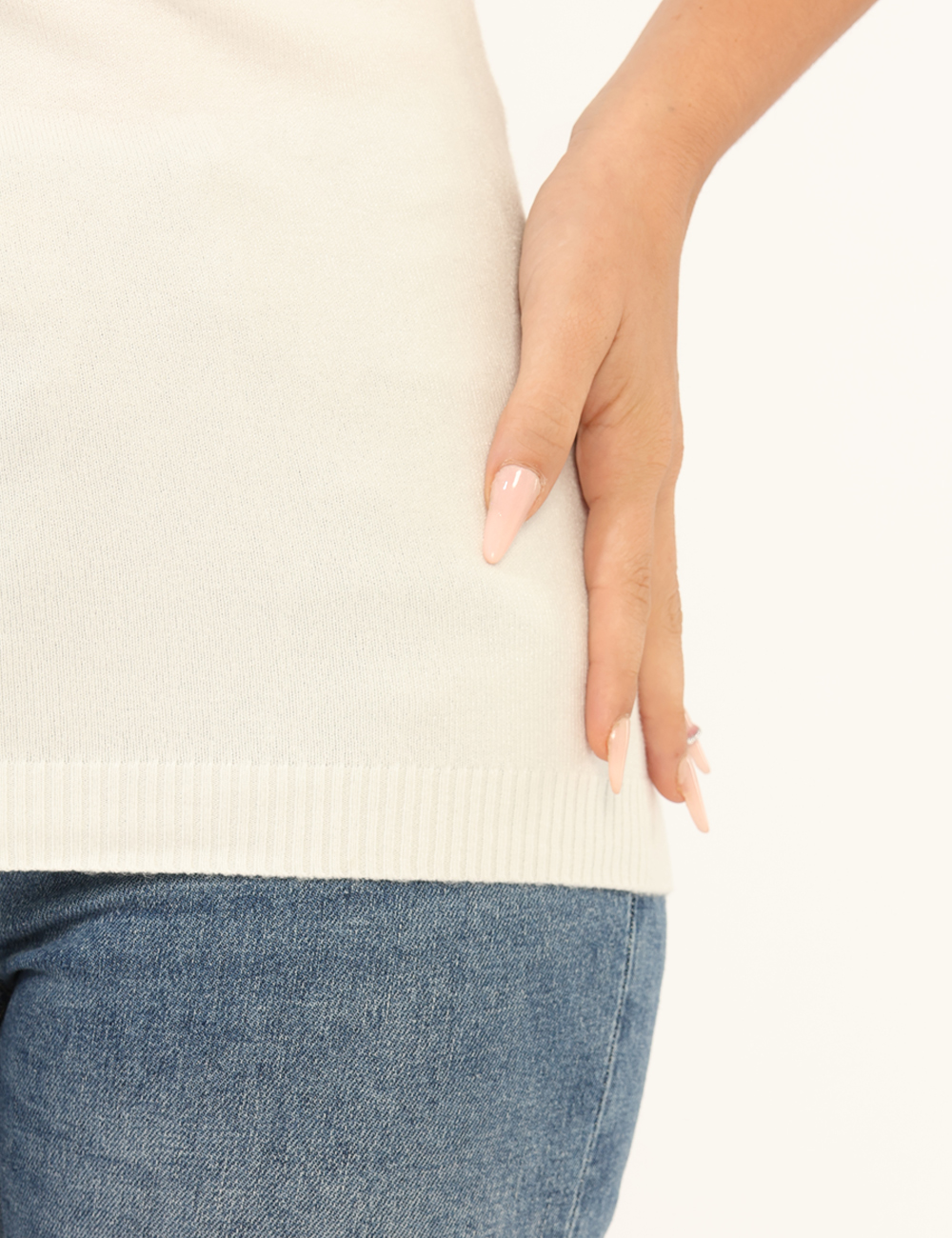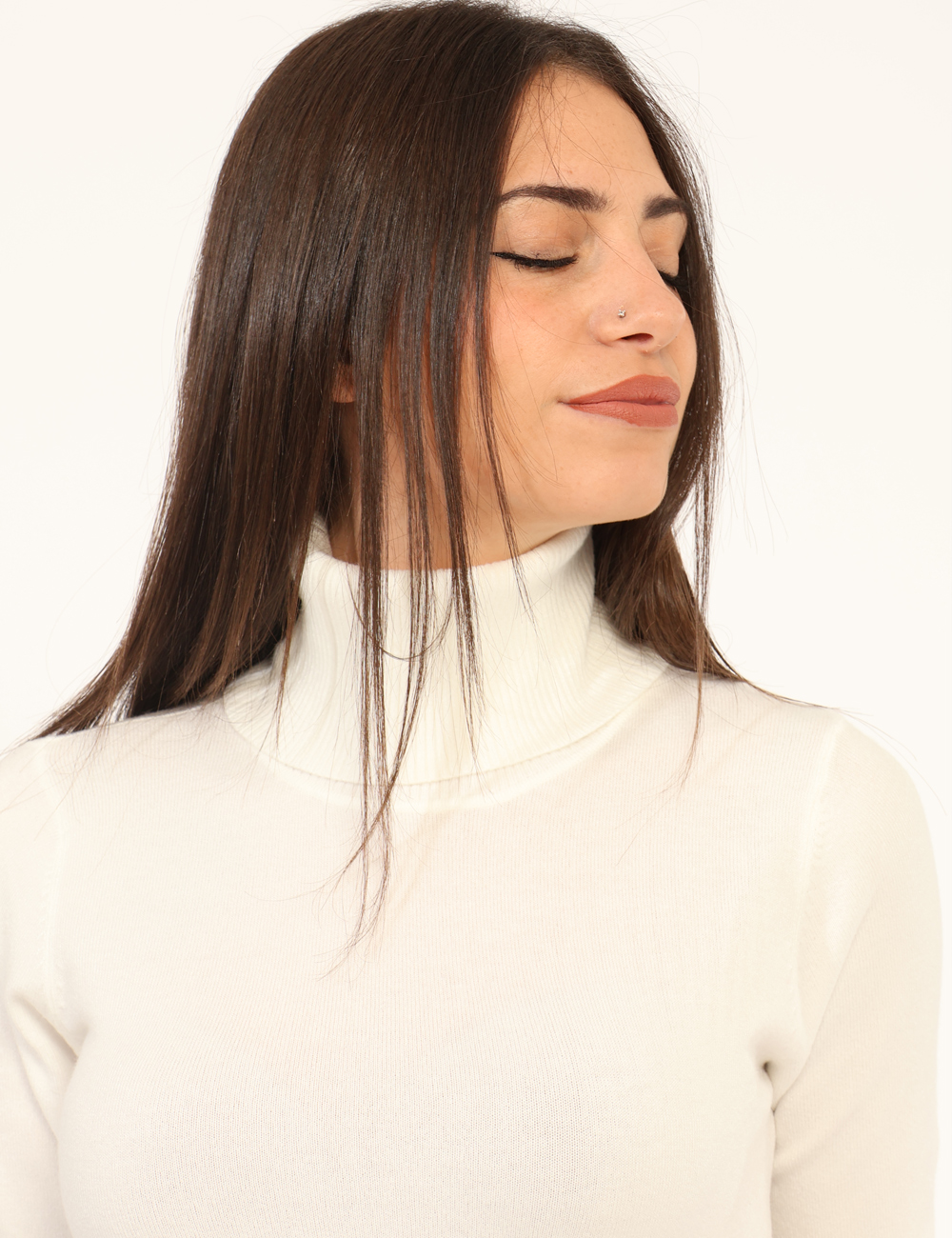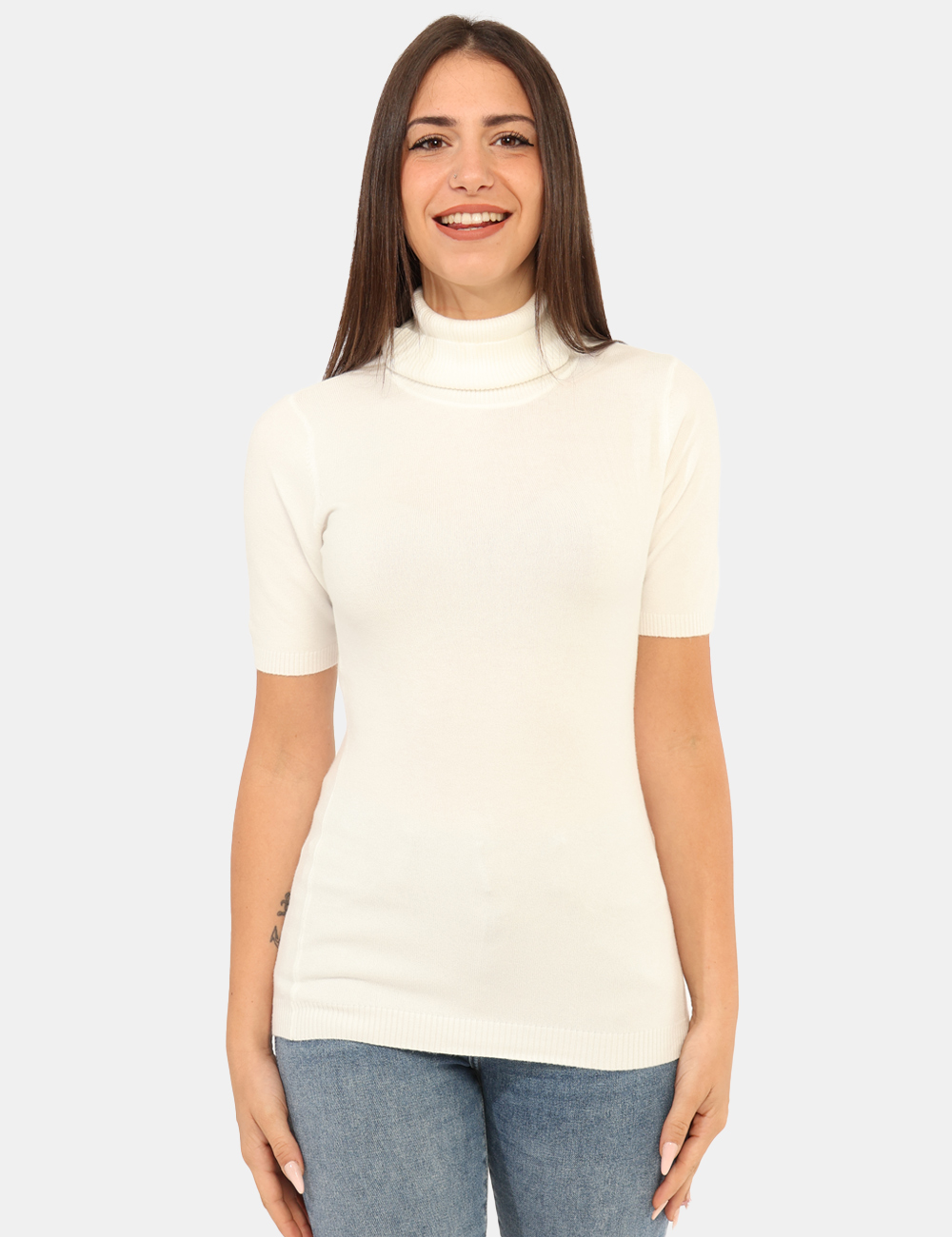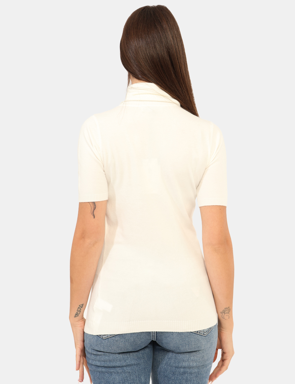 Maglioncino dolcevita total bianco panna a maniche corte. La vestibilità è morbida e regolare. Il maglione dolcevita è adatto per occasioni casual e facilmente combinabile. Praticità e stile in un solo capo.