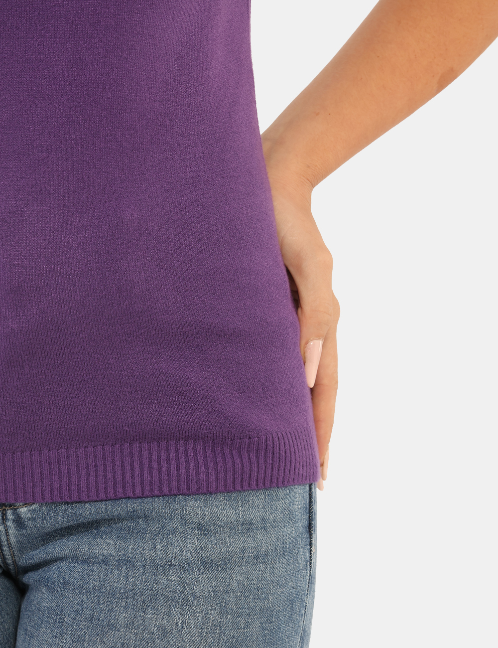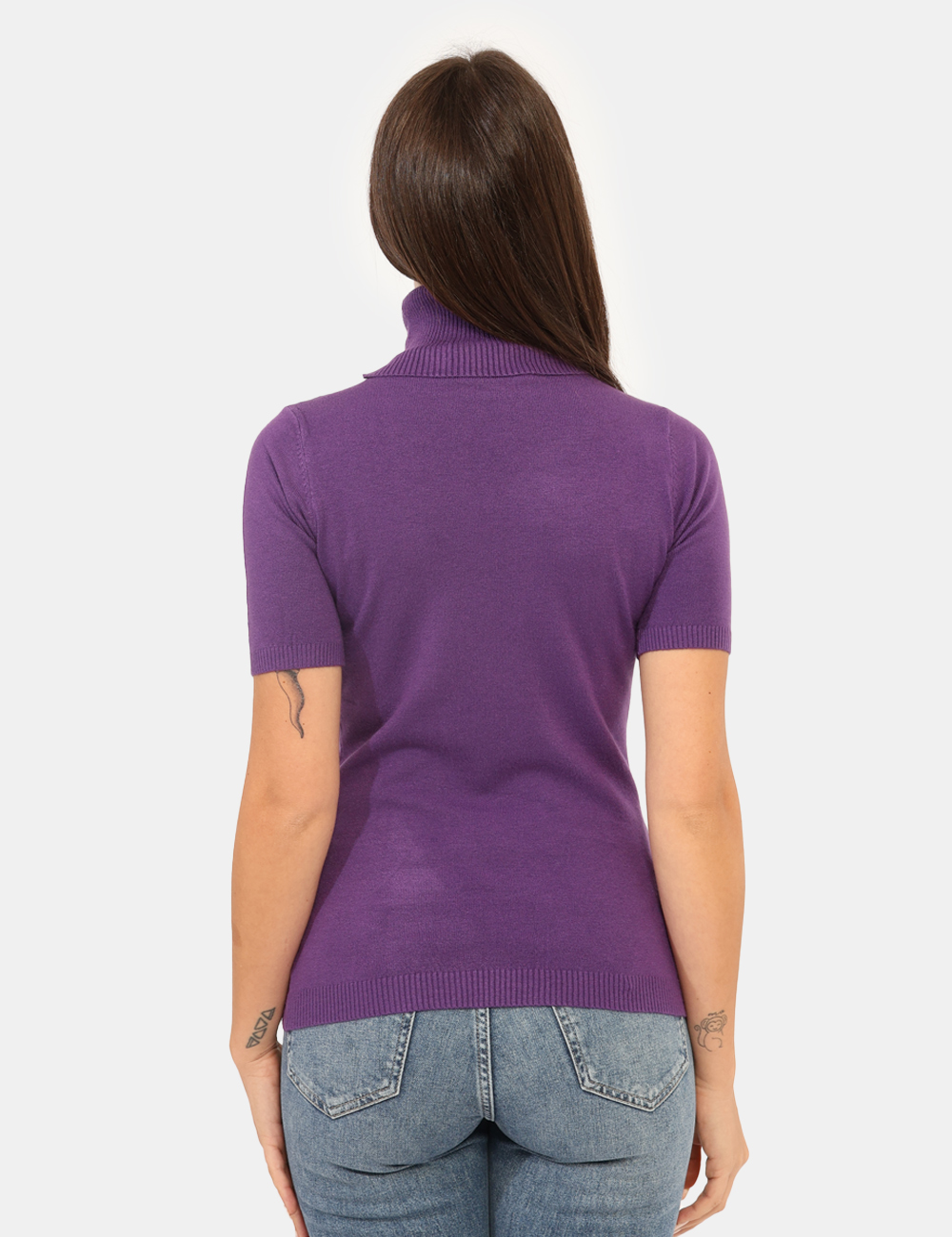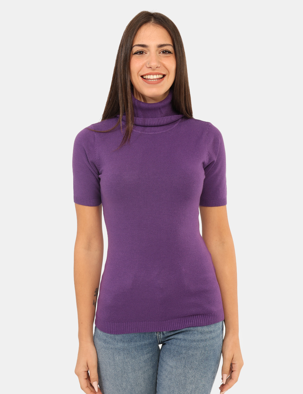 Maglioncino dolcevita total viola a maniche corte. La vestibilità è morbida e regolare. Il maglione dolcevita è adatto per occasioni casual e facilmente combinabile. Praticità e stile in un solo capo.