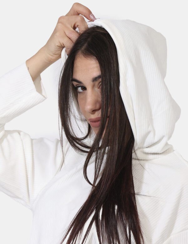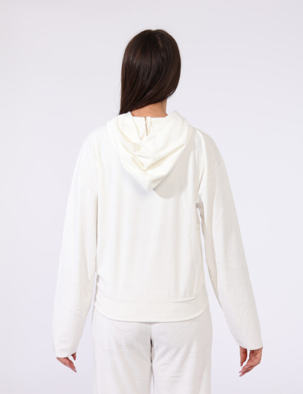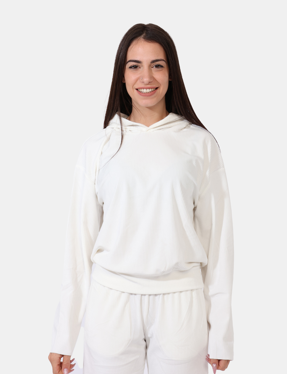 Felpa leggera con cappuccio in total bianco a costine. La vestibilità è morbida e regolare. La felpa è adatta per occasioni casual e facilmente combinabile.Troppo comoda per poterne fare a meno.