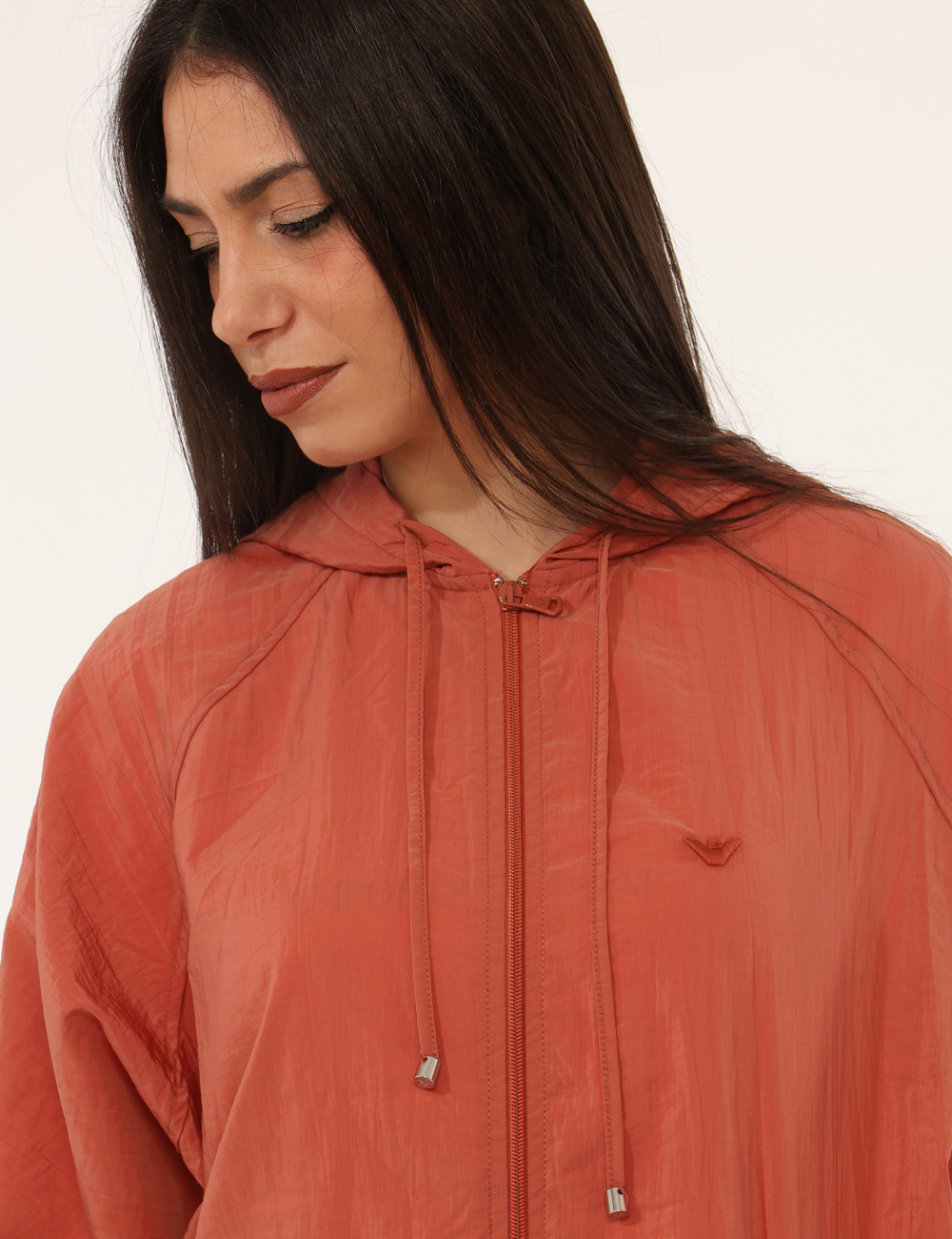 Realizzata in 100% poliamide, è leggera, resistente e perfetta da indossare nelle giornate più fresche della bella stagione. Il tessuto tecnico dona comfort e libertà di movimento, mentre la vestibilità regolare assicura una linea naturale e rilassata. La modella è alta 165 cm e indossa la taglia S/M. Si tratta di un pezzo unico di campionario, selezionato per offrirti esclusività e autenticità firmata Armani.