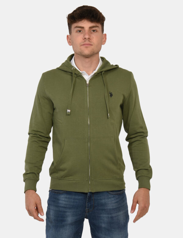 Felpa con cappuccio in total verde militare. Presenti tasche a toppa con taglio trasversale. La vestibilità è morbida e pratica grazie a zip sul fronte. La felpa è adatta per occasioni casual e facilmente combinabile. Praticità e stile in un solo capo.
