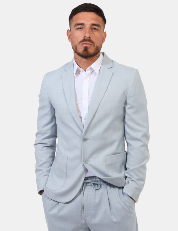Giacca elegante in total azzurro cielo con tasche a toppa. La vestibilità è morbida e pratica grazie a bottoni ad asola in tinta. La giacca è adatta per occasioni casual/raffinate. Indossala per essere impeccabile
