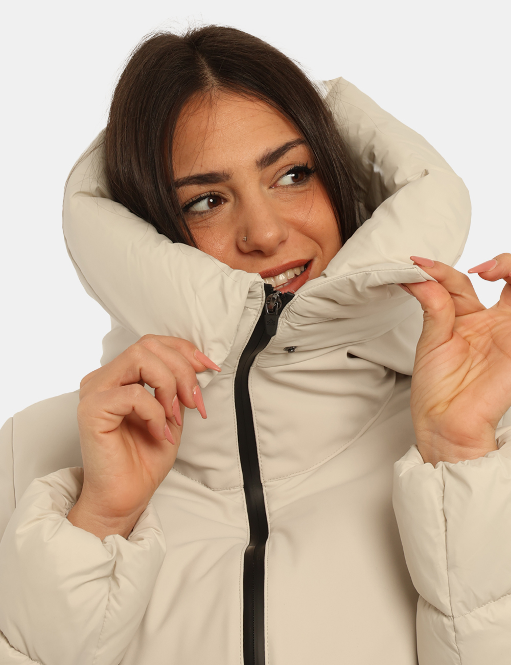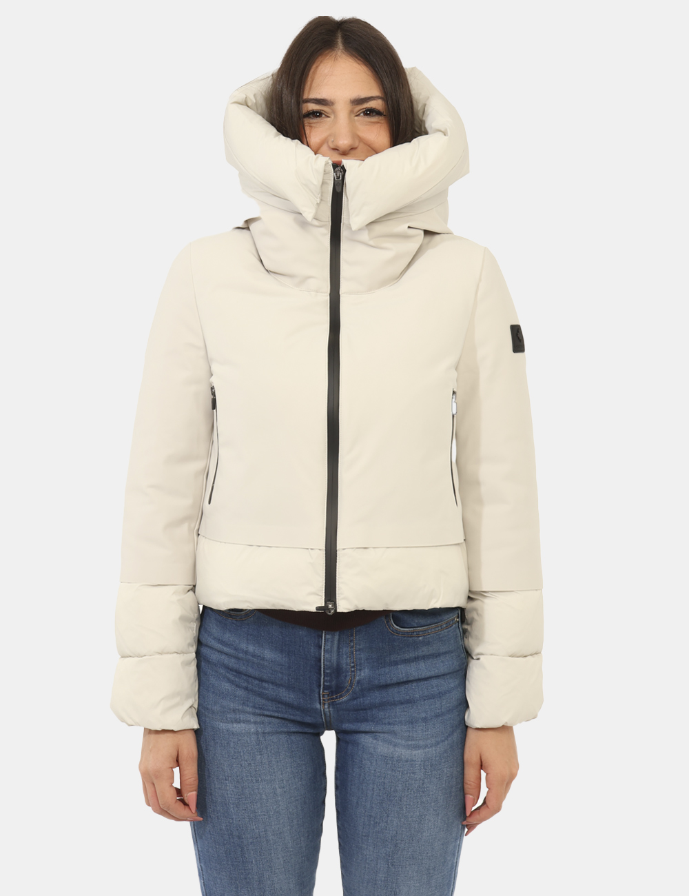 Giaccone corto con cappuccio non removibile in total bianco ghiaccio, con interno in simil piumino imbottito. Presenti tasche a taglio trasversale con chiusura a zip e dettagli in tinta. La vestibilità è morbida e pratica grazie a zip sul fronte. Il giaccone è adatto per occasioni casual, facilmente combinabile, ideale per l’inverno. Troppo comodo per poterne fare a meno.