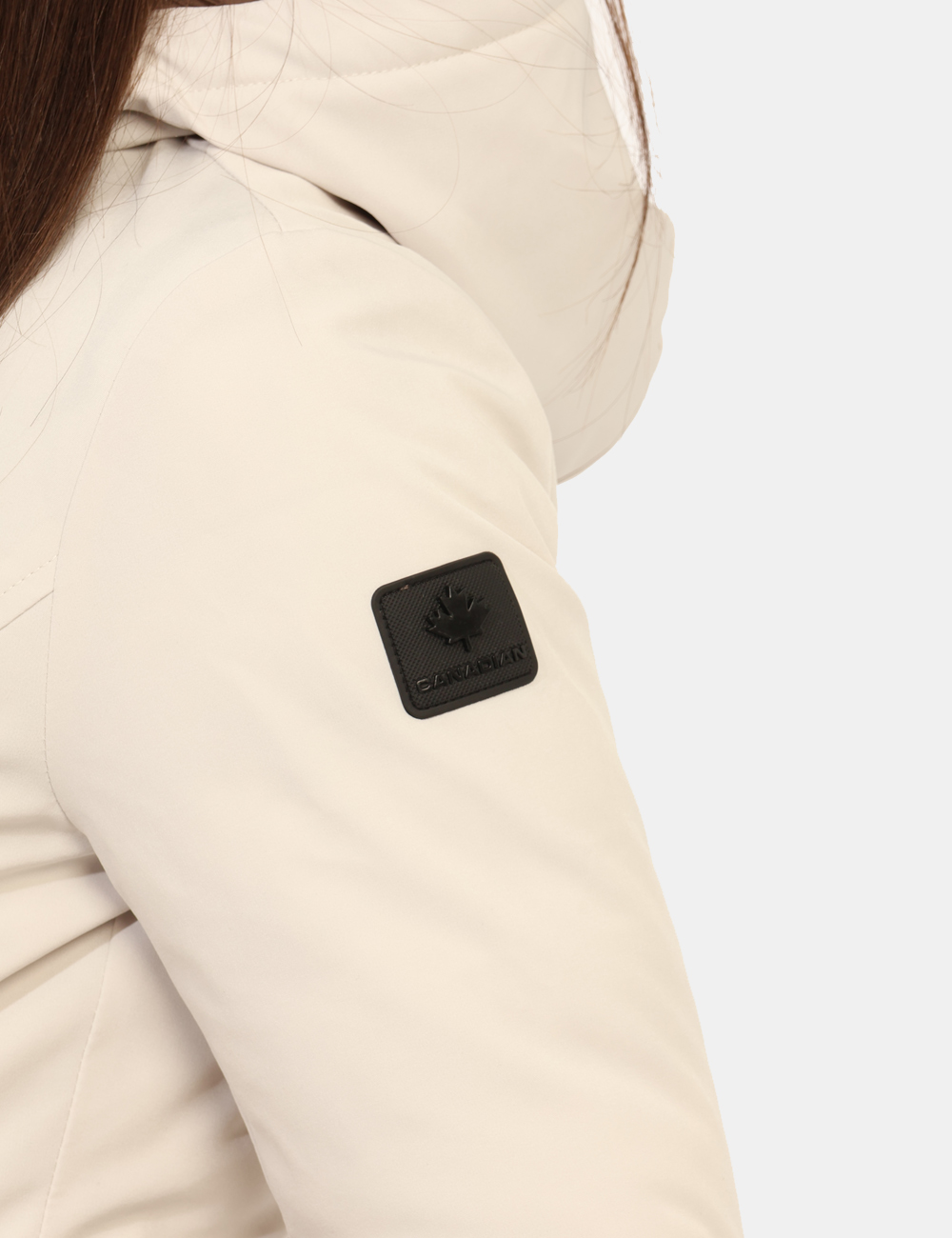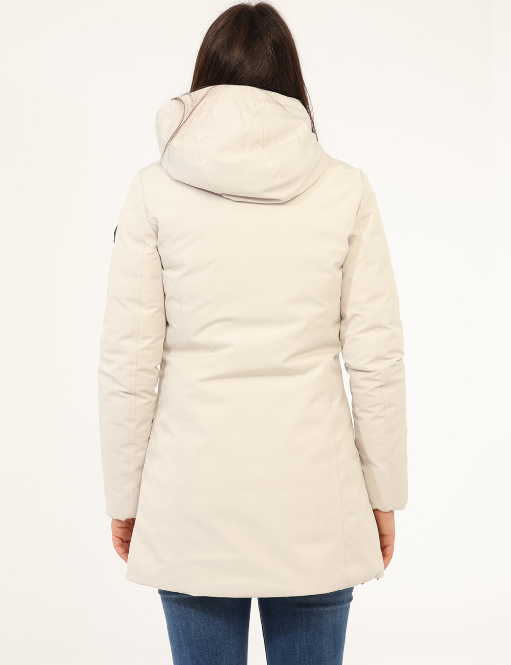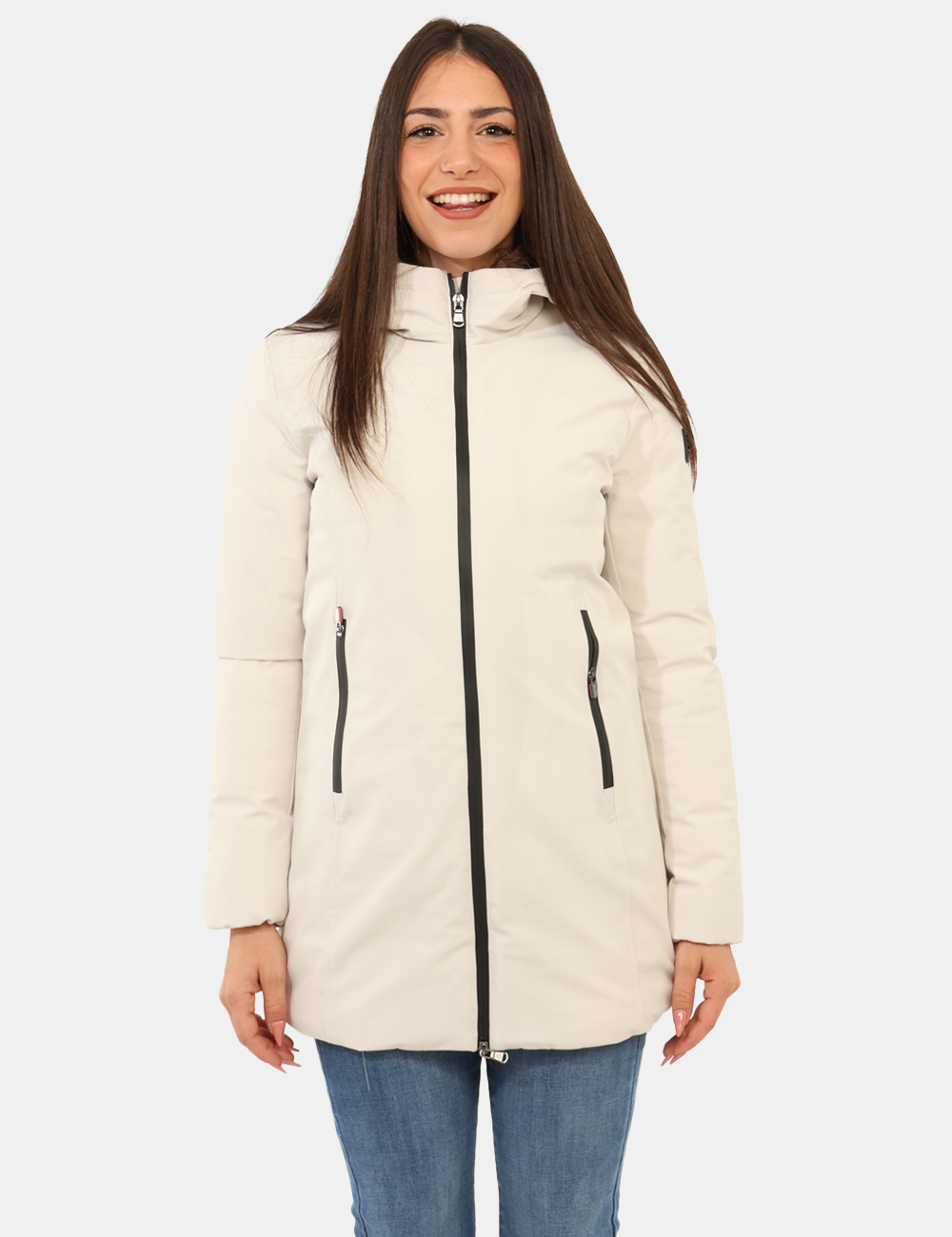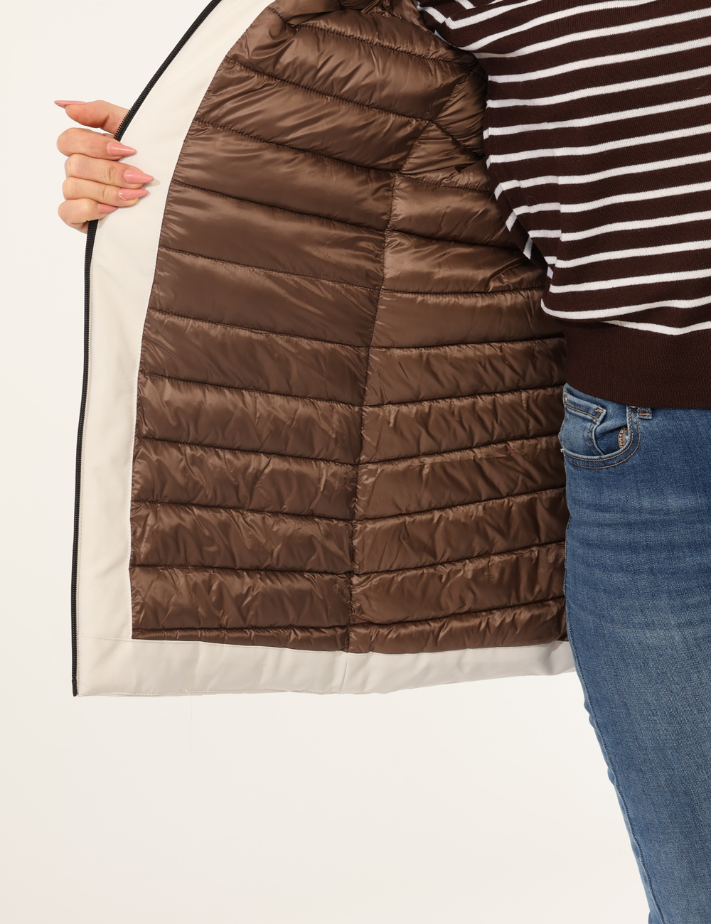 Giaccone lungo con cappuccio non removibile in total bianco panna, con interno in simil piumino marrone. Presenti tasche a taglio trasversale con chiusura a zip e dettagli neri. La vestibilità è morbida e pratica grazie a zip sul fronte. Il giaccone è adatto per occasioni casual, facilmente combinabile, ideale per l’inverno. Troppo comodo per poterne fare a meno.