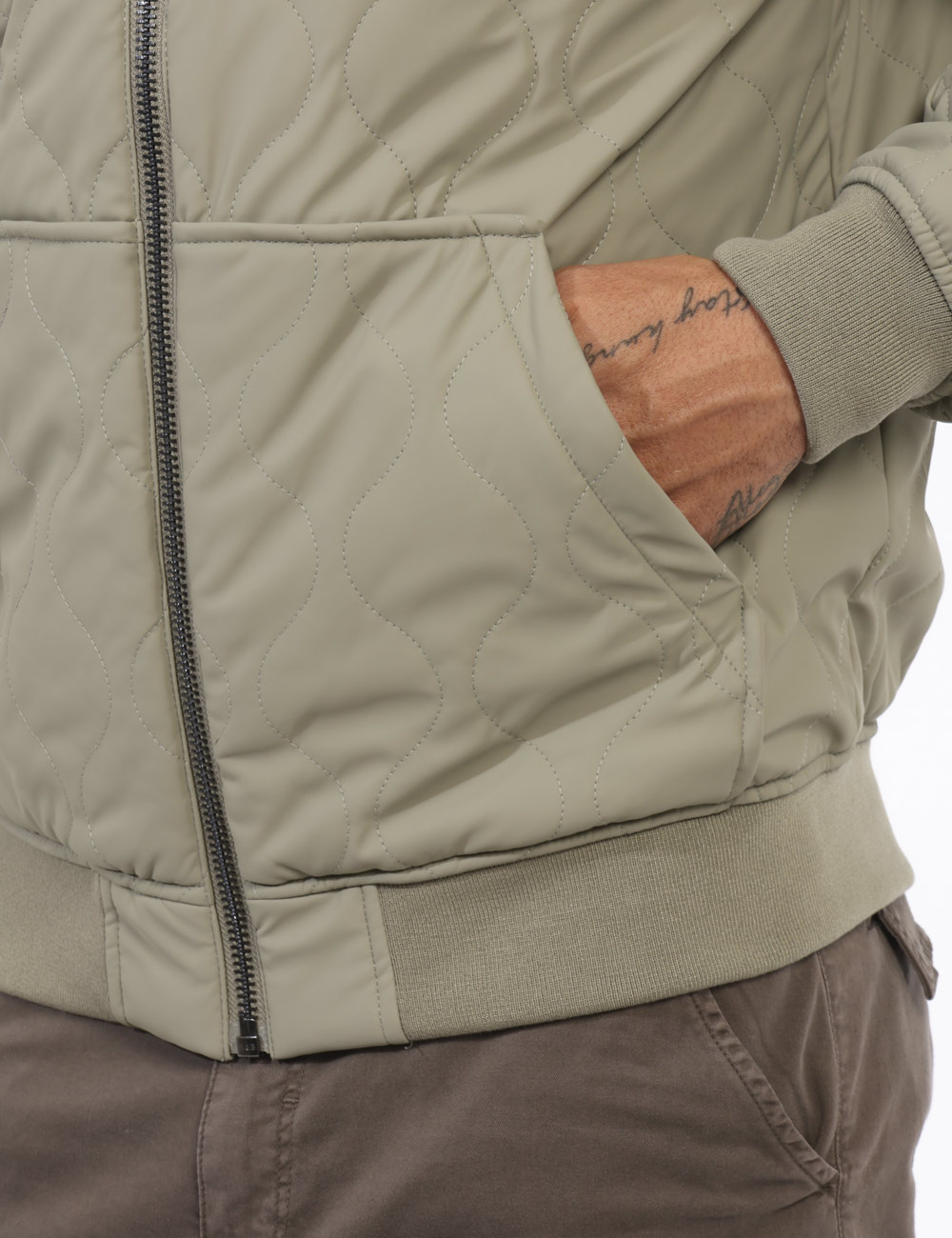 Giubbino trapuntato in total verde chiaro con cuciture evidenziate. Presenti tasche a toppa con taglio trasversale più polsini e girocollo in tessuto elasticato. La vestibilità è morbida e pratica grazie a zip sul fronte. Il giubbino è adatto per occasioni casual e facilmente combinabile. Il tuo prossimo articolo nei prodotti salvati.