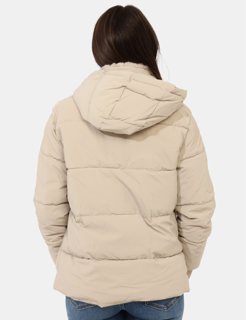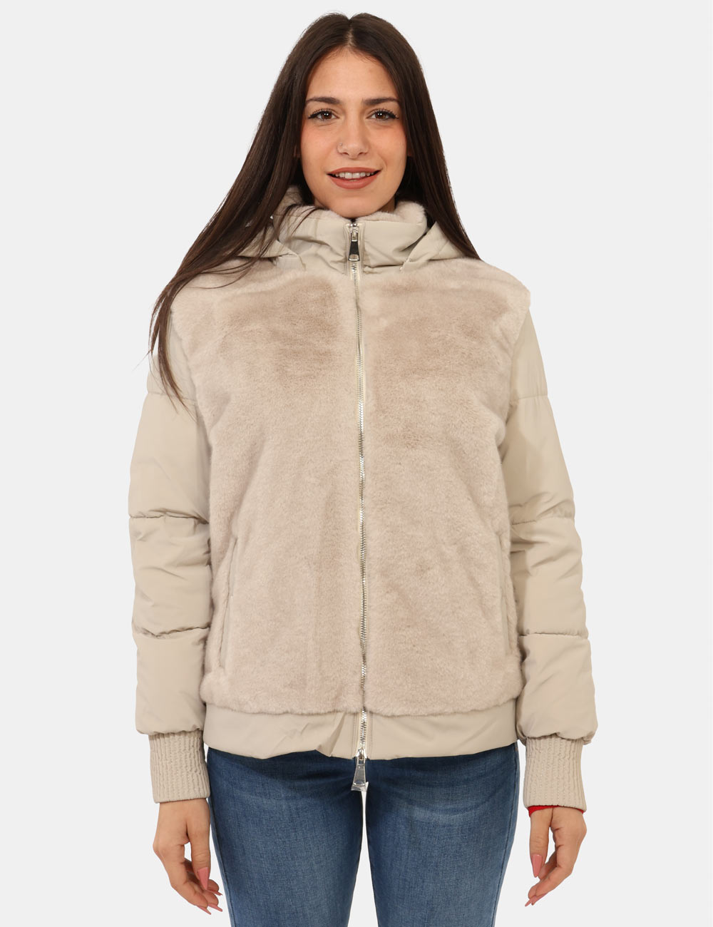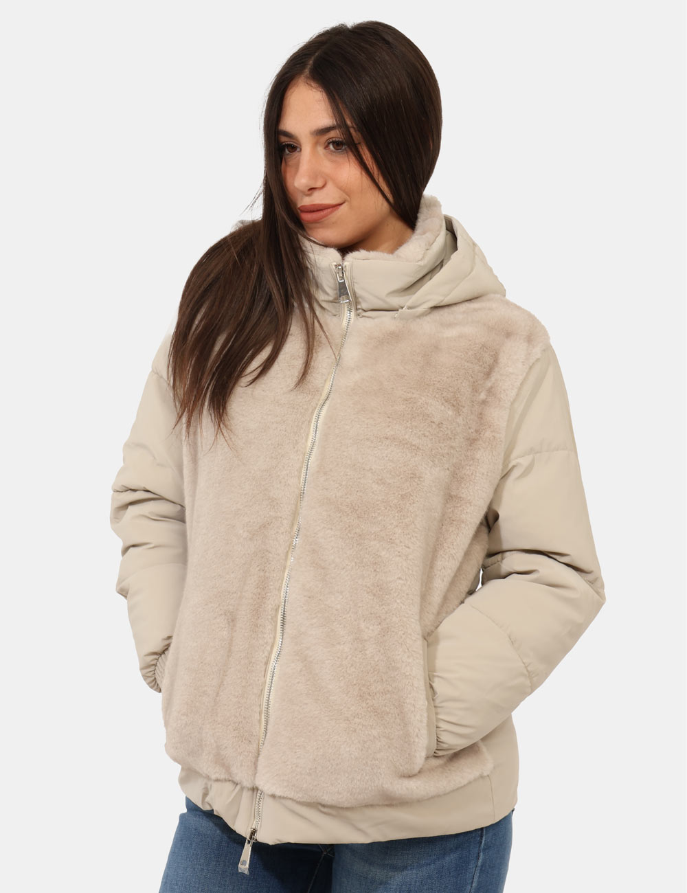 Giacca con cappuccio removibile, in total beige con parziale fake fur in tinta coordinata. Presenti tasche a taglio con chiusura a bottone. La giacca è adatta per occasioni casual e ideale per l’inverno. Indossala per spiccare con stile.