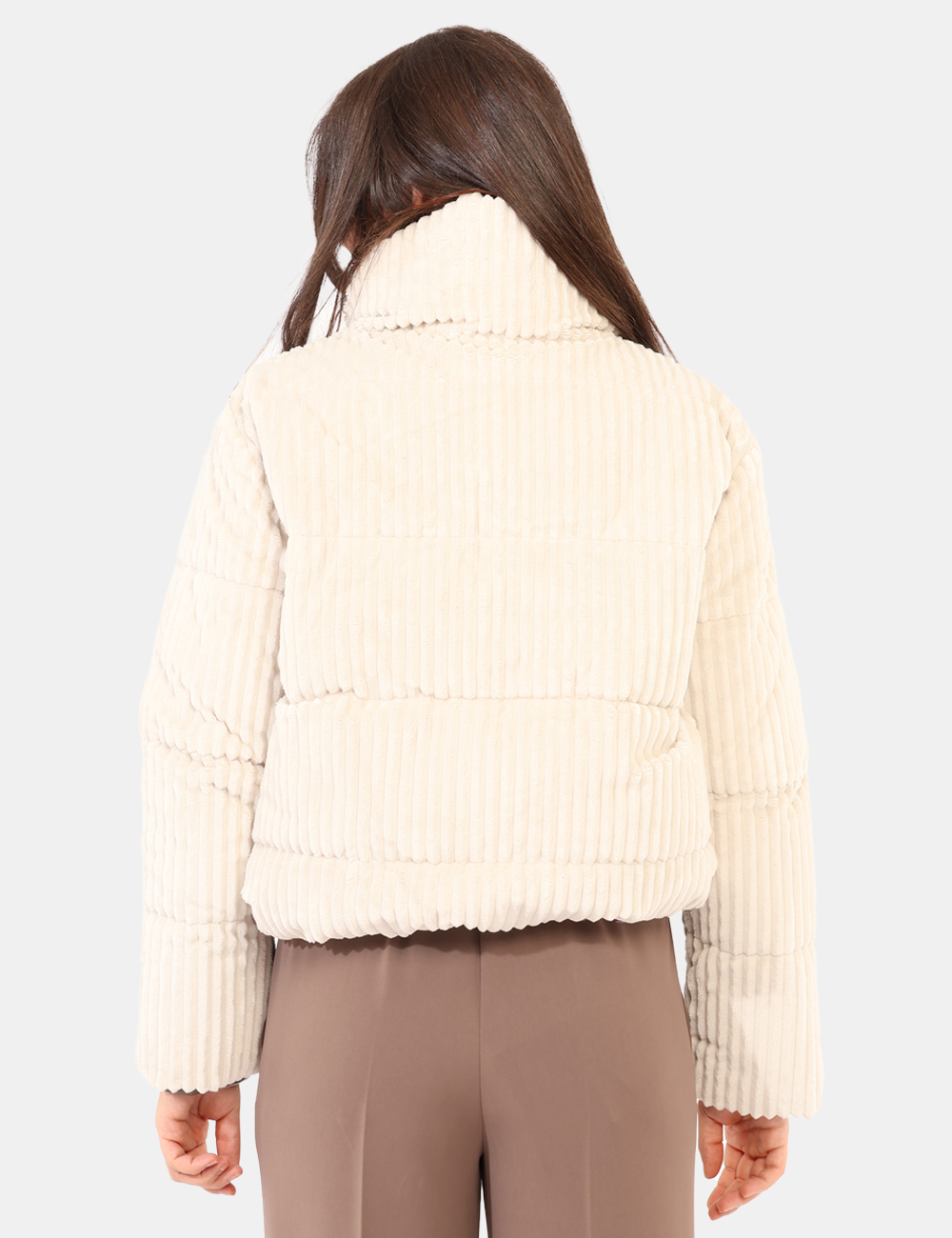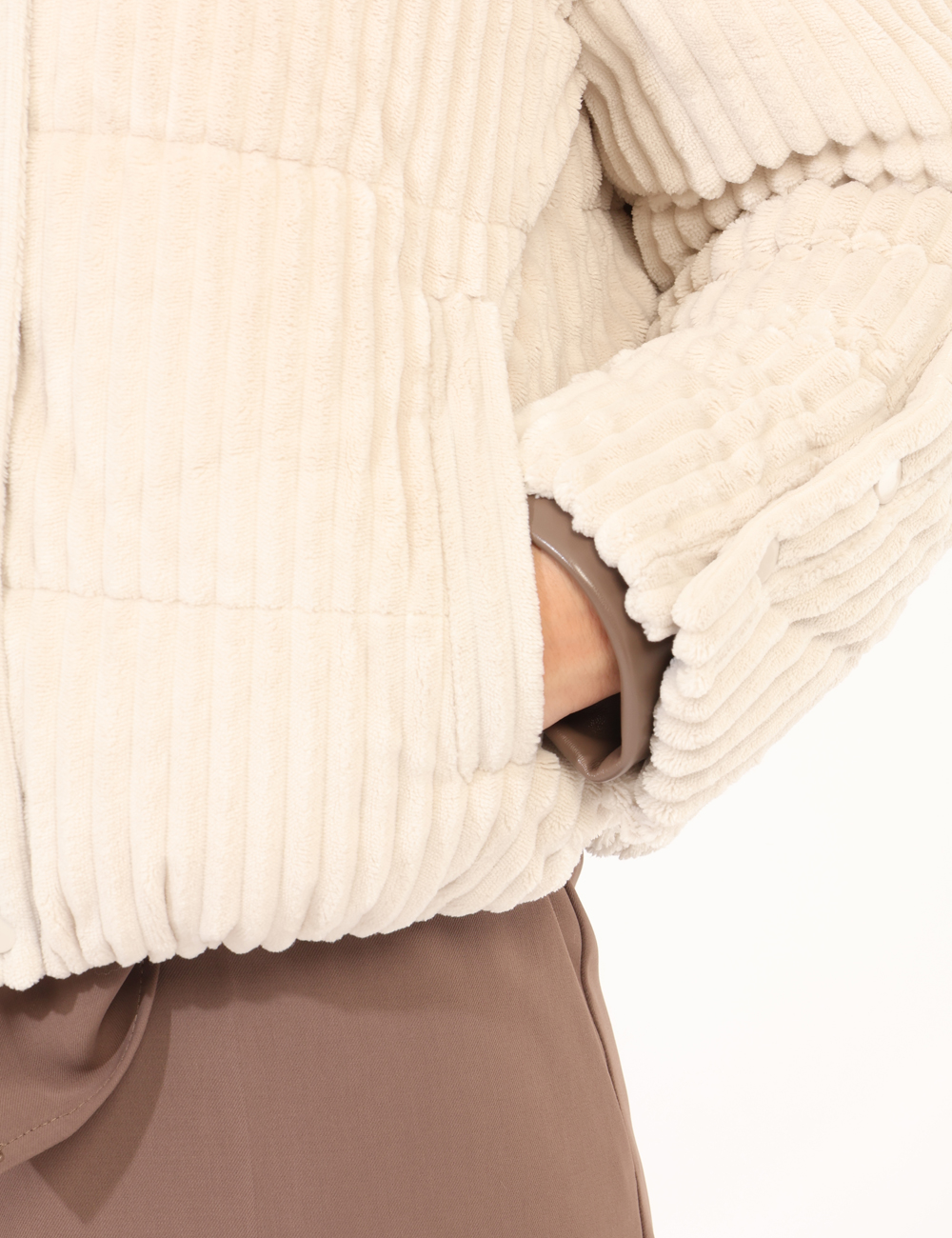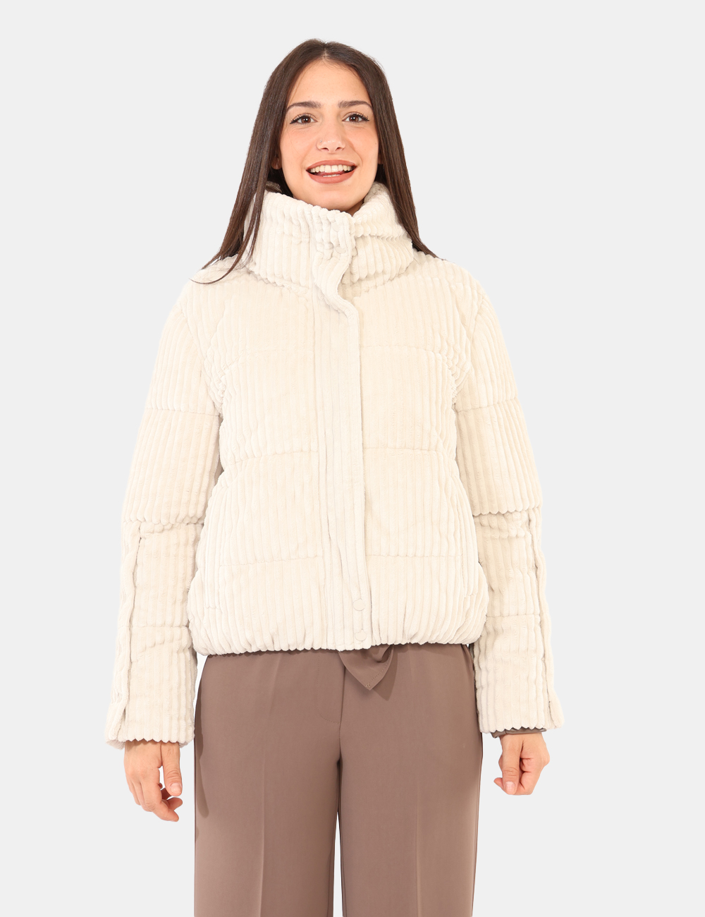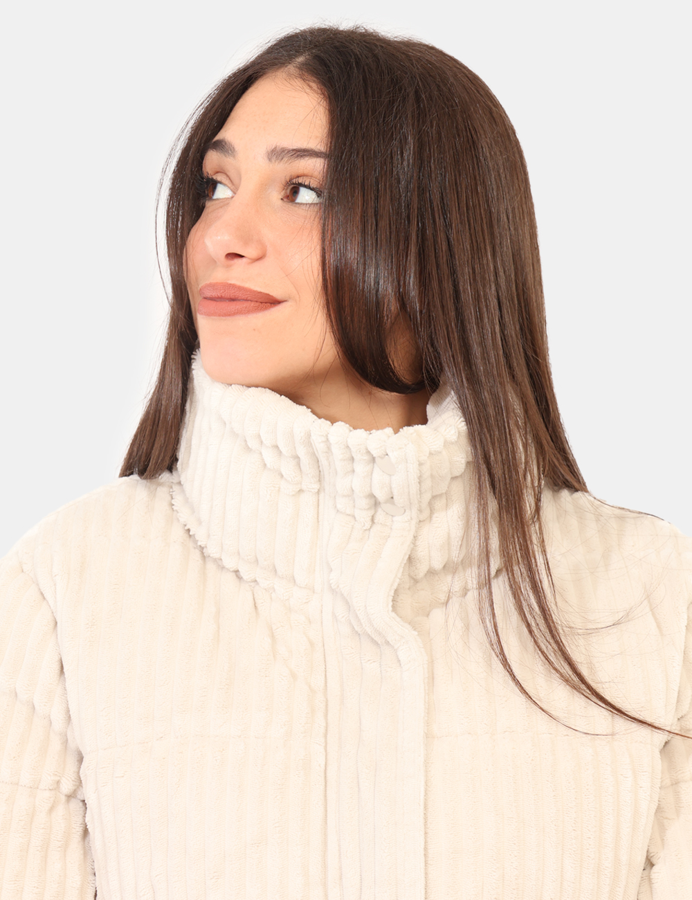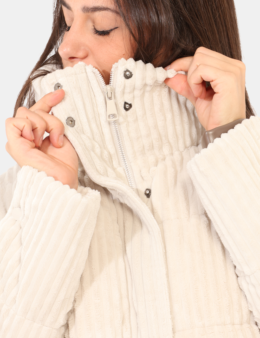 Giacca simil cappotto, in total bianco avorio con tessuto lavorato. Presenti tasche a taglio trasversale. La vestibilità è morbida e pratica grazie a zip più bottoni automatici. La giacca è adatta per occasioni casual e ideale per l’inverno. Pratciità e stile in un solo capo.