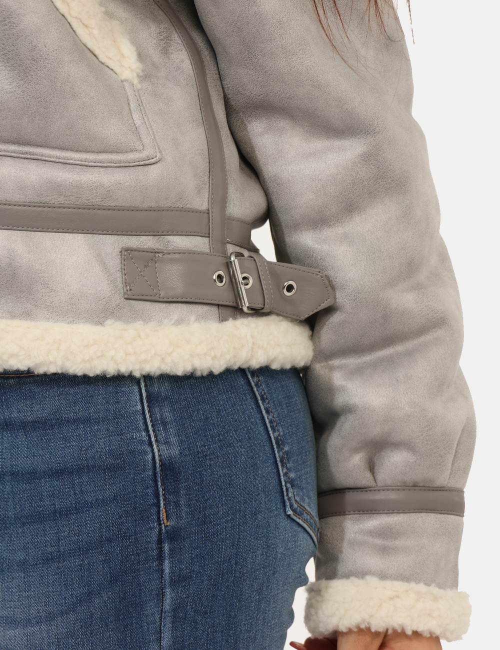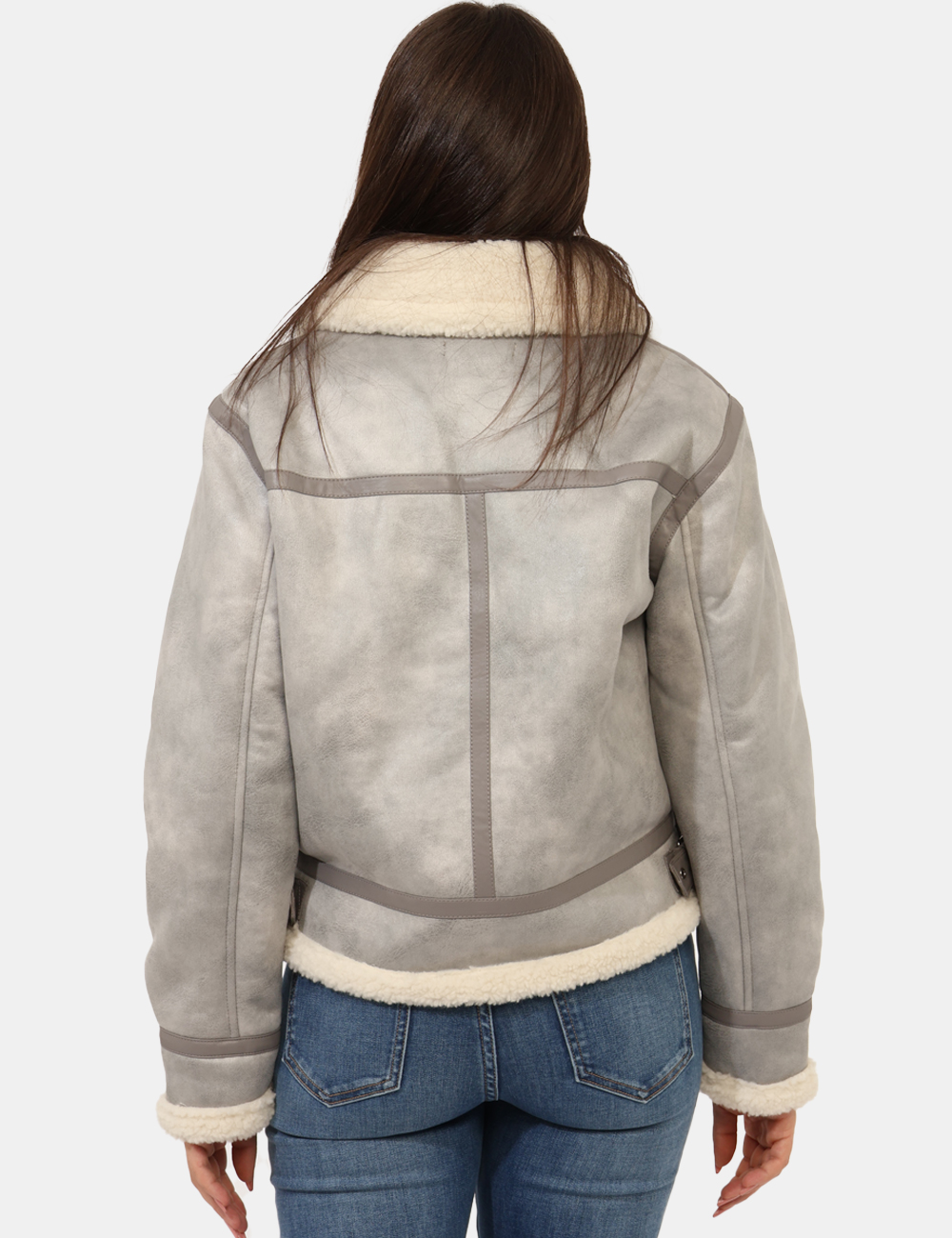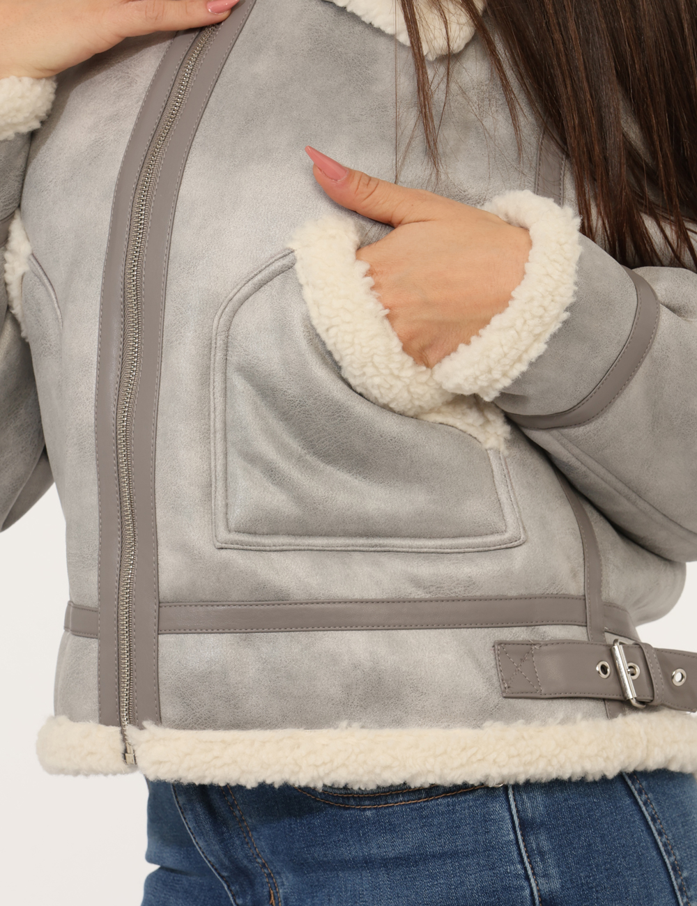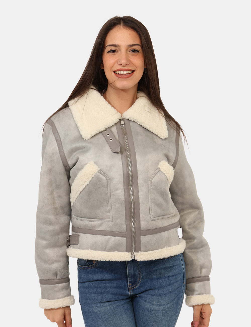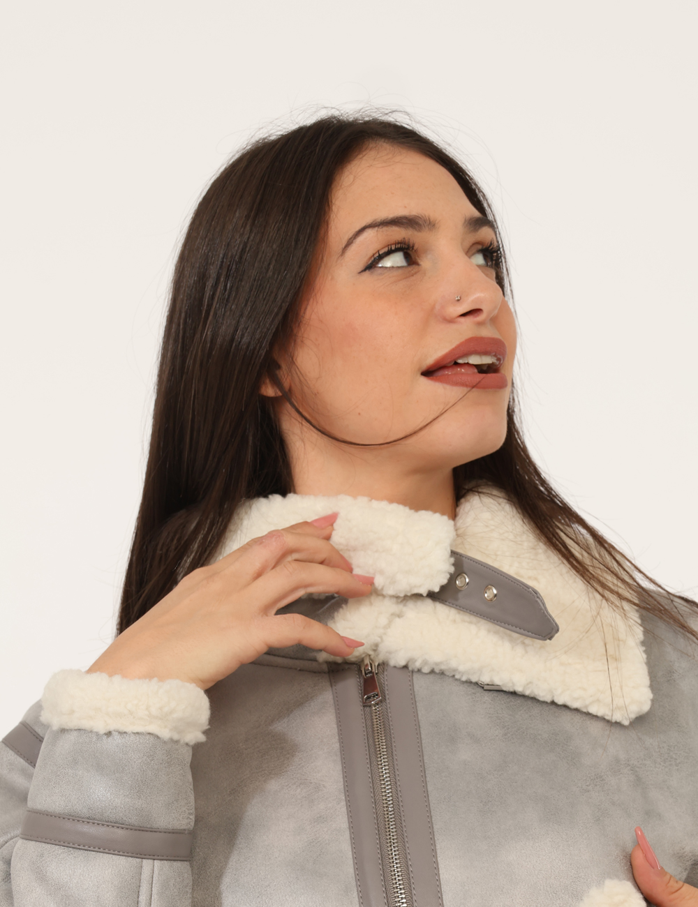 Giacca corta in total grigio perla più interno fake fur bianco richiamato sulle cuciture. Presenti tasche a taglio trasversale. La vestibilità è morbida e pratica grazie a zip frontale fibia sul girocollo. La giacca è adatta per occasioni casual, ideale per proteggersi dal freddo dell’inverno. Dona un tocco di stile ai tuoi outfit.