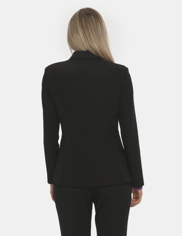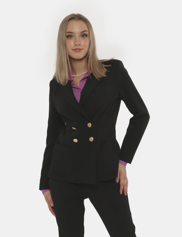 Giacca classica in total nero. Presenti fake tasche a taglio più bottoni ad asola dorati che donano luminosità ed una vestibilità pratica. La giacca è adatta per occasioni casual/raffinate. Fortemente professionale piacevolmente chic.