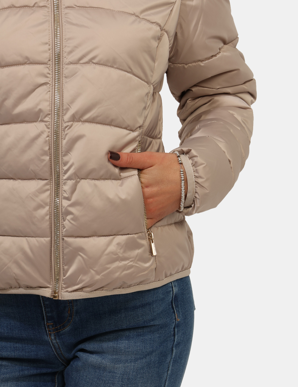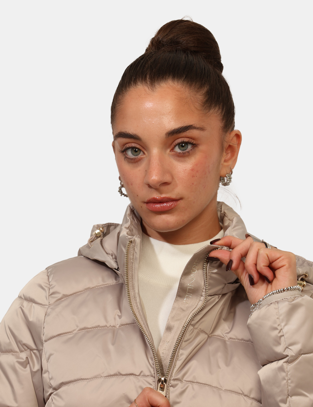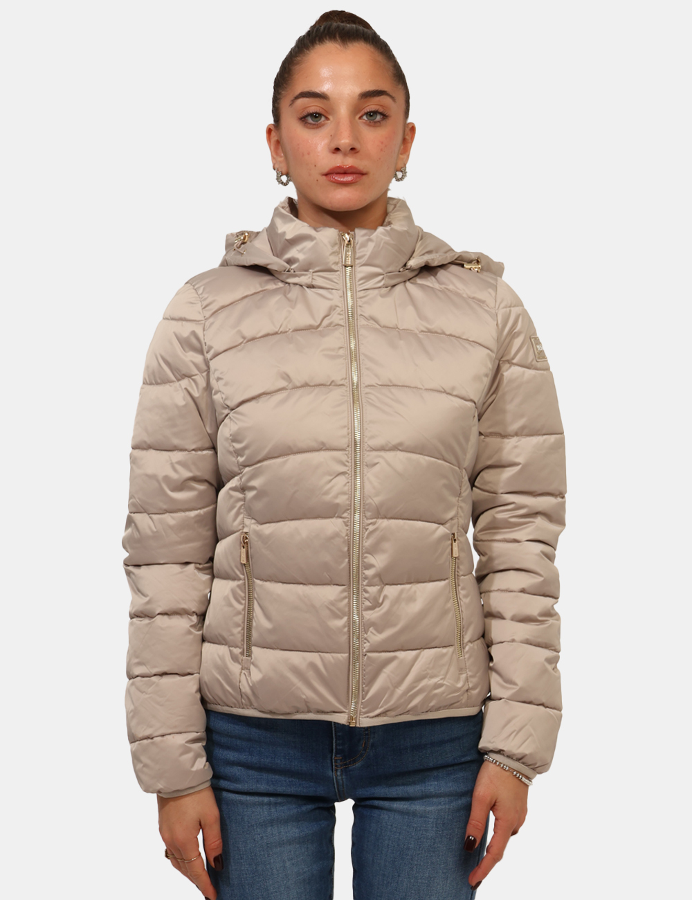 Piumino corto, trapuntato e con cappuccio. Vestibuilità ridotta.