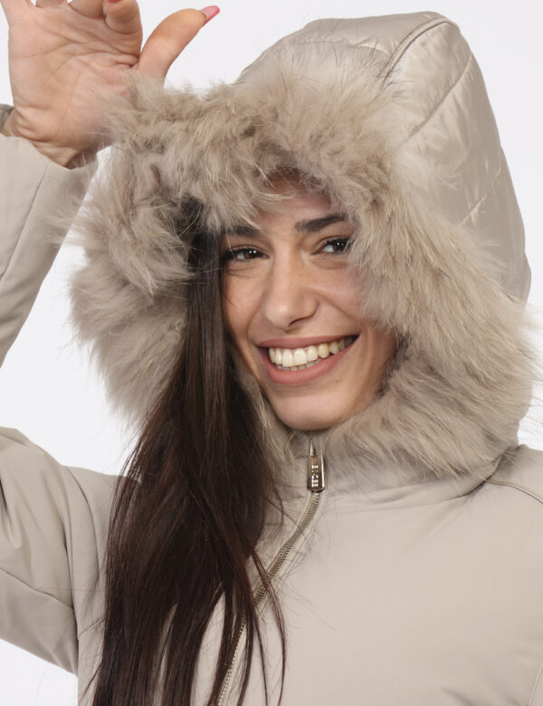Giacca invernale con cappuccio evidenziato da fake fur in total beige. Presente tasche a taglio trasversale con chiusura a zip. La vestibilità è morbida e pratica grazie a doppia zip dorata sul fronte. La giacca è adatta per occasioni casual e facilmente combinabile. Dona un tocco di stile ai tuoi outfit.