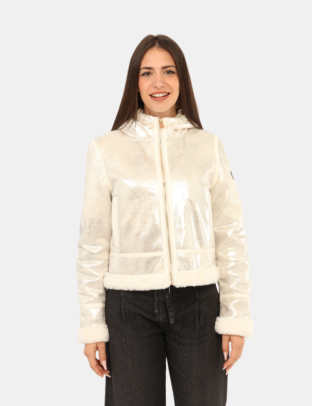 Giacca corta, con cappuccio lucido, in total bianco avorio ed interno in fake fur. Presenti tasche a taglio trasversale. La vestibilità è morbida e pratica grazie a zip sul fronte. La giacca è adatta per occasioni casual e ideale per l’inverno. Indossala se vuoi spiccare con stile.