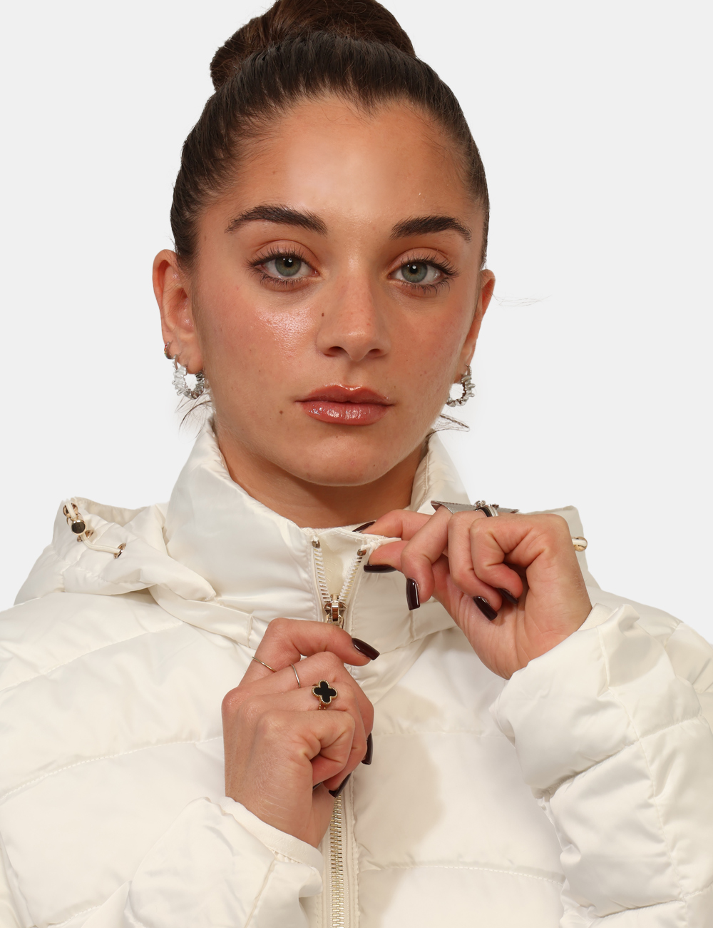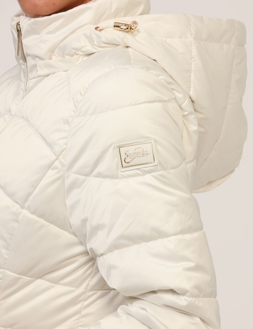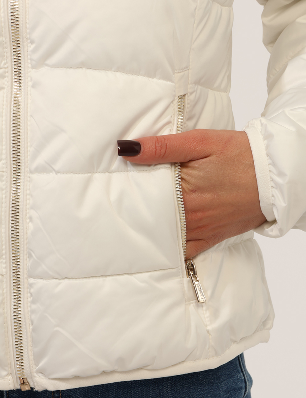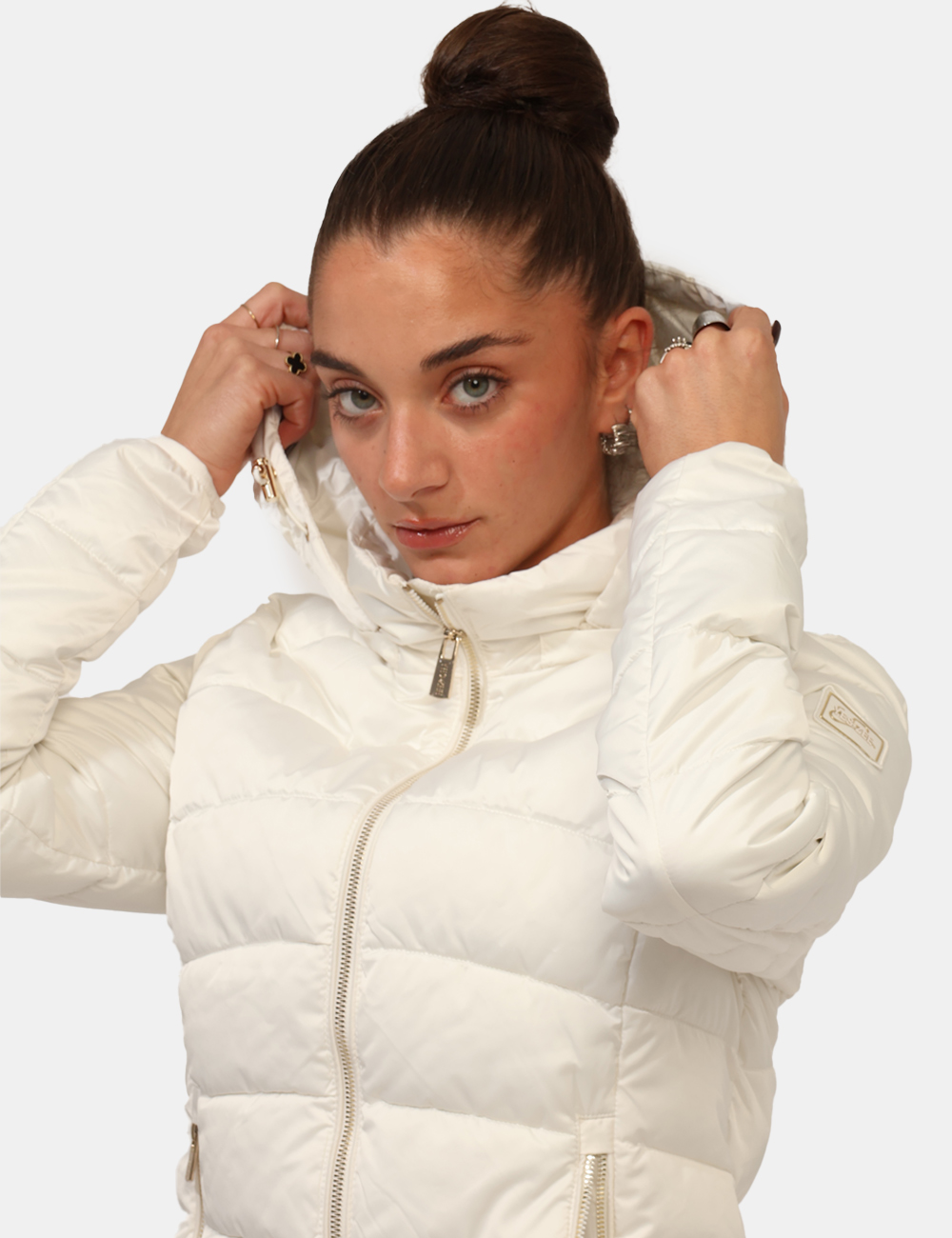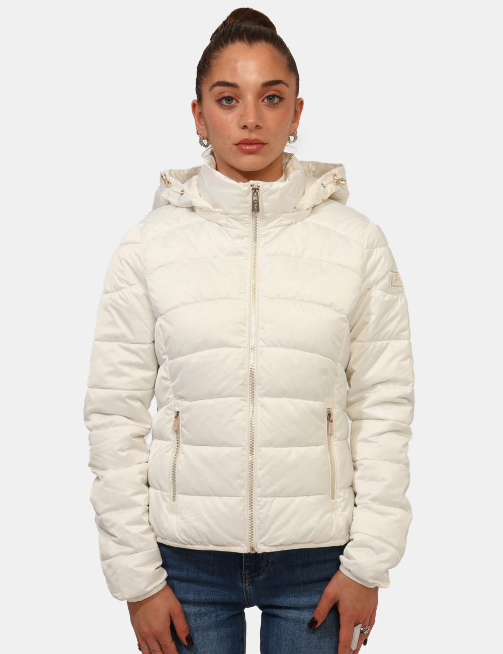 Piumino corto, trapuntato e con cappuccio. Vestibuilità ridotta.