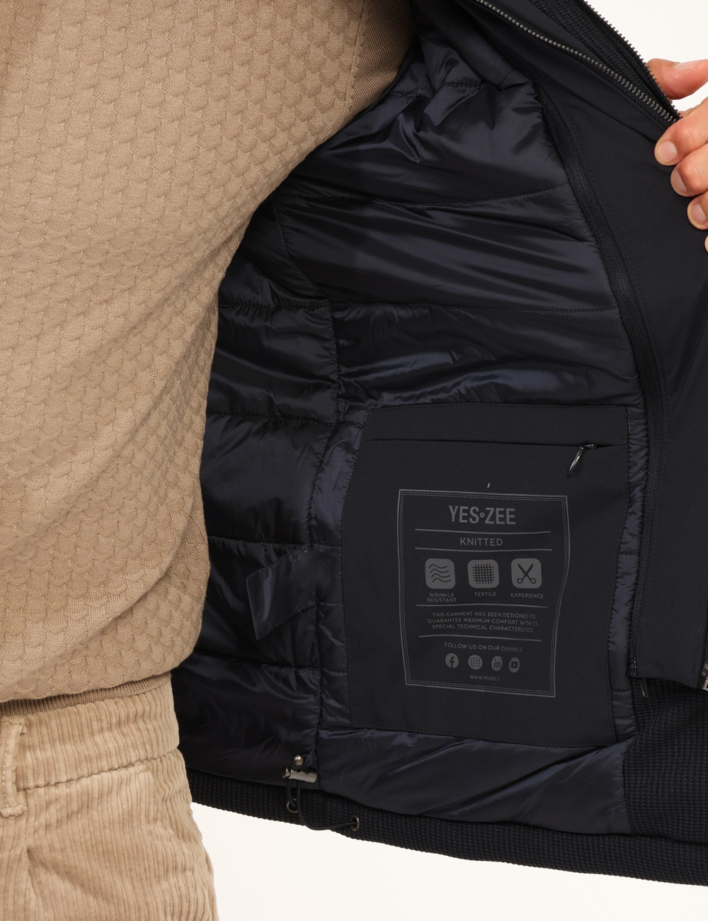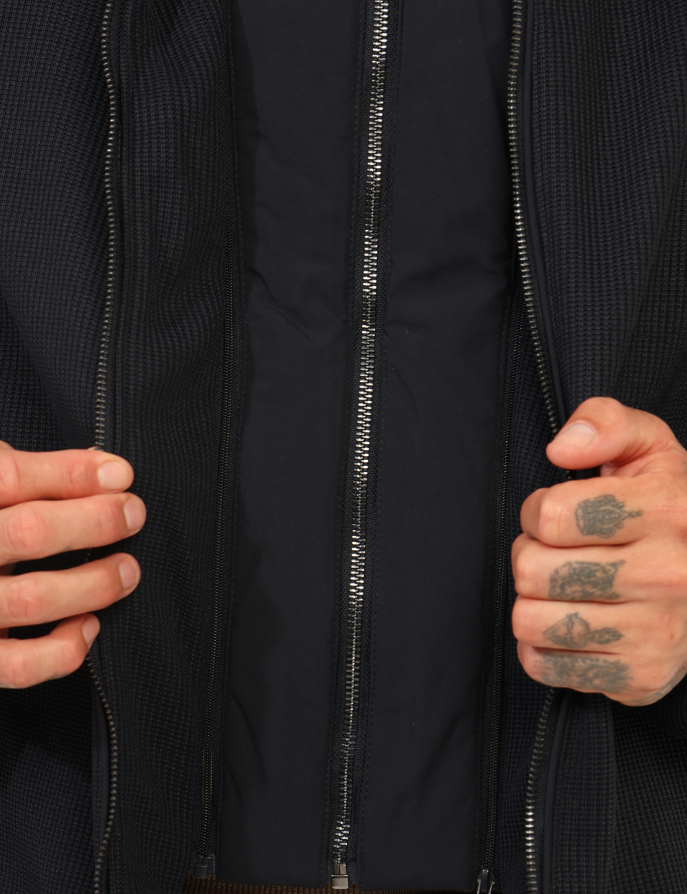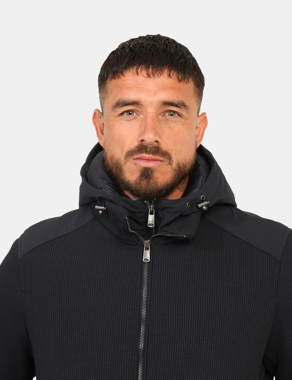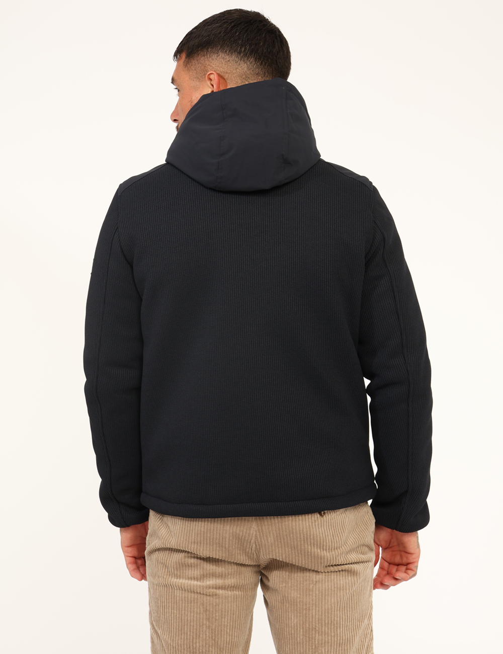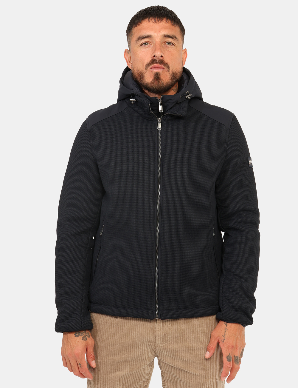 Giacca in tessuto pesante, con cappuccio, in total blu con tasche a taglio trasversale. La vestibilità è morbida e pratica grazie a doppia zip sul fronte. La giacca è adatta per occasioni casual e facilmente combinabile. Praticità e stile in un solo capo.