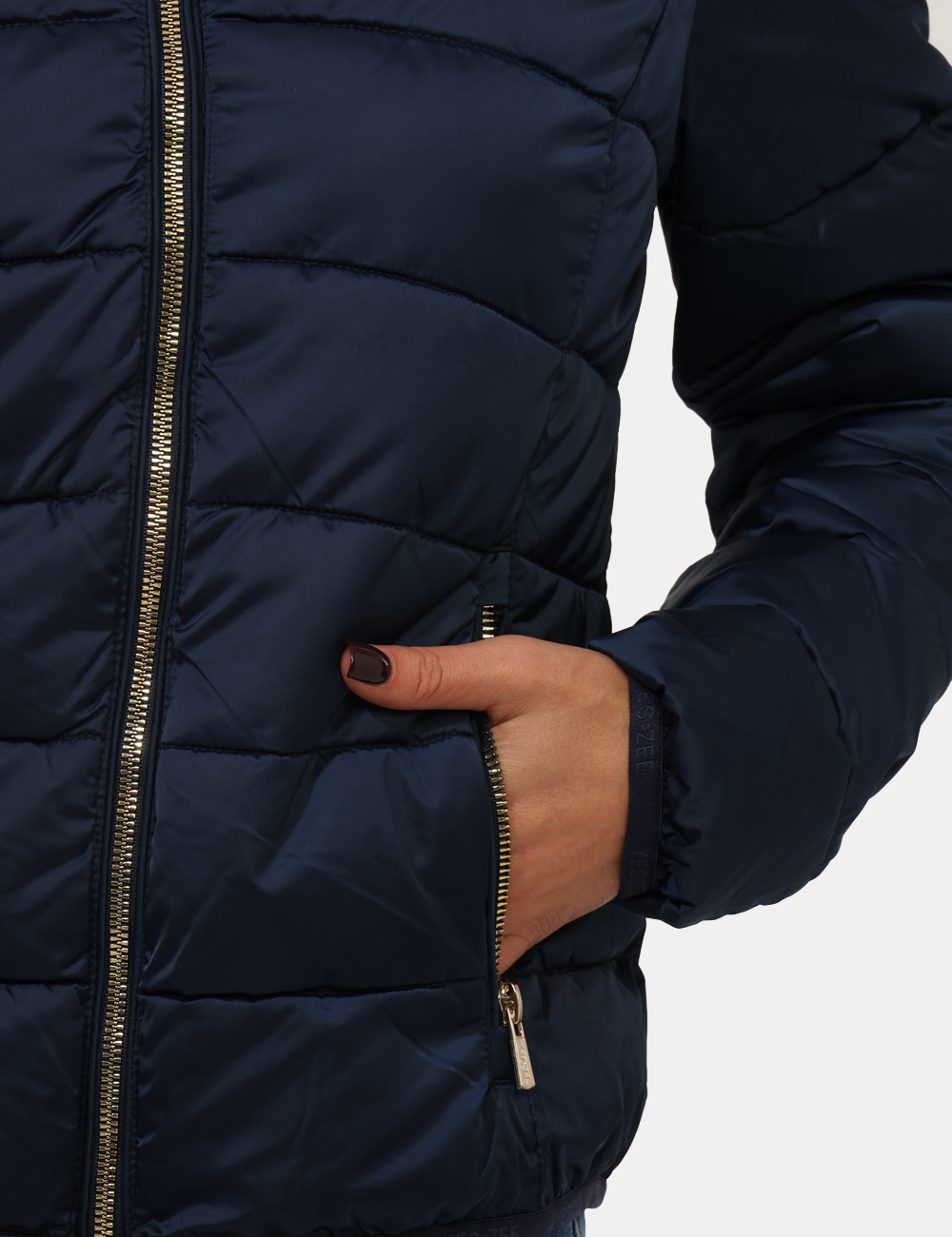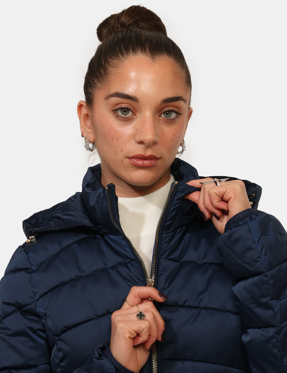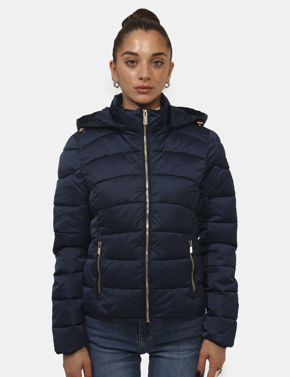 Piumino corto, trapuntato e con cappuccio. Vestibuilità ridotta.