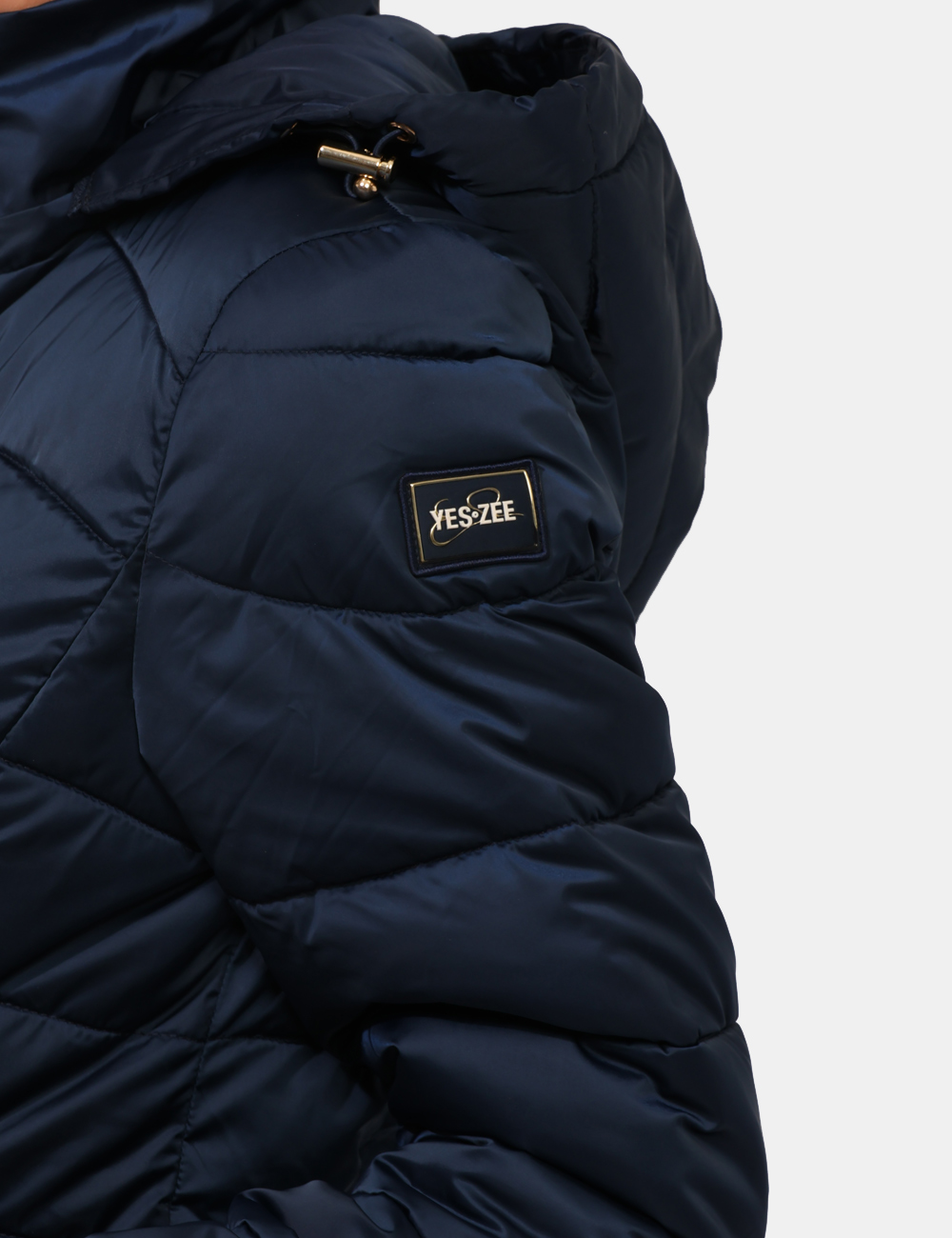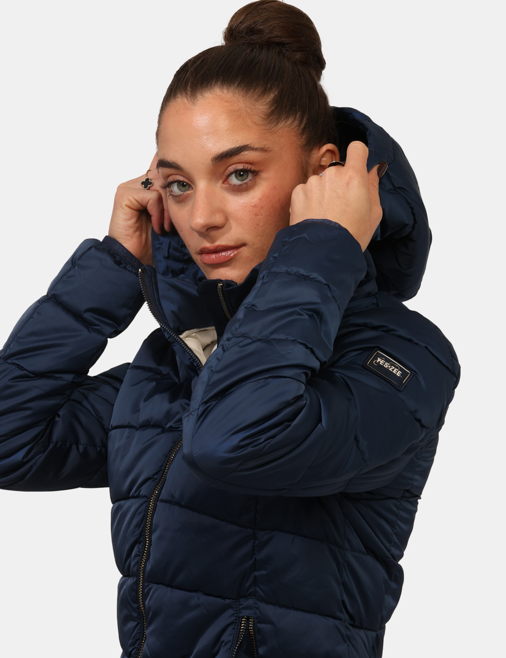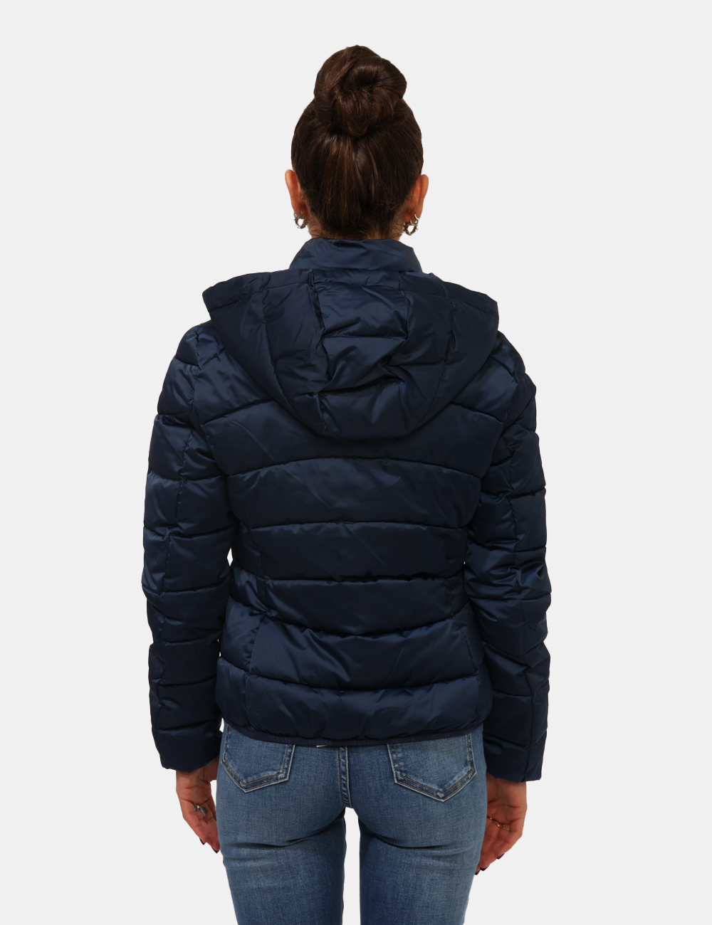 Piumino corto, trapuntato e con cappuccio. Vestibuilità ridotta.