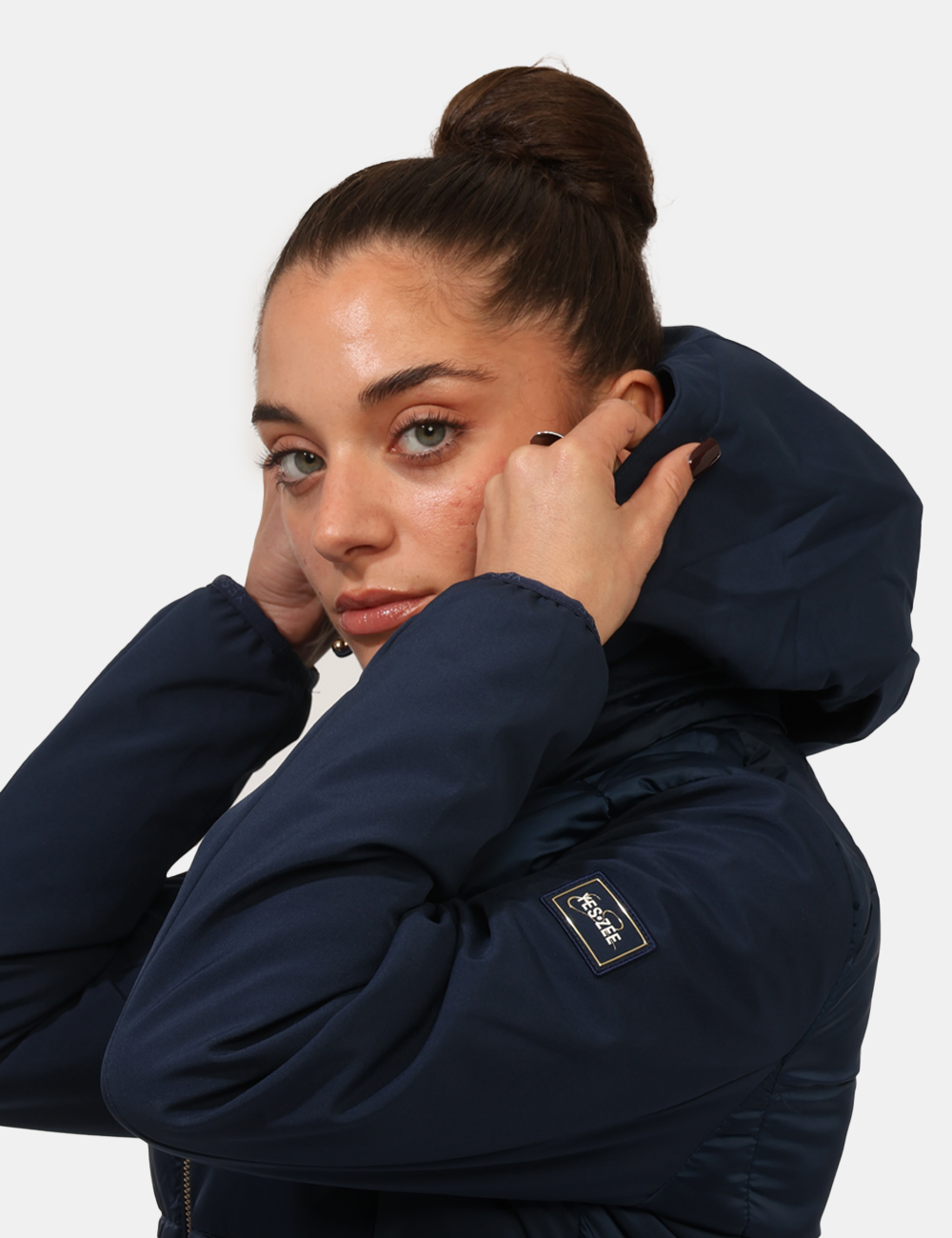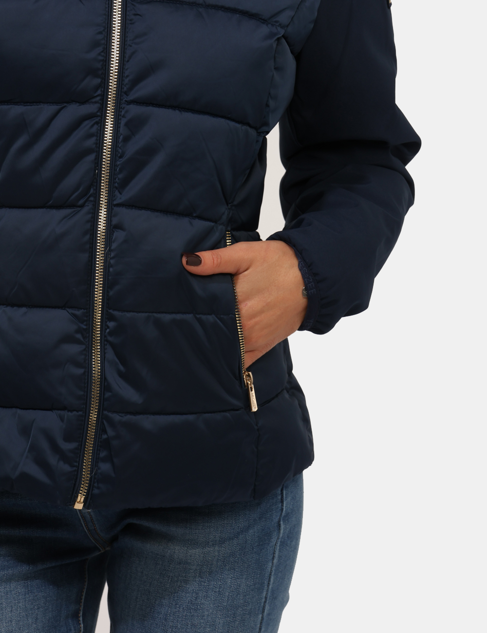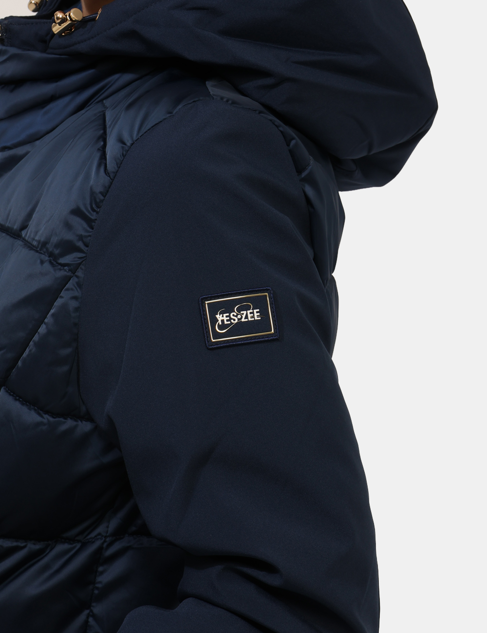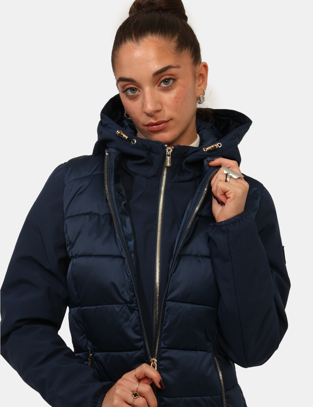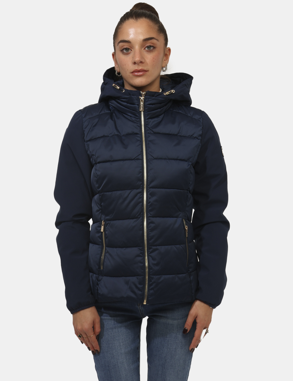 Piumino corto, trapuntato e con cappuccio. Vestibuilità ridotta.