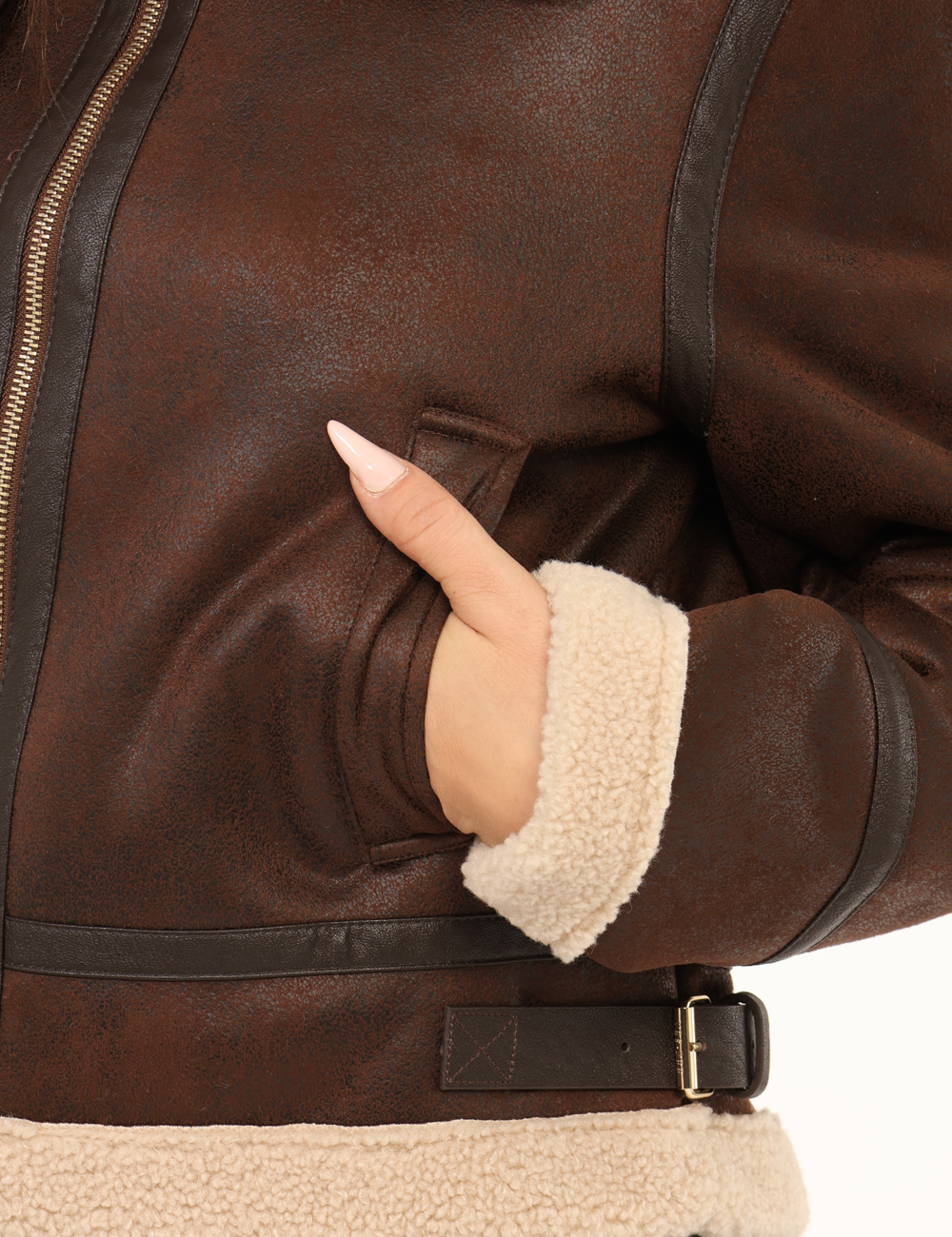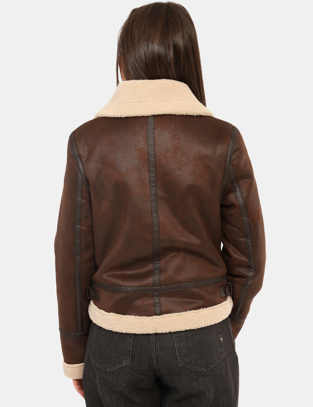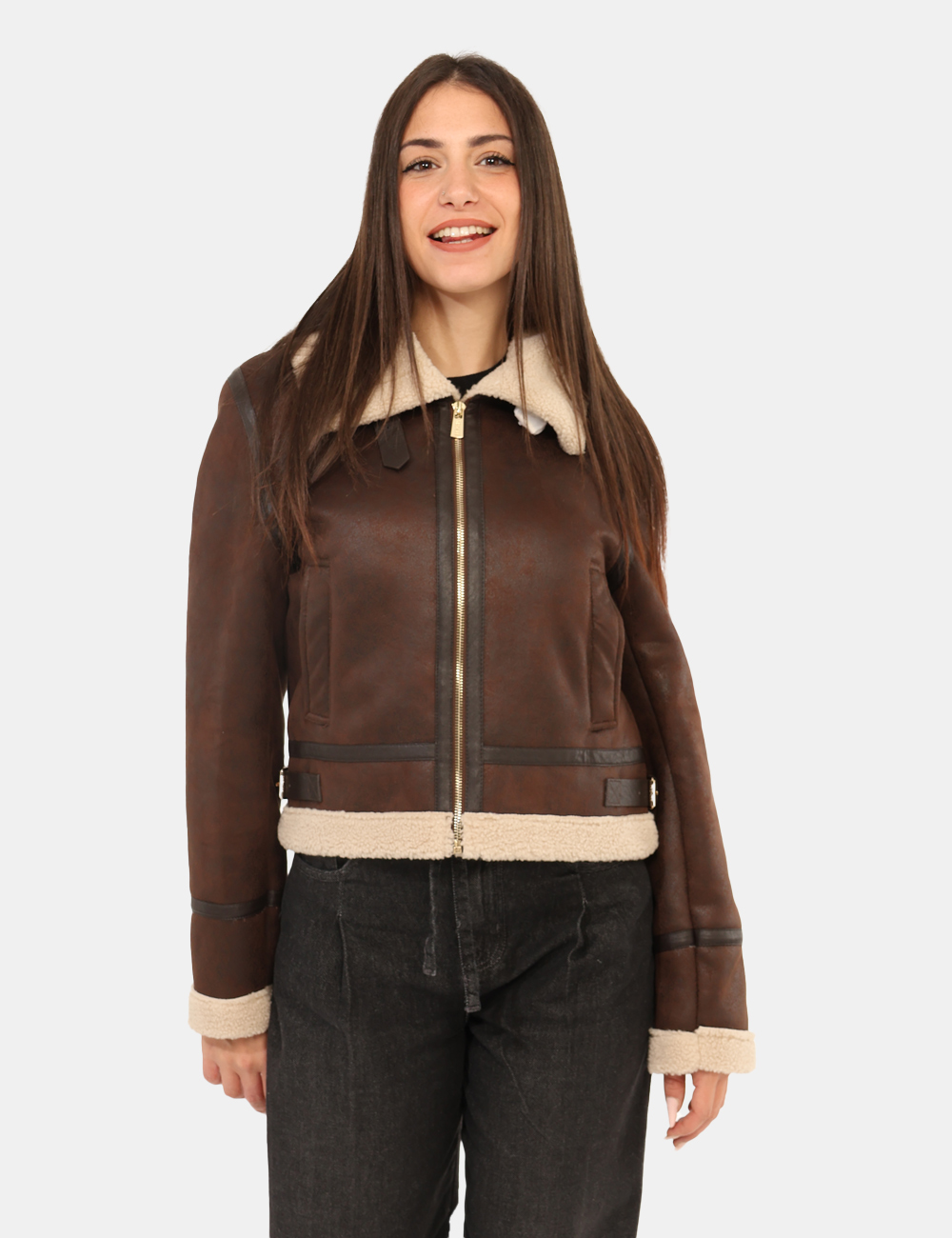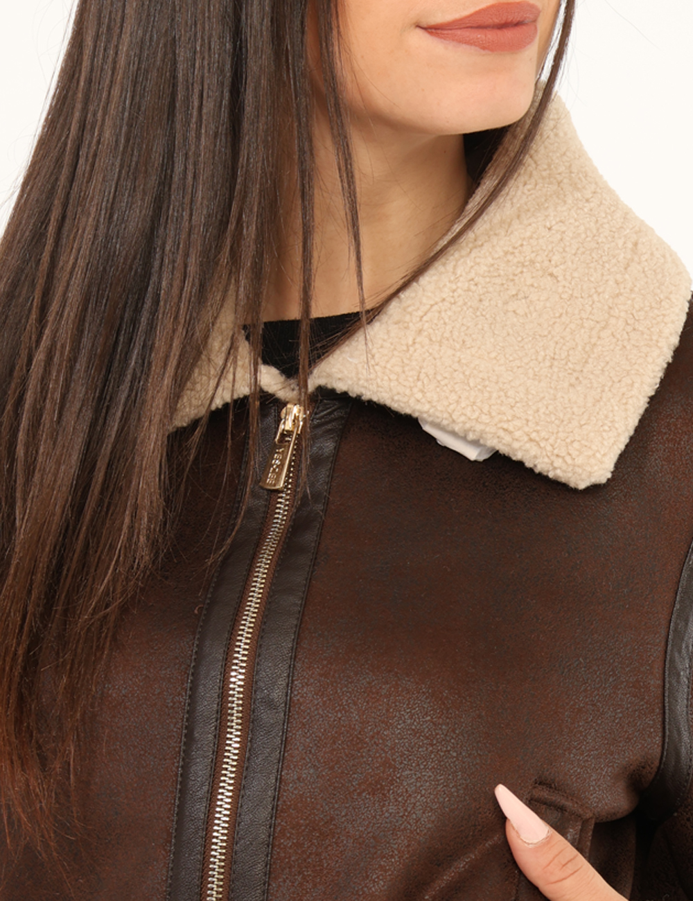 Giacca corta in total testa di moro con interno in fake fur bianco e tasche a taglio trasversale, più dettagli dorati. La vestibilità è morbida e pratica grazie a zip sul fronte. La giacca è adatta per occasioni casual e ideale per l’inverno. Indossala se vuoi spiccare con stile.