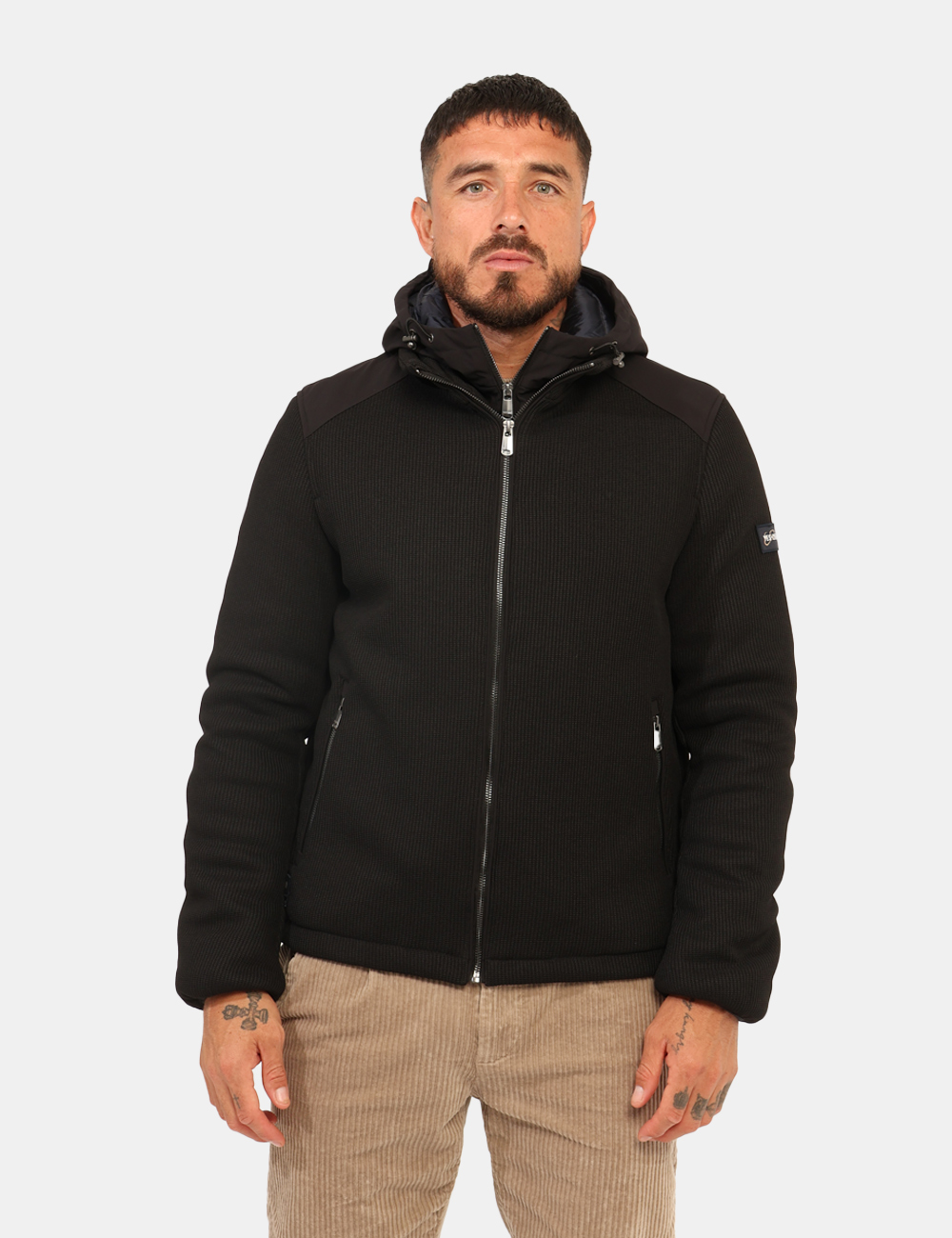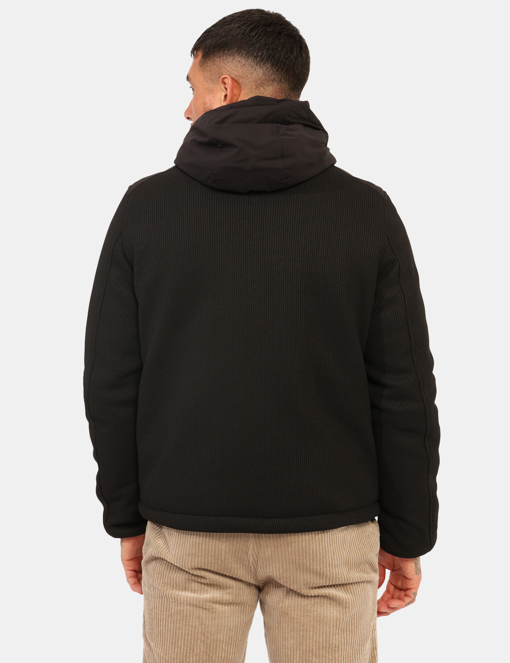 Giacca in tessuto pesante, con cappuccio, in total nero con tasche a taglio trasversale. La vestibilità è morbida e pratica grazie a doppia zip sul fronte. La giacca è adatta per occasioni casual e facilmente combinabile. Praticità e stile in un solo capo.