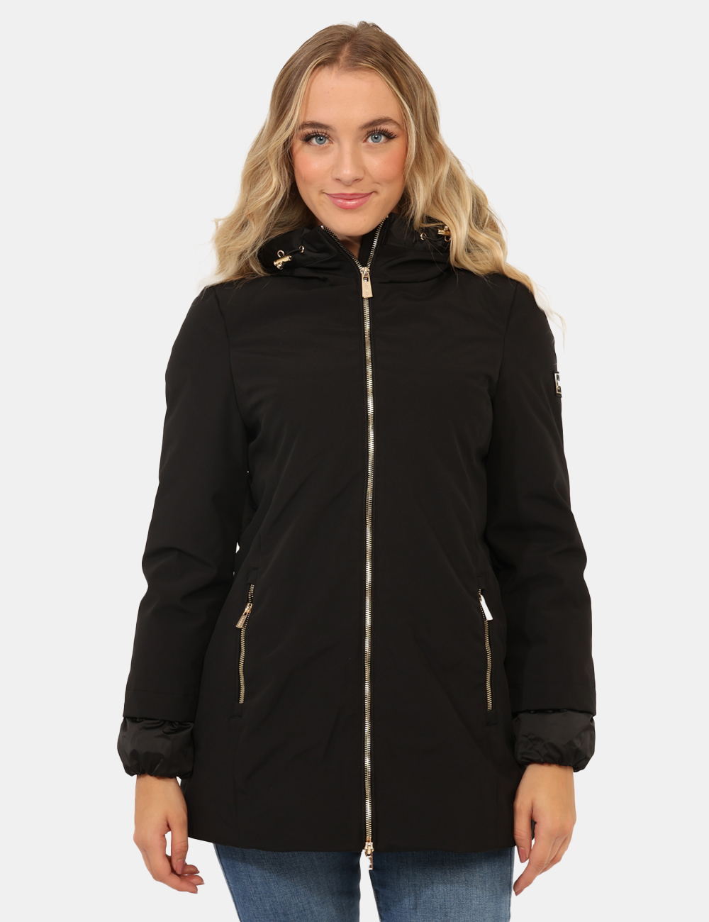 Giacca invernale total nero, con cappuccio, dettagli dorati e tasche a taglio trasversale. La vestibilità è morbida e pratica grazie a zip sul fronte. La giacca è adatta per occasioni casual, ideale per l’inverno. Indossala per spiccare con stile.