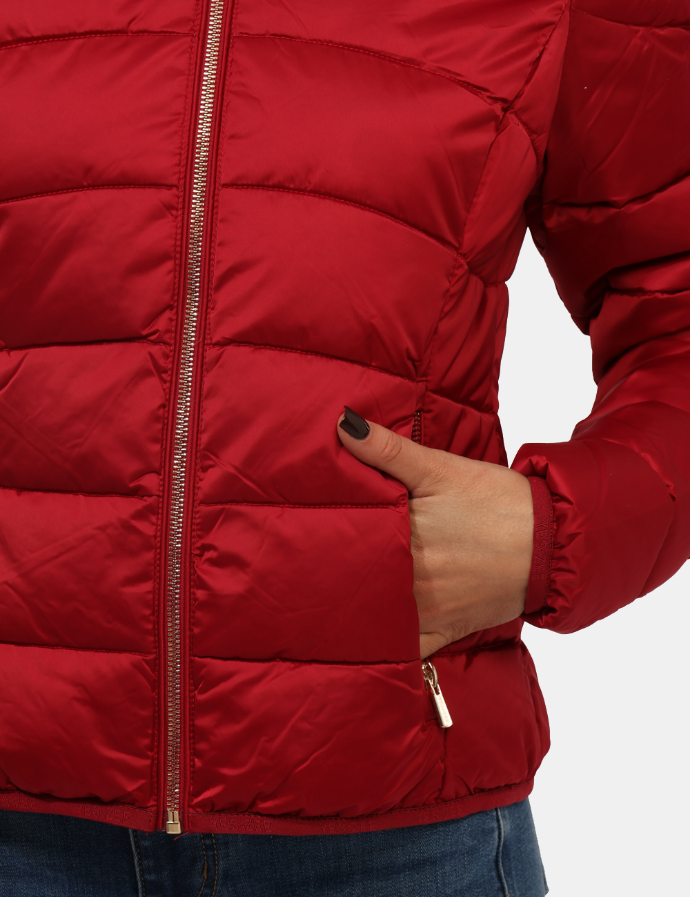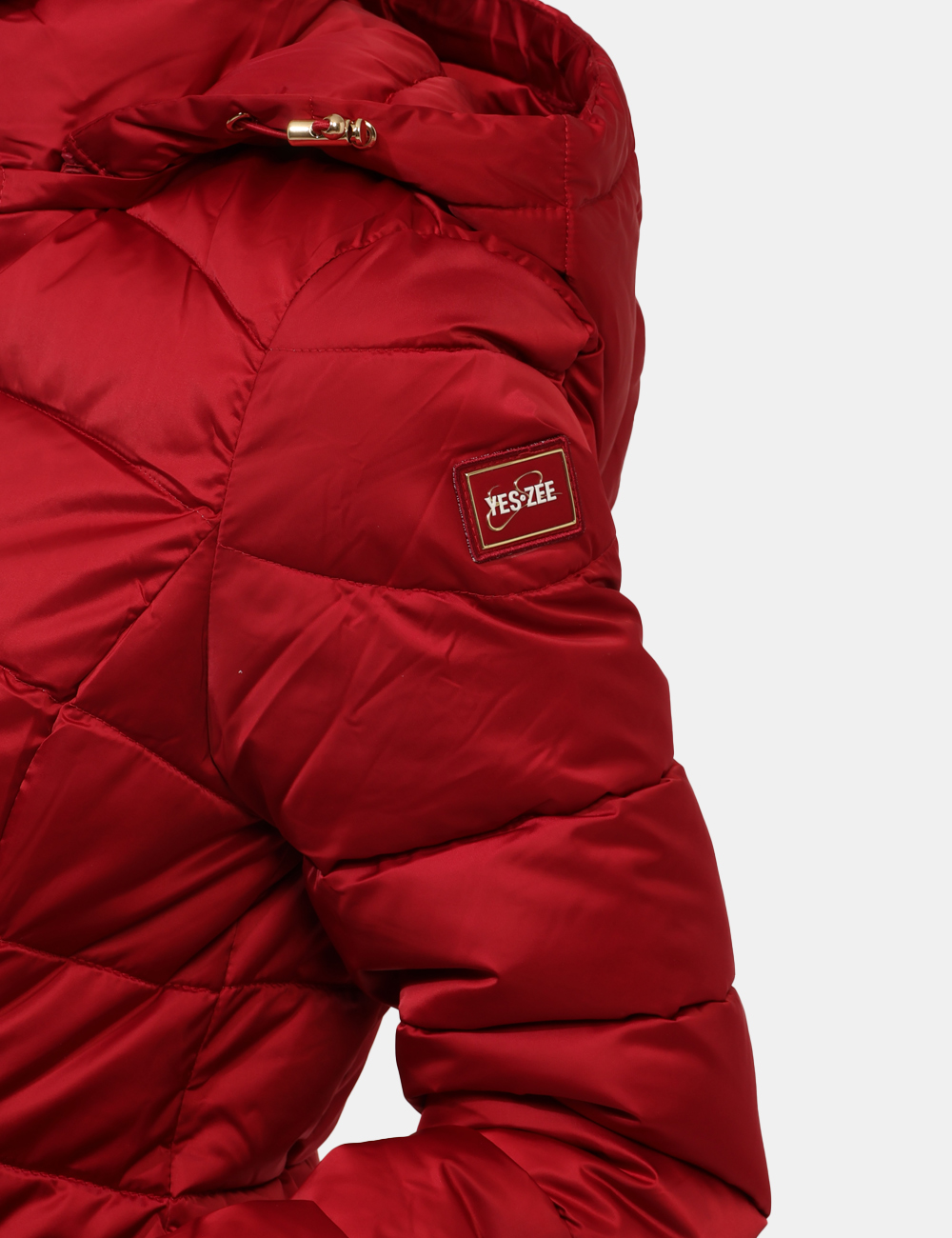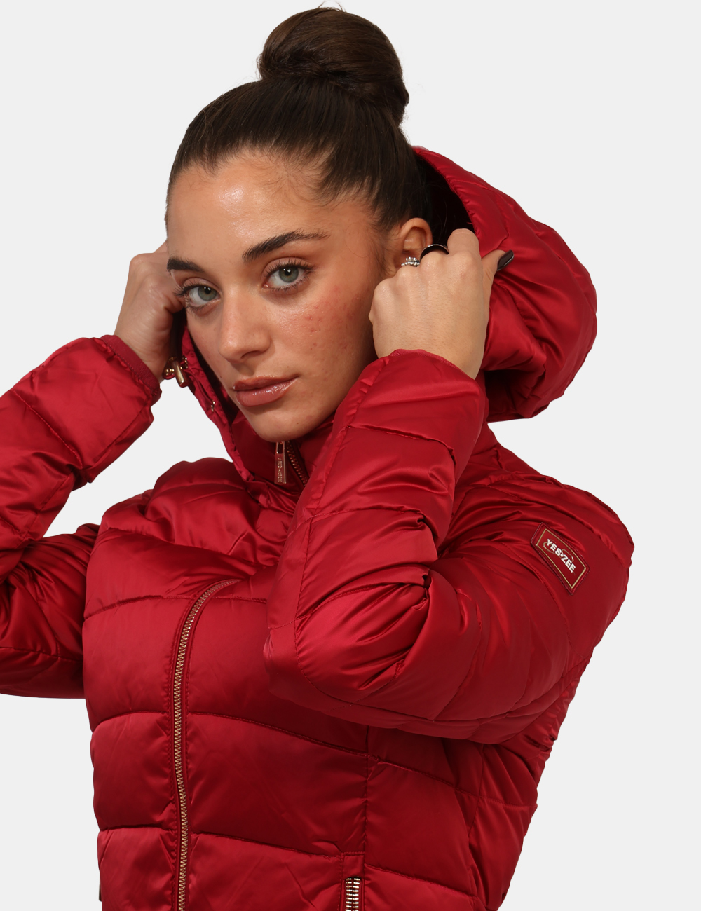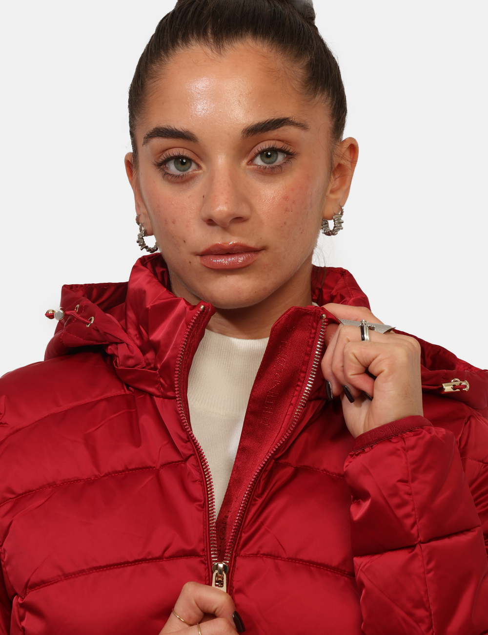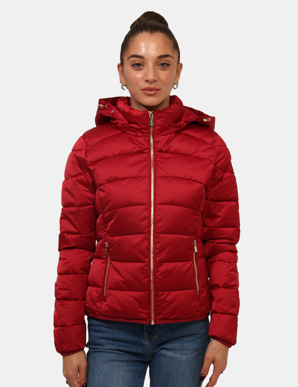 Piumino corto, trapuntato e con cappuccio. Vestibuilità ridotta.