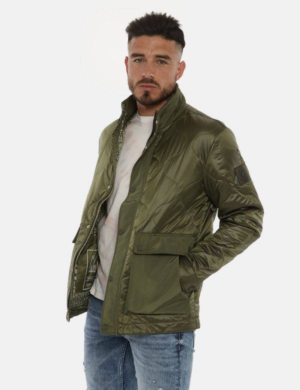 Il giaccone si sviluppa in total verde oliva e presenta doppia tasca a toppa con chiusura in bottoni automatici. La vestibilità è morbida e pratica grazie a doppia chiusura sul fronte con zip e bottoni automatici. Ulteriori dettagli sono rappresentati da tasca interna e collo alto. Il giaccone è ideale per occasioni casual e facilmente abbinabile. Il capo è adatto per outfit diurni e serali.