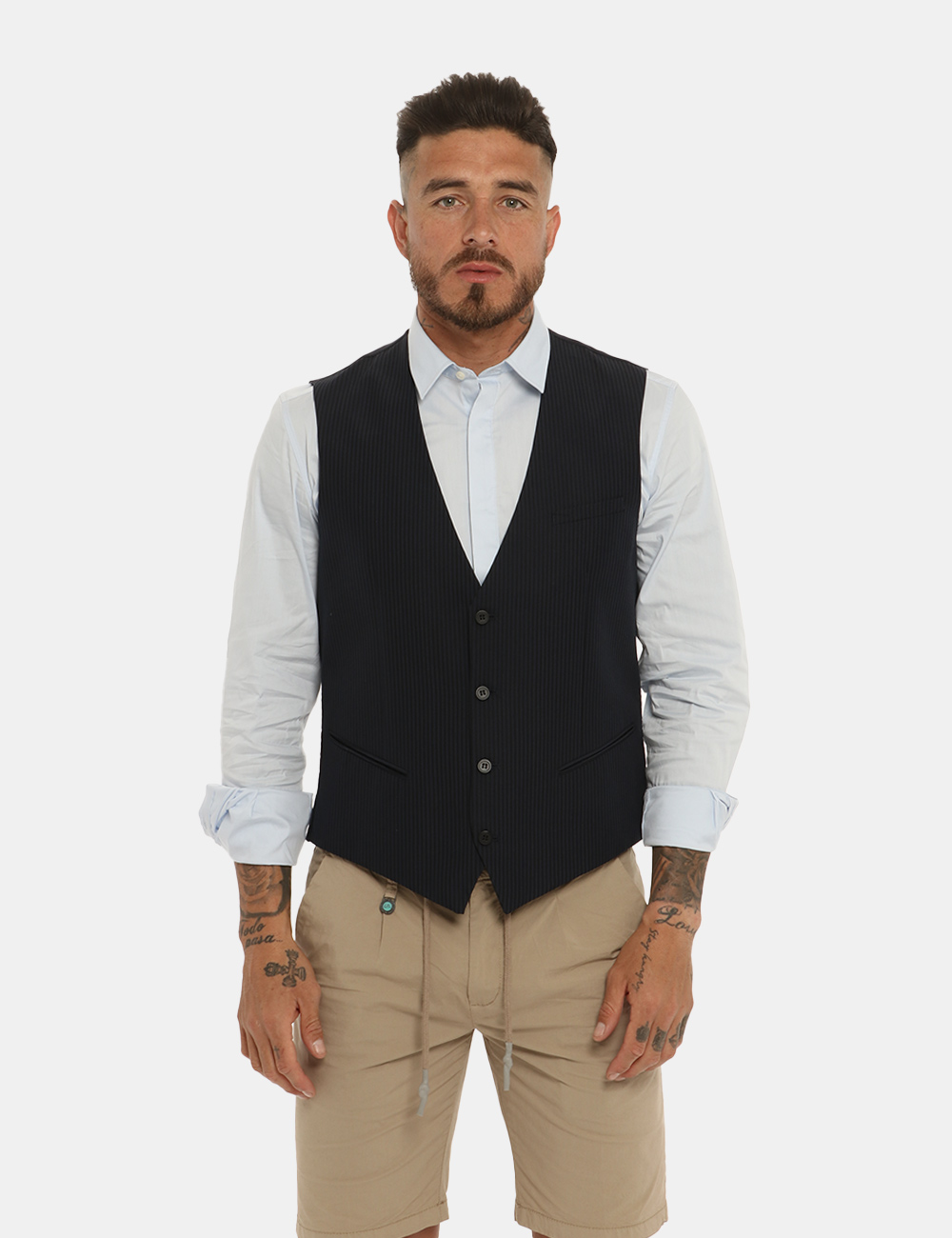 Gilet classico total blu su sfondo rigato verticale. Presenti tasche fake a taglio trasversale sul fronte e taschino fake ad altezza cuore. La vestibilità è morbida e pratica grazie a bottoni ad asola. Il gilet è adatto per occasioni classiche e raffinate. Inseriscilo nel carrello per essere impeccabile.