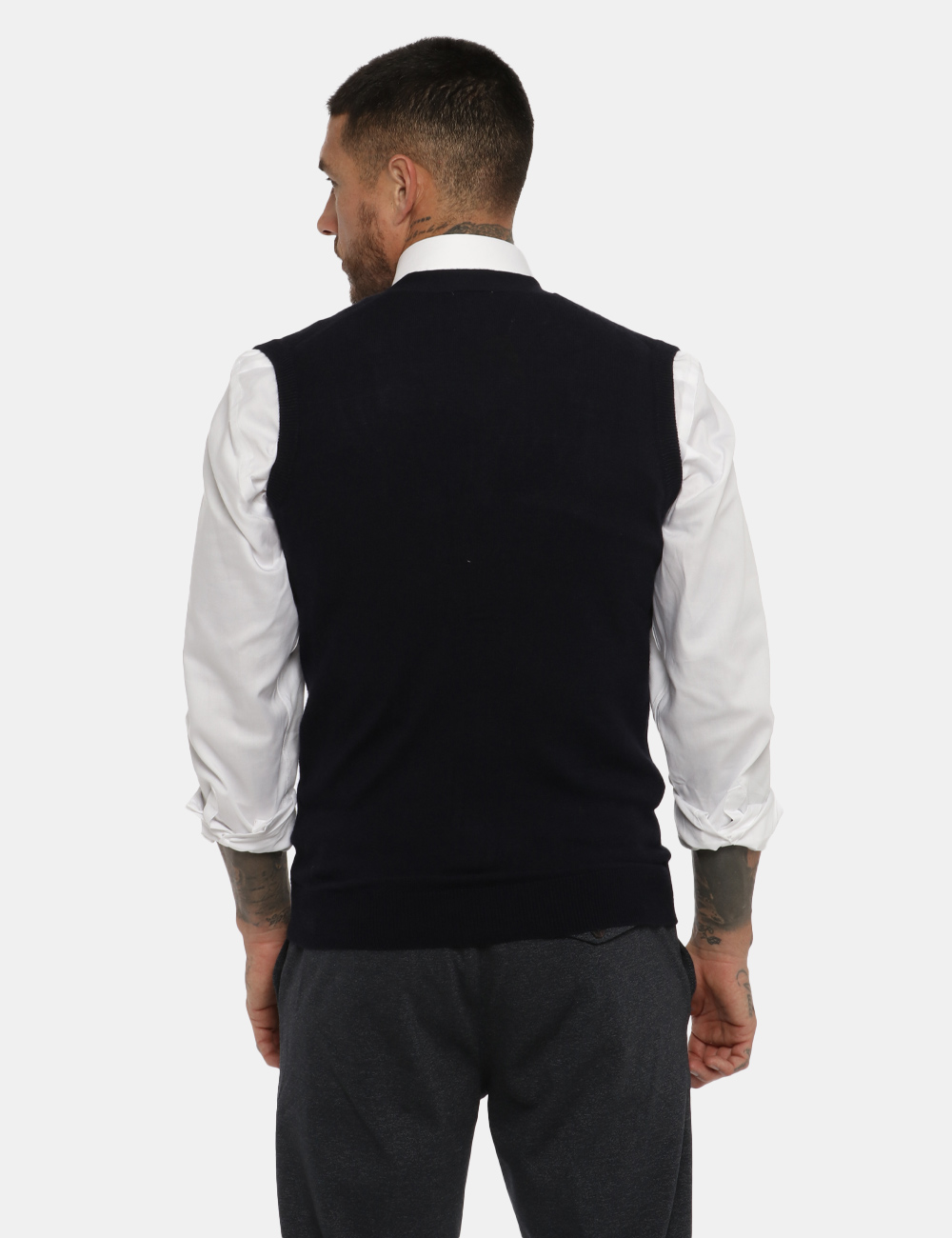 Gilet in maglina in total blu navy con scollo a V. La vestibilità è morbida e pratica grazie a bottoni ad asola in tinta. Il gilet è adatto per le occasioni casual. Da indossare al volo.