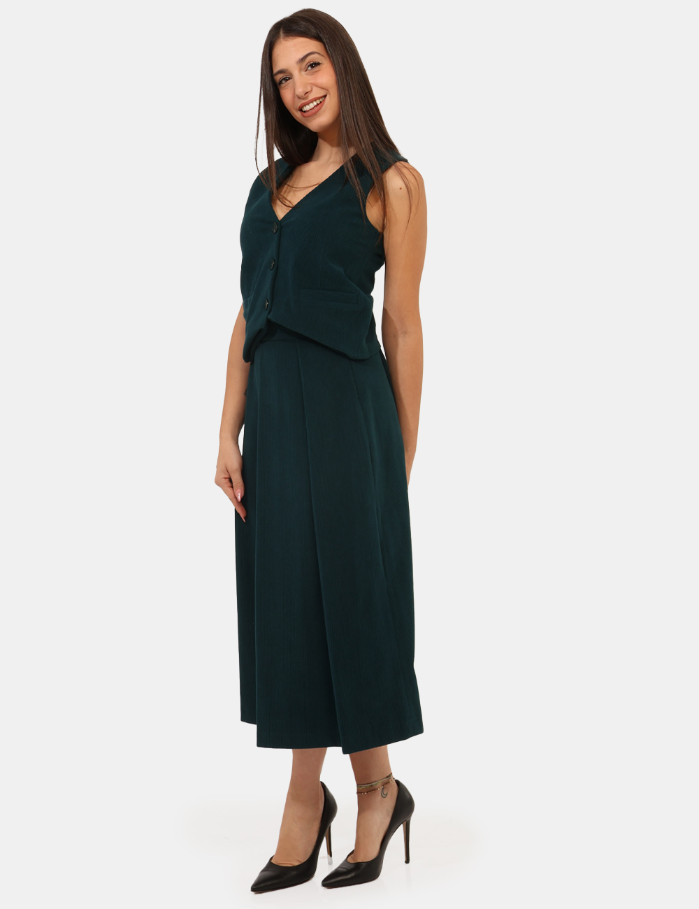 Gonna misura longuette in total azzurro pastello con piccolo spacchetto sul retro. La vestibilità è morbida e pratica grazie a zip più bottone in girovita. La gonna è adatta per occasioni eleganti e facilmente combinabile con il blazer coordinato per un tailleur in versione elegante. Dona un tocco di stile ai tuoi outfit.