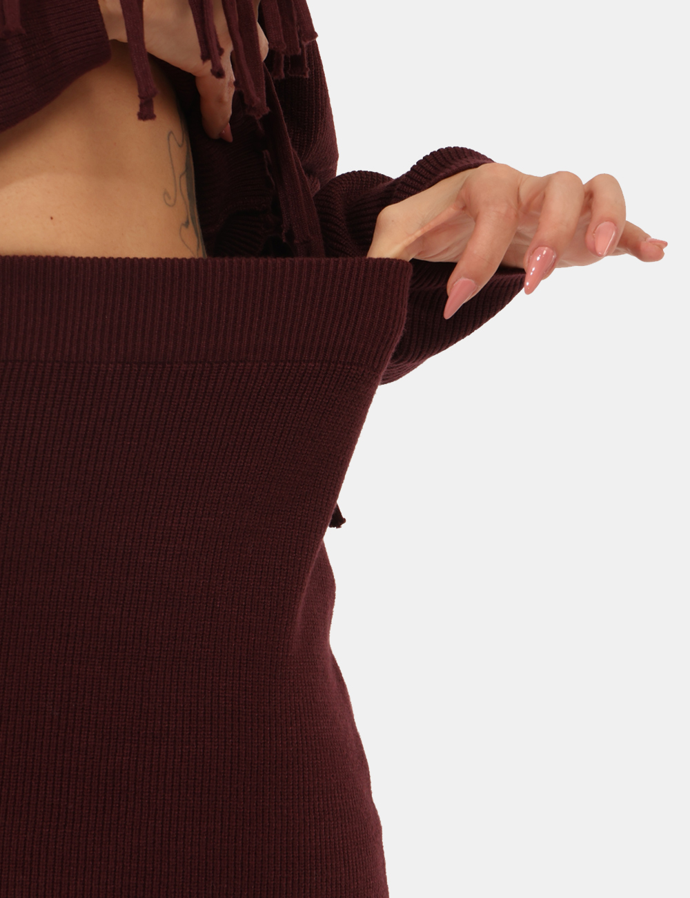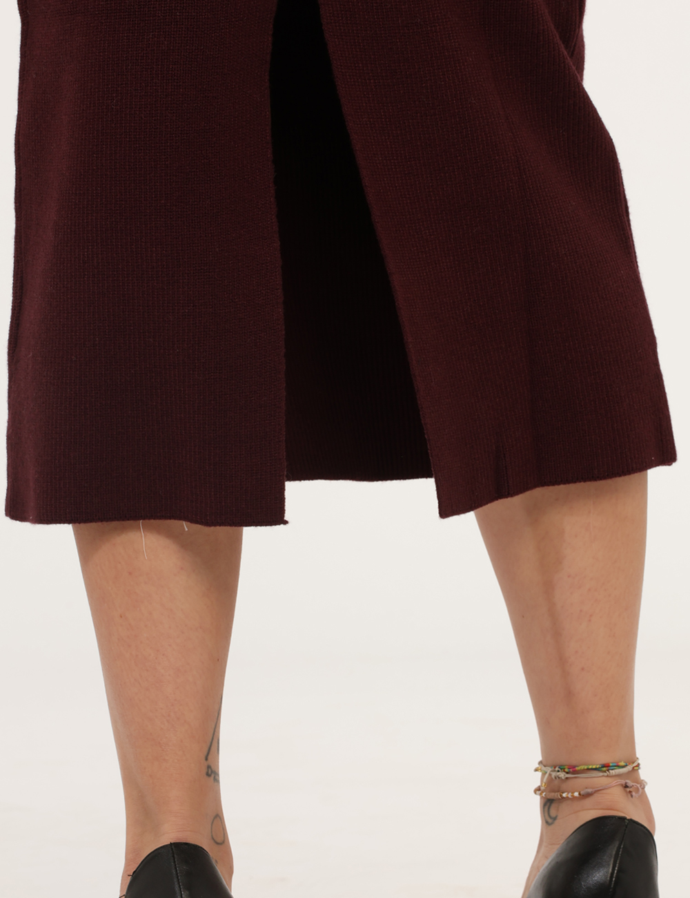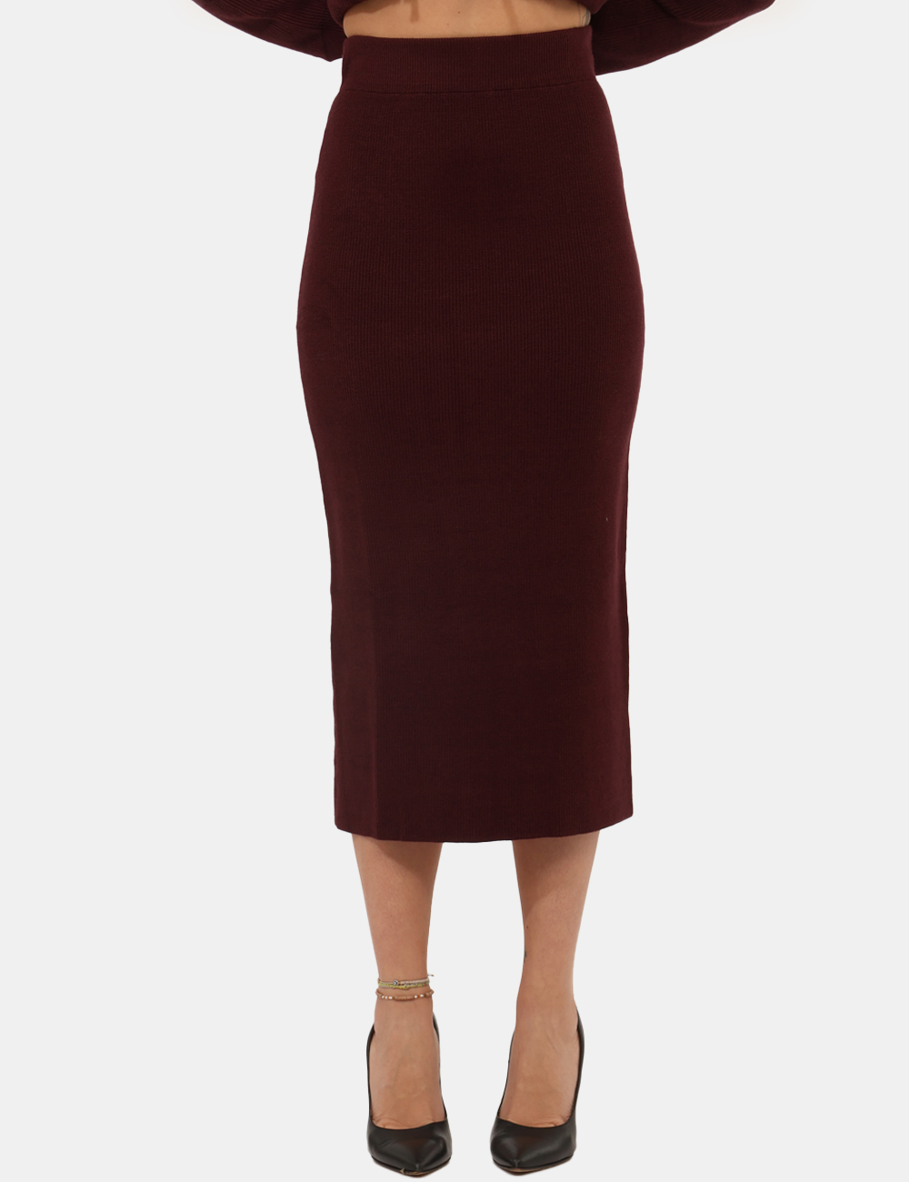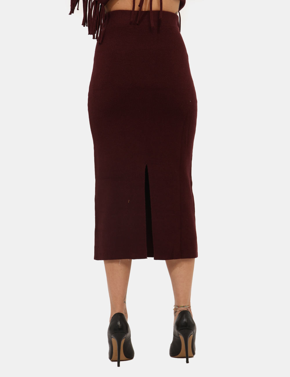 Gonna lunga in maglina, total bordeaux con spacco sul retro. La vestibilità è morbida e regolabile grazie ad elastico in girovita. La gonna è adatta per occasioni casual e facilmente combinabile con numerosi accessori. Praticità e stile in un solo capo.