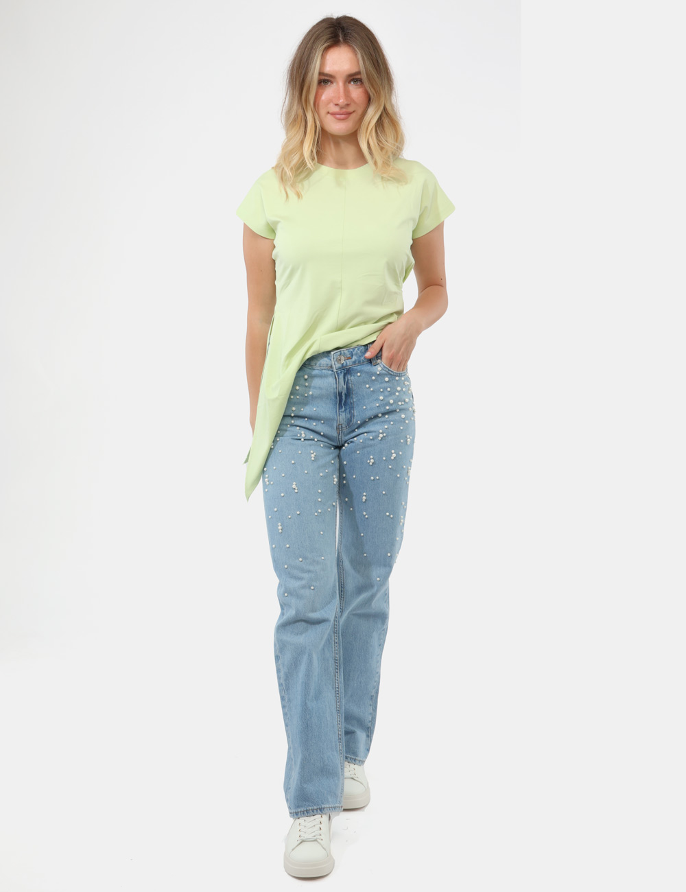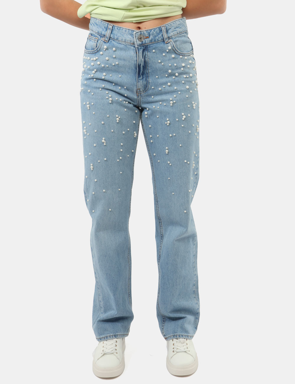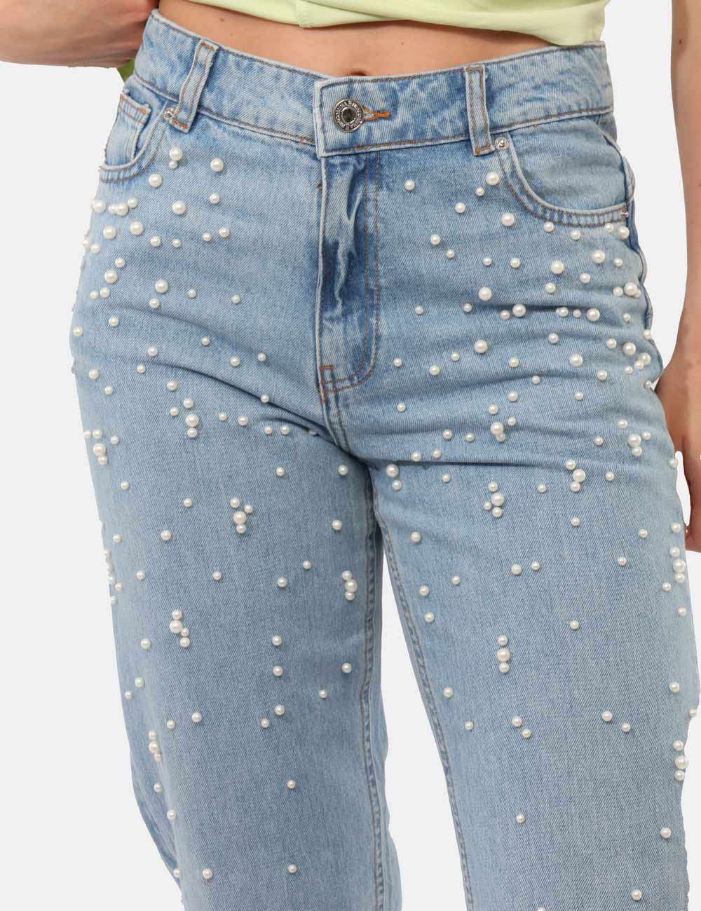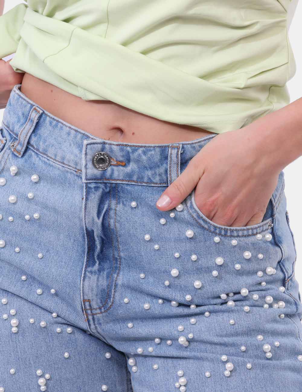 Il design è arricchito da eleganti perle applicate, un dettaglio raffinato che dona luce e personalità al capo, trasformando un classico denim in una proposta più ricercata. Questi jeans con perle applicate sono perfetti per chi ama distinguersi con discrezione.