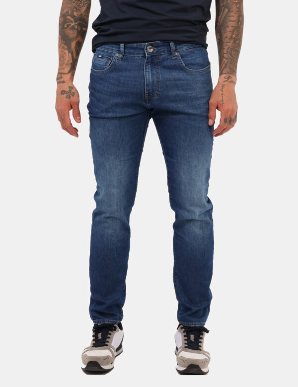 Jeans classico in total blu denim slavato, con tasche sagomate sul fronte e tasche a toppa sul retro. La vestibilità è morbida e pratica grazie a bottone più zip. Il capo è adatto per occasioni casual e facilmente combinabile. Il jeans è una certezza: indossalo per non sbagliare.