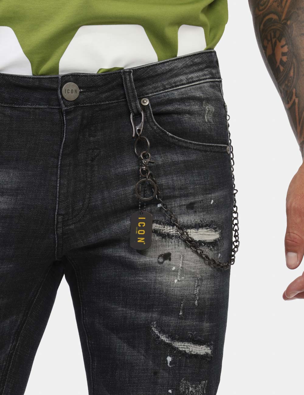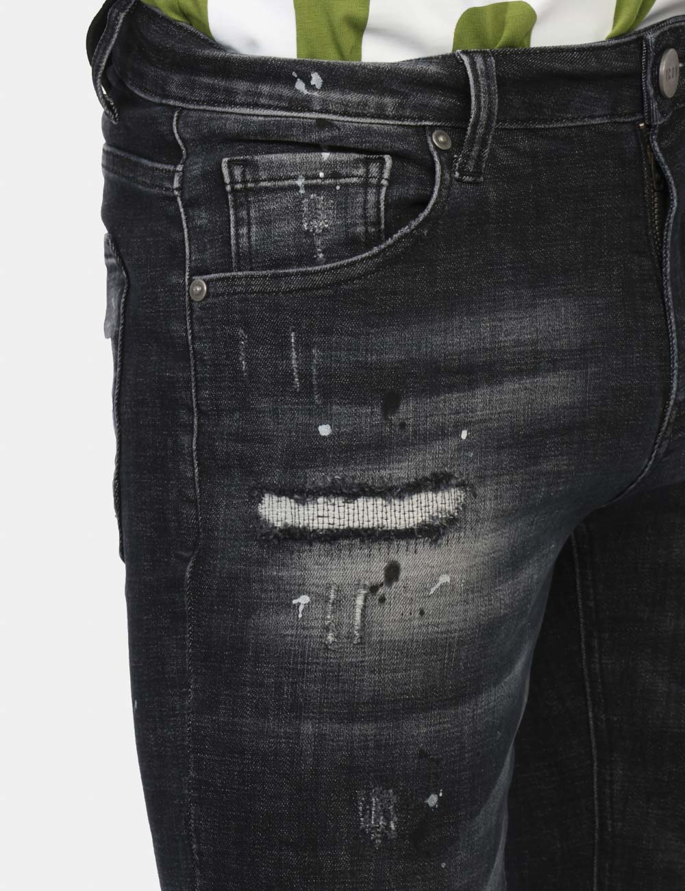 Jeans in total nero slavato con tasche sagomate sul fronte e tasche a toppa sul retro. Ulteriore dettaglio è rappresentato da piccoli “Ripped Jeans” su entrambe le gambe più catenella. La vestibilità è morbida e pratica grazie a bottoni ad asola più zip. Il capo è ideale per occasioni casual e per outift di giorno e di sera. Il jeans è una certezza: indossalo per non sbagliare mai. L’articolo appartiene al campionario esclusivo di stagione: pezzo unico