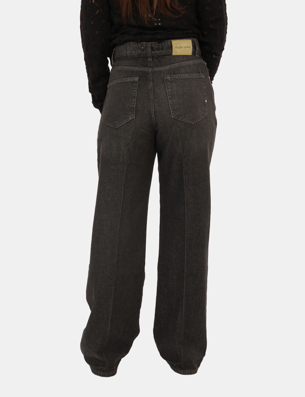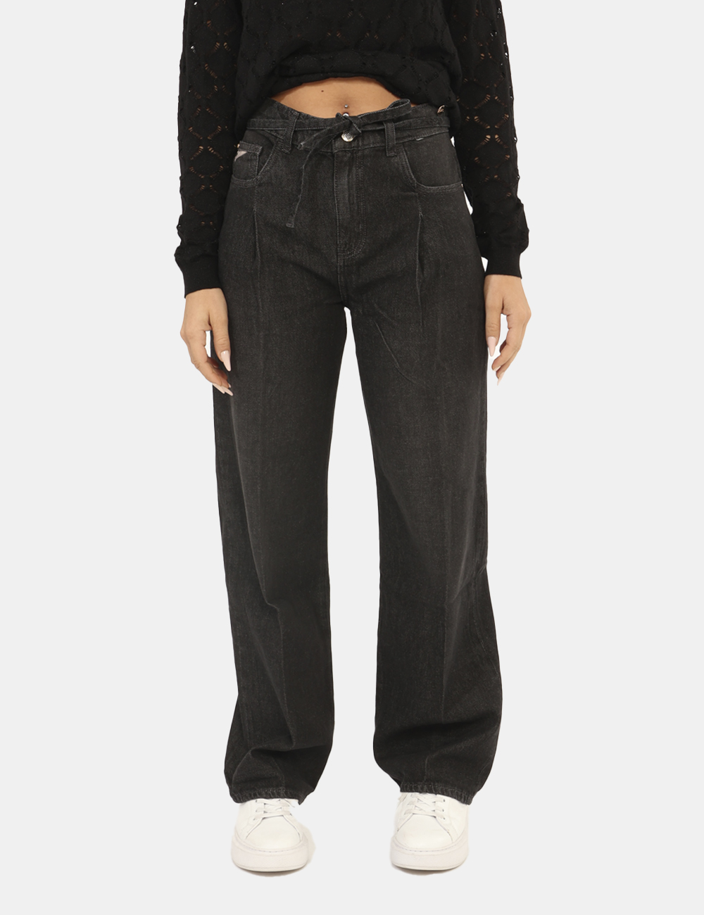 Jeans in total nero slavato, taglio morbido, tasche sagomate sul fronte e tasche a toppa sul retro. La vestibilità è morbida e pratica grazie a bottone più zip, e regolabile grazie a cinturetta in denim coordinata. I pantaloni sono adatti per occasioni casual e facilmente combinabili. Praticità e stile in un solo capo.