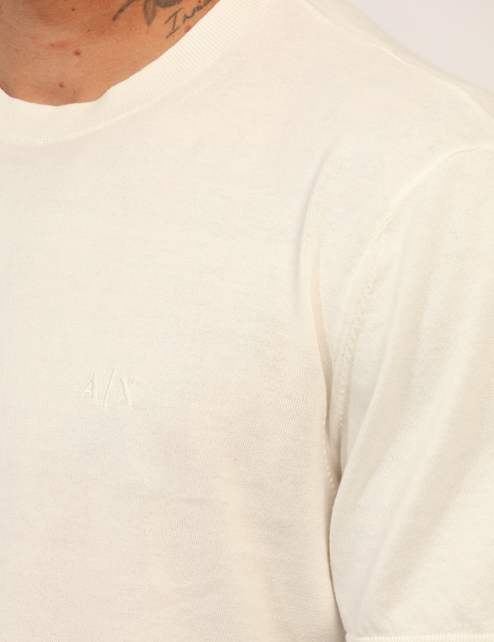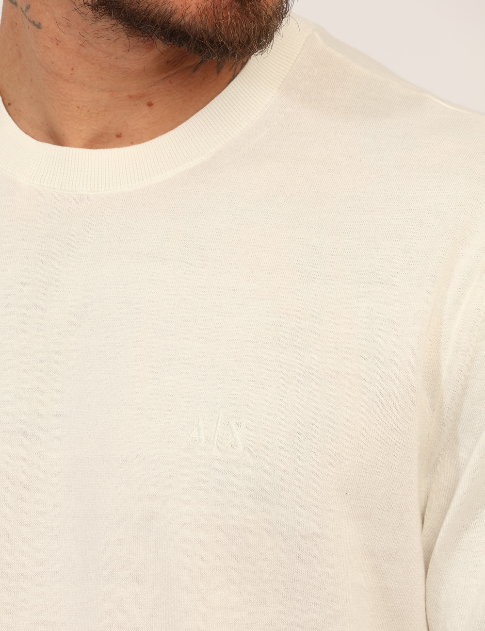 Questa maglia con girocollo presenta un logo Armani Exchange ricamato tono su tono, dettaglio discreto che valorizza il capo senza risultare eccessivo. Il colore bianco dona luminosità al look e permette di creare facilmente abbinamenti versatili, dal casual quotidiano a uno stile più curato.