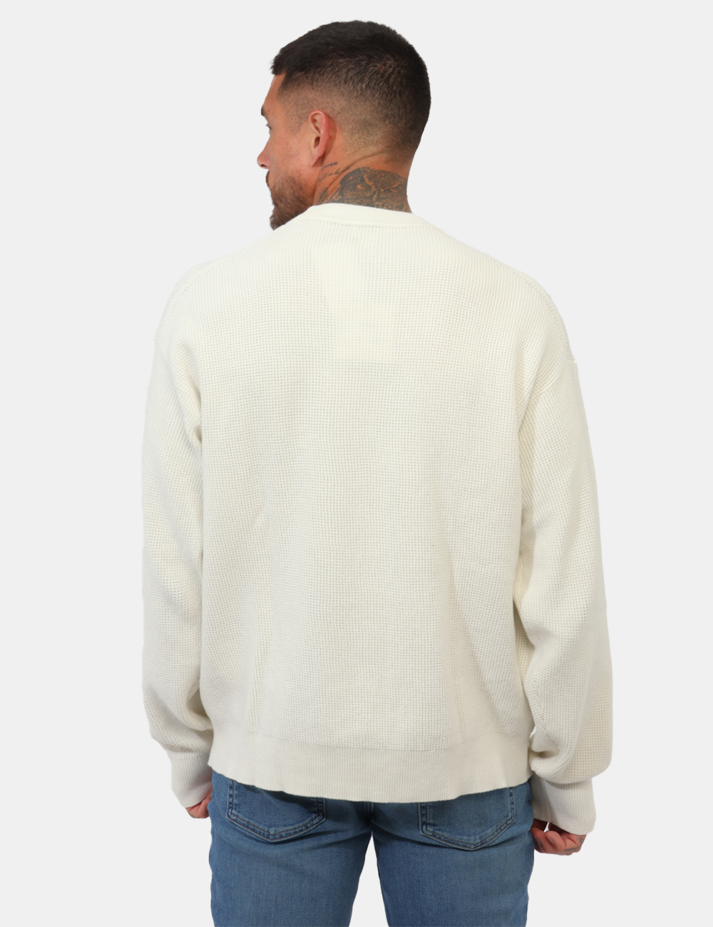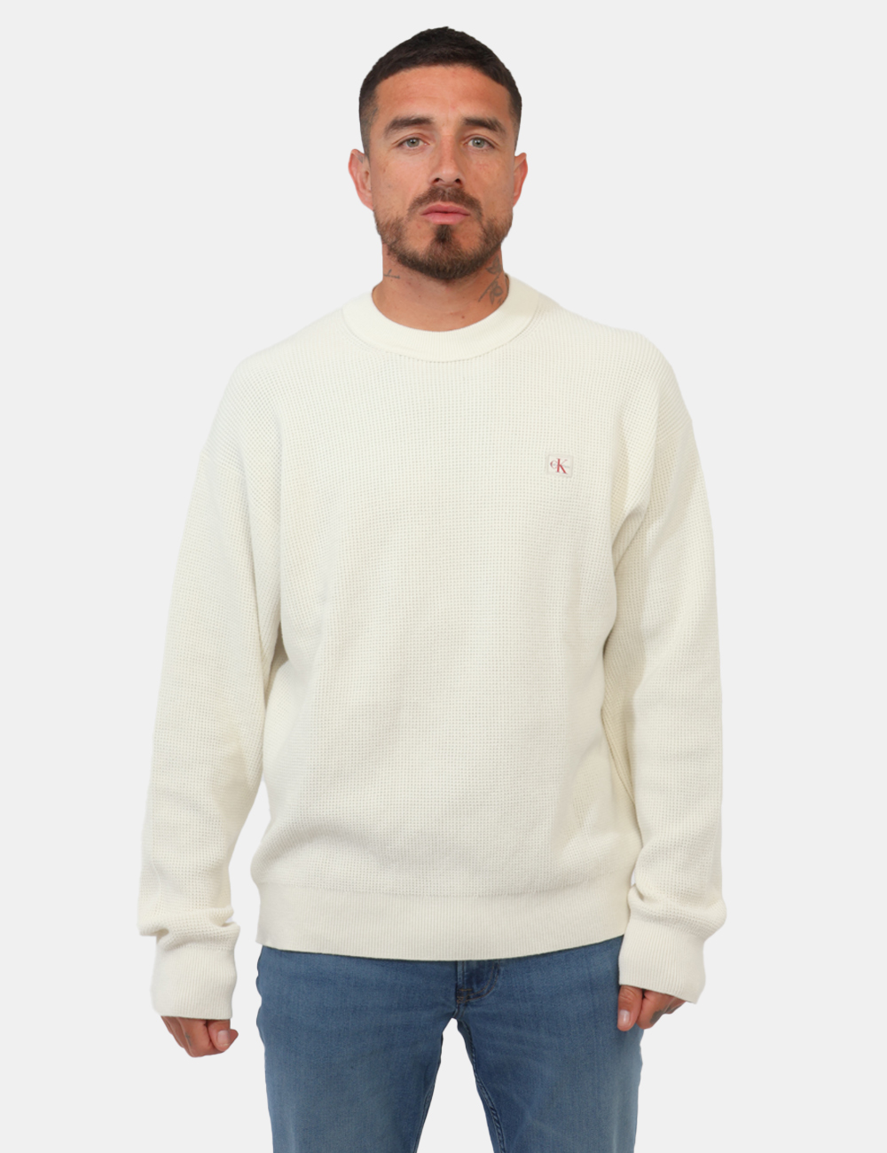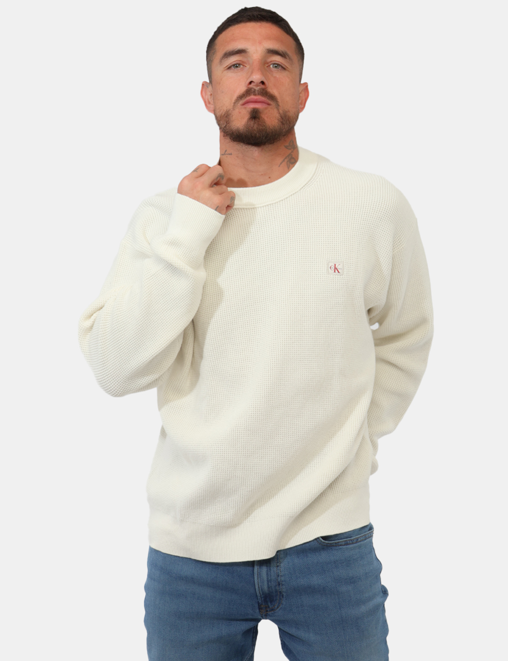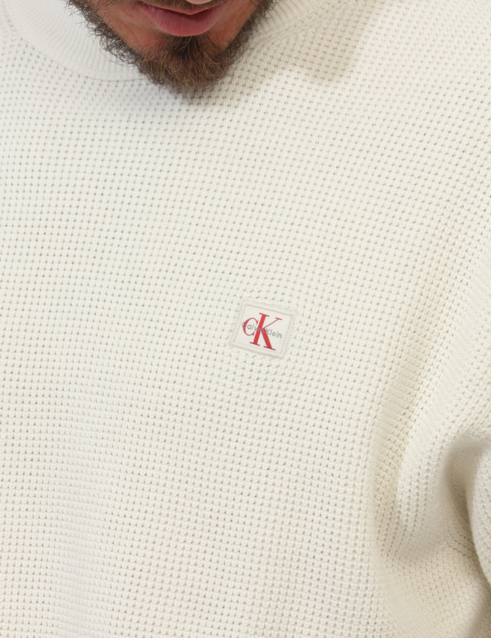 Il colore bianco, fresco e intramontabile, rende questa maglia con trama lavorata, patch ck applicato un elemento indispensabile nel guardaroba maschile.