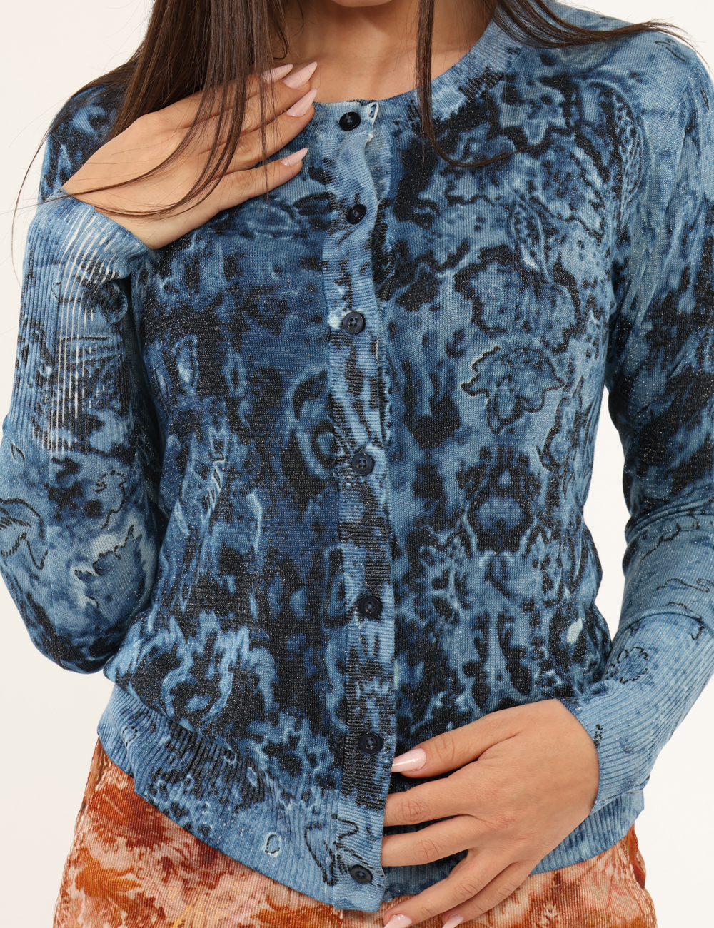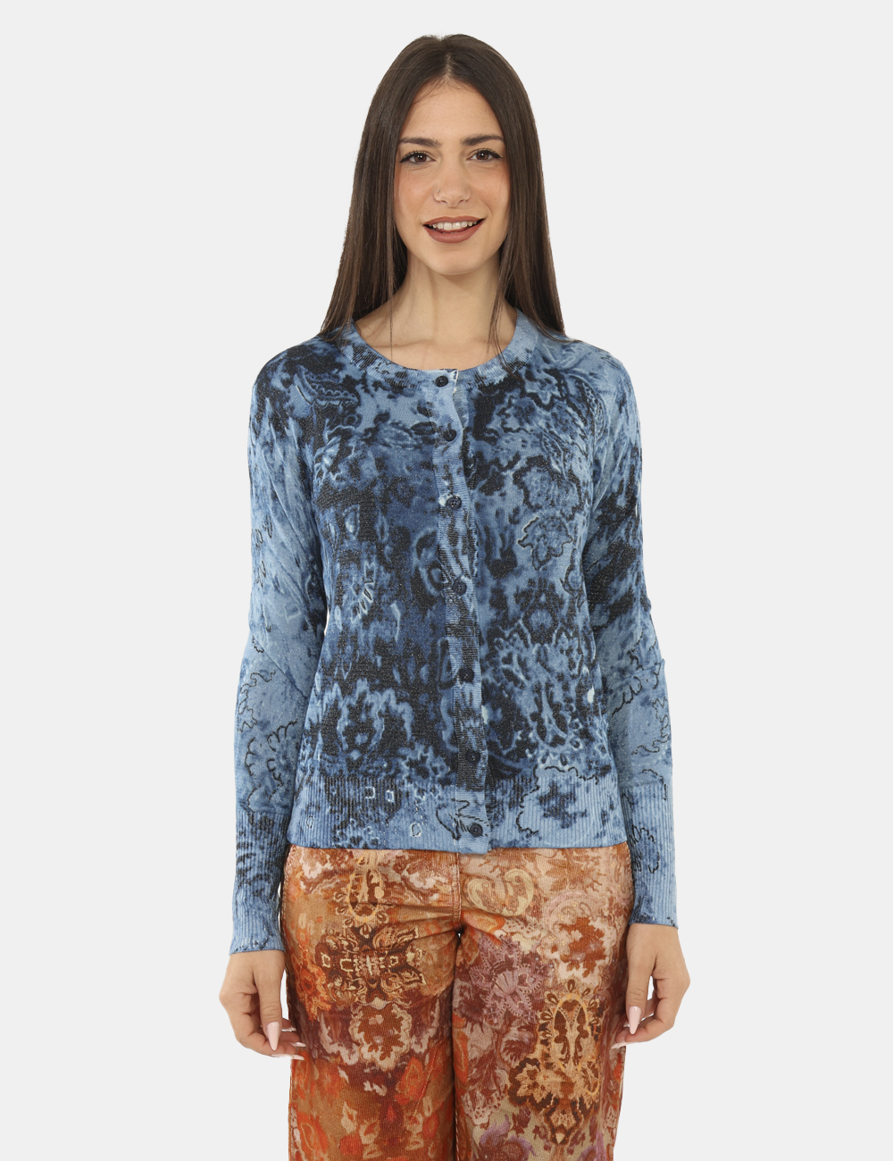 Maglioncino leggero modello cardigan, su fantasia azzurra e nera con filo lurex in tinta. La vestibilità è morbida e pratica grazie a bottoni ad asola in tinta. Il cardigan è adatto per occasioni casual e facilmente combinabile. Indossalo per spiccare con stile.