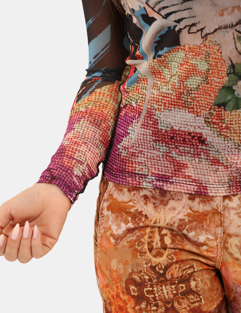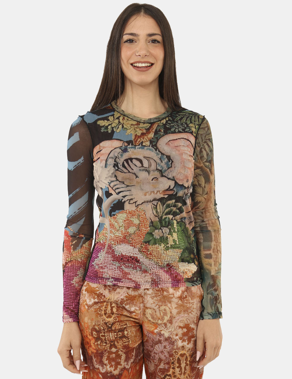 Maglia velata a maniche lunghe in fantasia tendente al verde e al marrone. La vestibilità è morbida e regolare. La maglia è adatta per occasioni casual. Indossala per spiccare con stile.