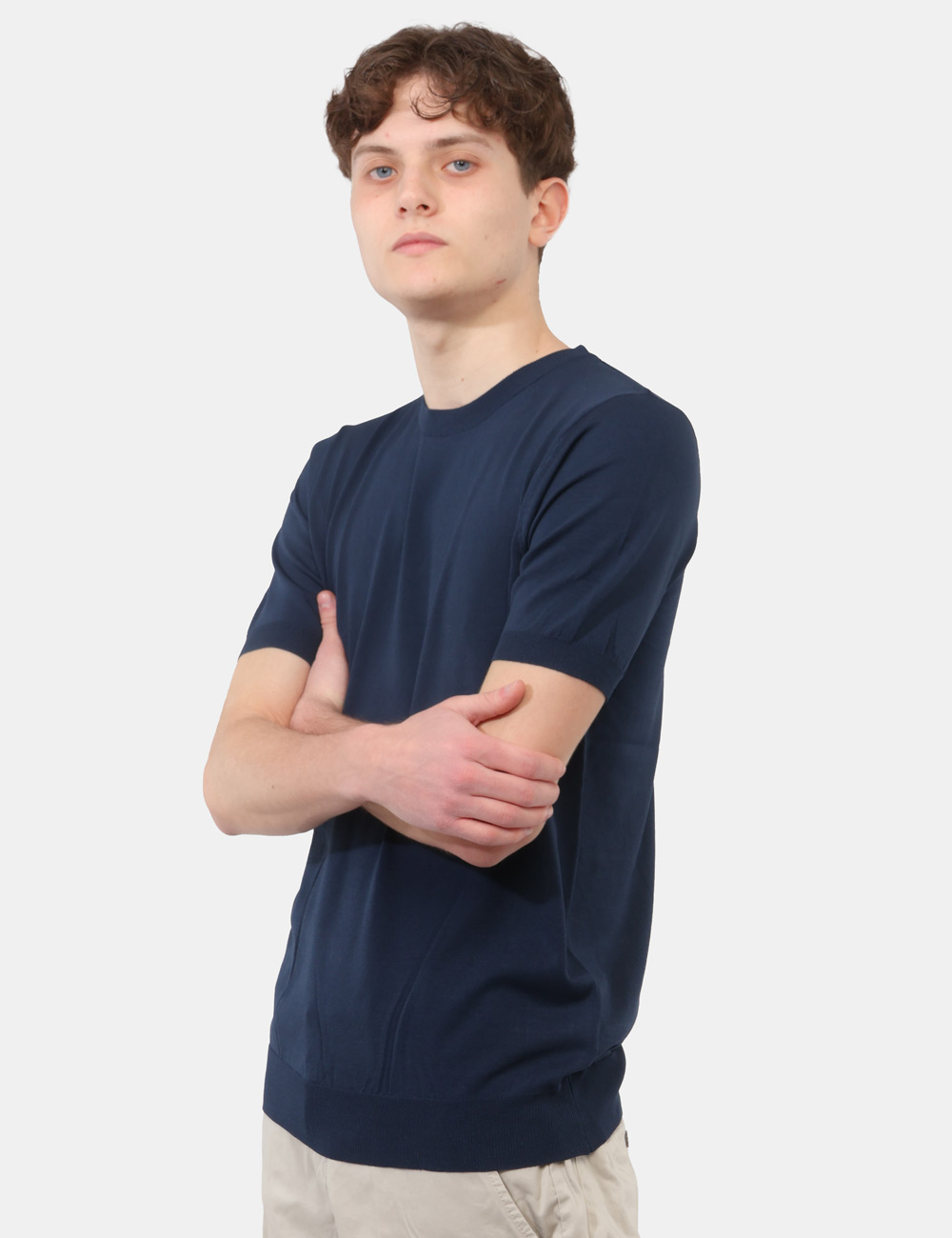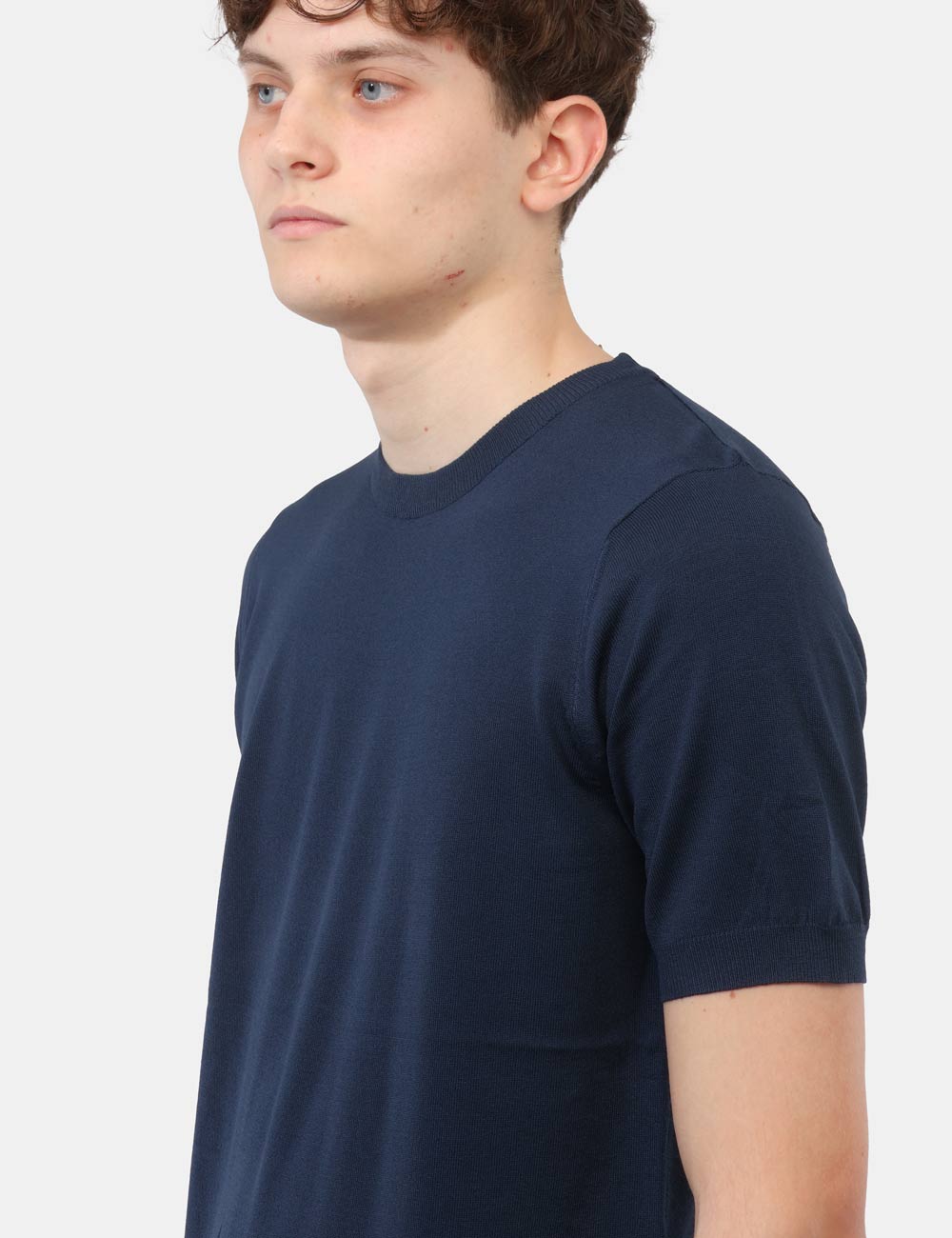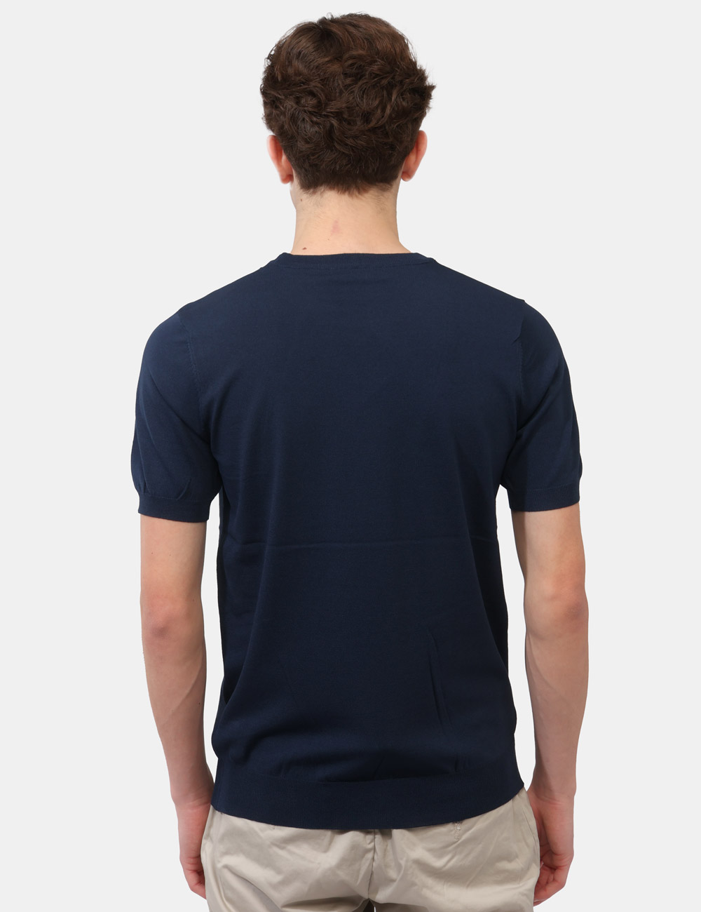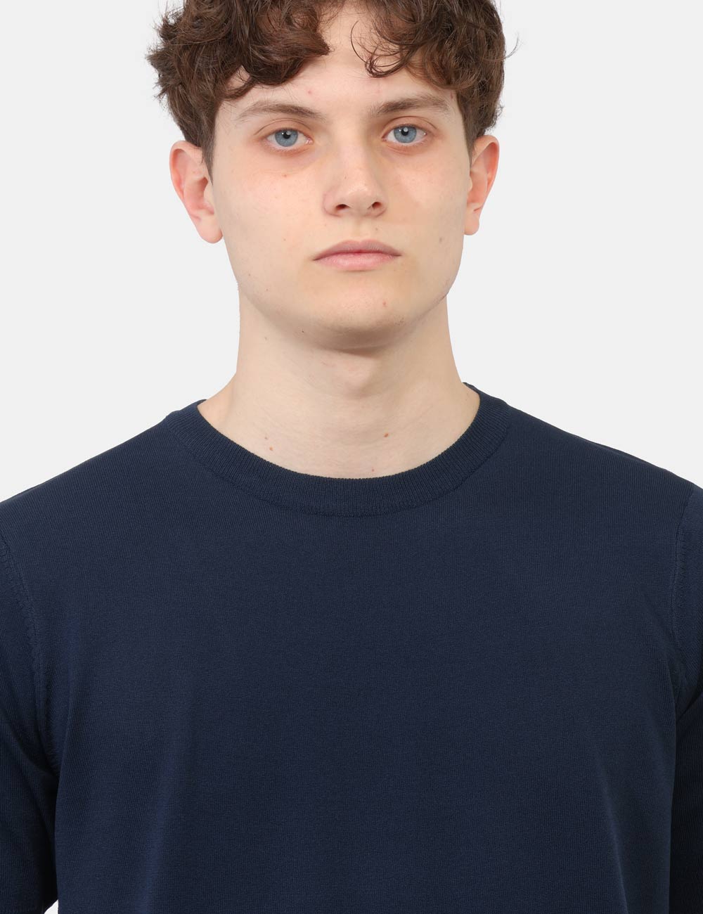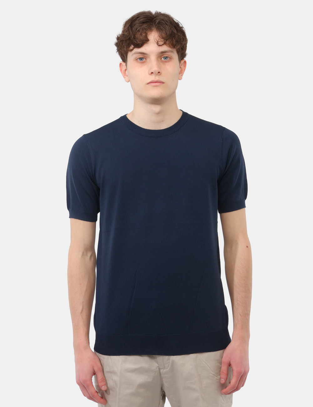La maglia con girocollo, fondo e giromanica a costine si distingue per i suoi dettagli curati, che garantiscono una linea pulita e un fit confortevole. Il colore blu aggiunge profondità ed eleganza, rendendola facilmente abbinabile e perfetta per creare outfit equilibrati, dal casual al più ricercato. La vestibilità è regolare: il modello è alto 187 cm e indossa la taglia L, confermando un fit comodo e ben proporzionato.