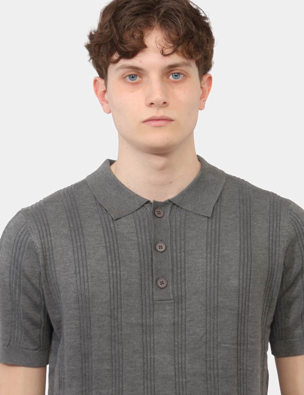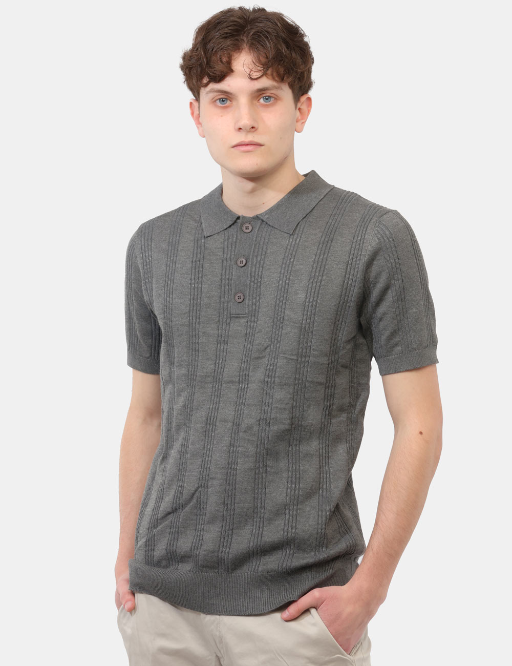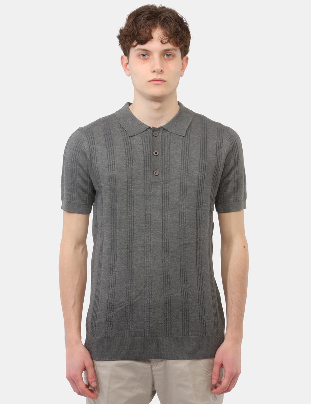 La maglia con collo a polo, trama lavorata e bottoni si distingue per i suoi dettagli ricercati, che donano profondità e carattere al design senza risultare eccessivi. Il colore grigio aggiunge un tocco sobrio e versatile, perfetto per creare abbinamenti equilibrati e sempre attuali. La vestibilità è regolare: il modello è alto 187 cm e indossa la taglia L, garantendo un fit comodo e ben proporzionato.