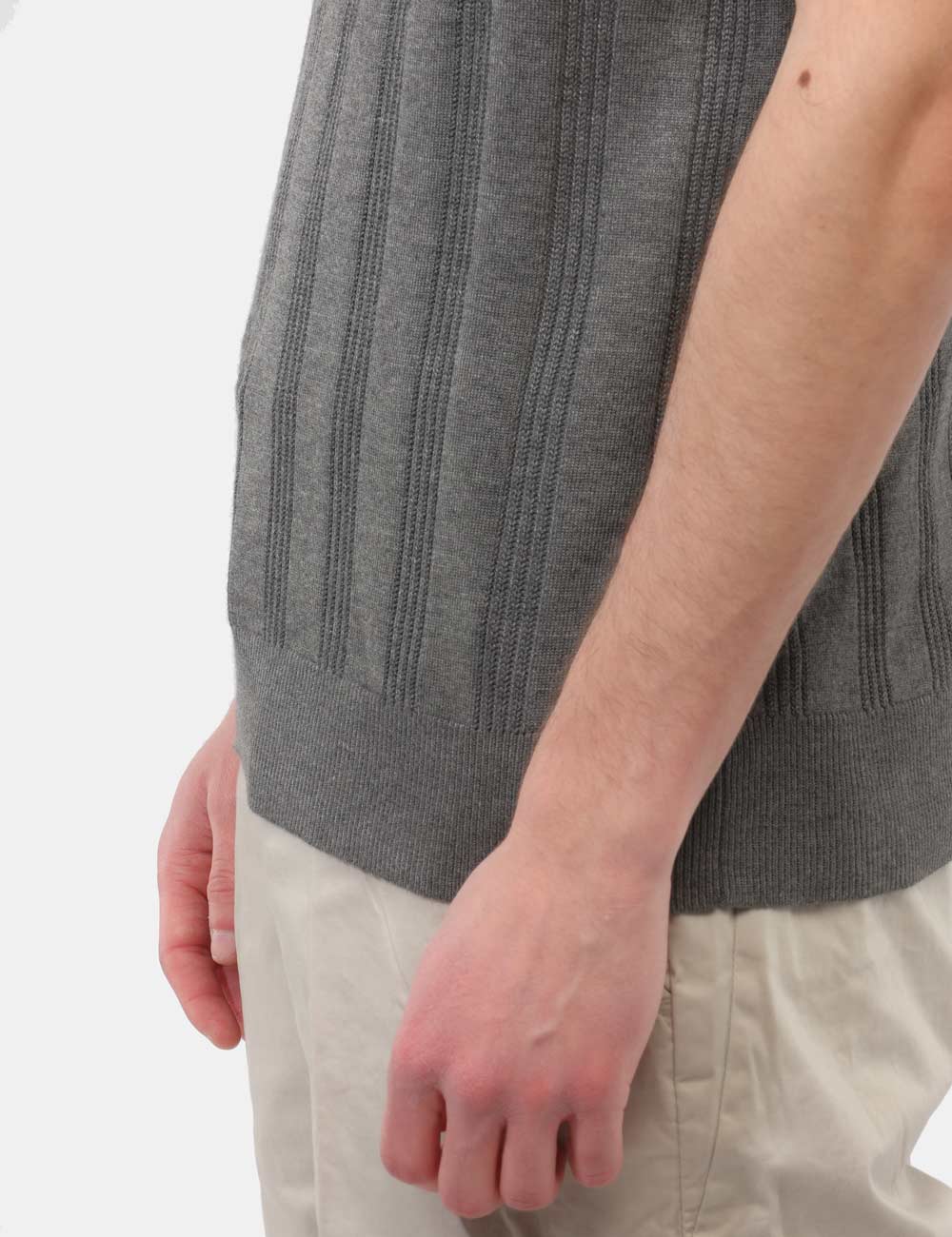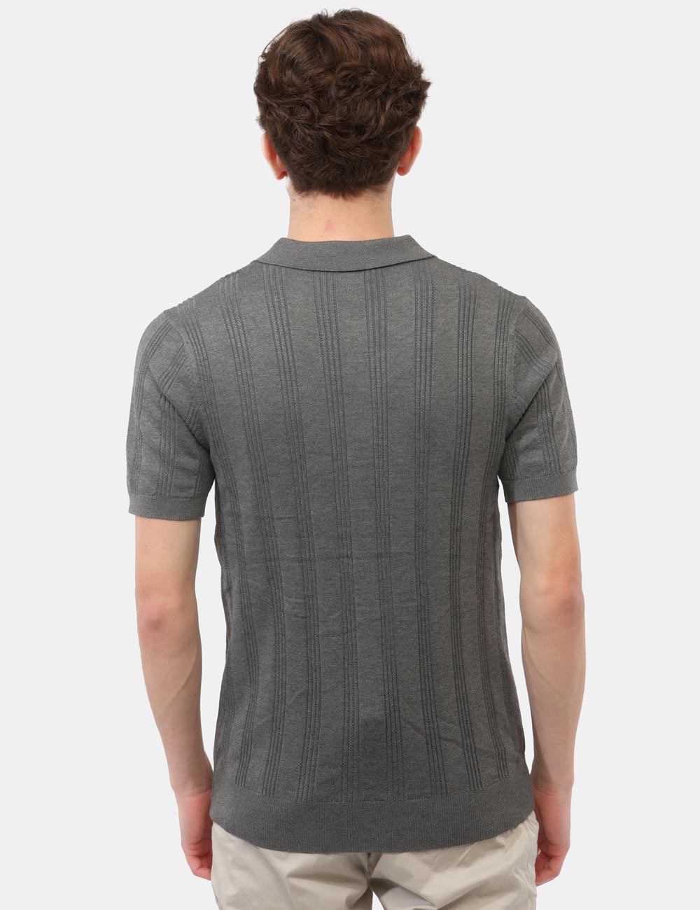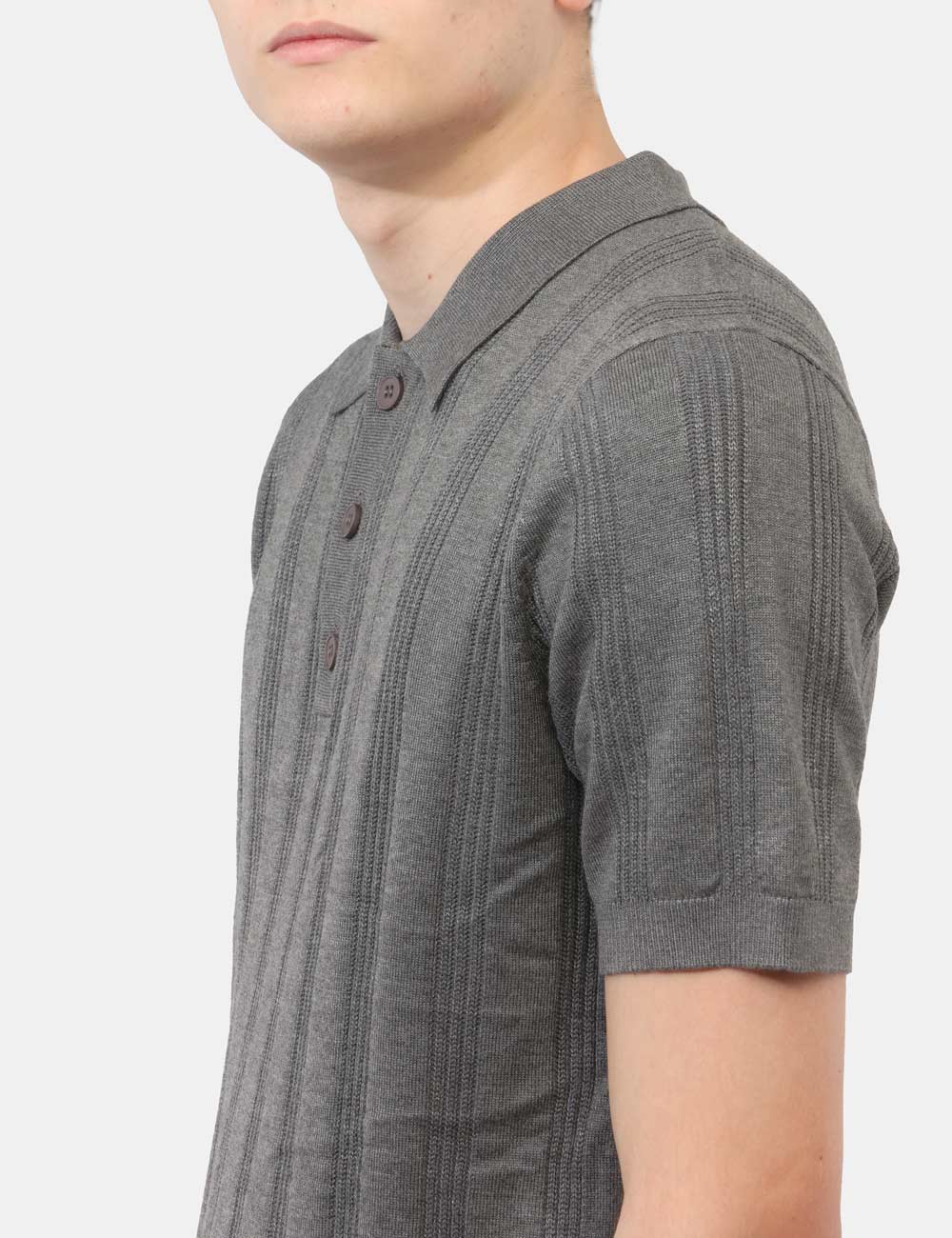 La maglia con collo a polo, trama lavorata e bottoni si distingue per i suoi dettagli ricercati, che donano profondità e carattere al design senza risultare eccessivi. Il colore grigio aggiunge un tocco sobrio e versatile, perfetto per creare abbinamenti equilibrati e sempre attuali. La vestibilità è regolare: il modello è alto 187 cm e indossa la taglia L, garantendo un fit comodo e ben proporzionato.