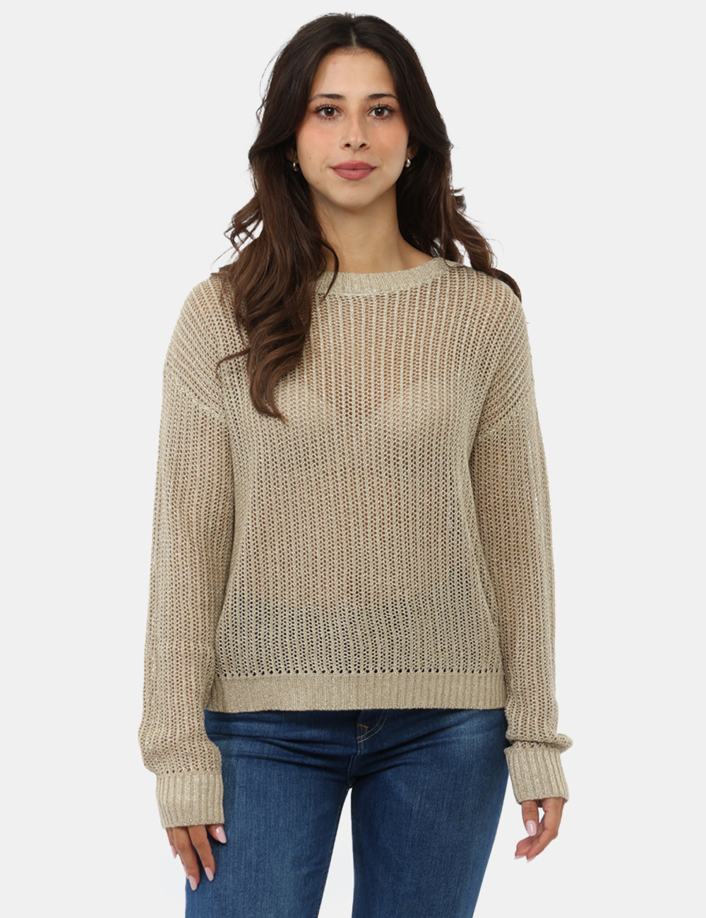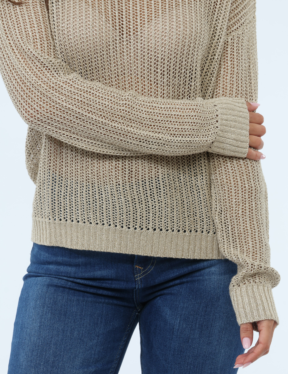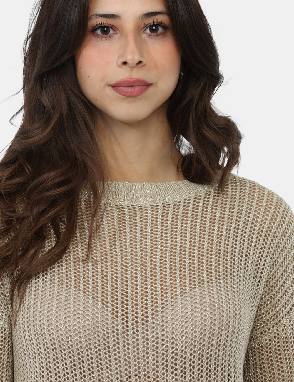 Questa maglia da donna adatta alla primavera estate si distingue per la sua lavorazione traforata e il delicato filato argento, dettagli che creano un effetto luminoso e sofisticato, aggiungendo profondità e carattere al capo senza risultare eccessivo. Il colore beige dona un tocco caldo e versatile, facilmente abbinabile a diverse palette. La vestibilità è regolare e valorizza la silhouette con naturalezza. La modella è alta 172 cm e indossa la taglia S.